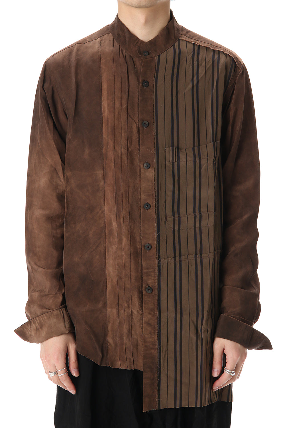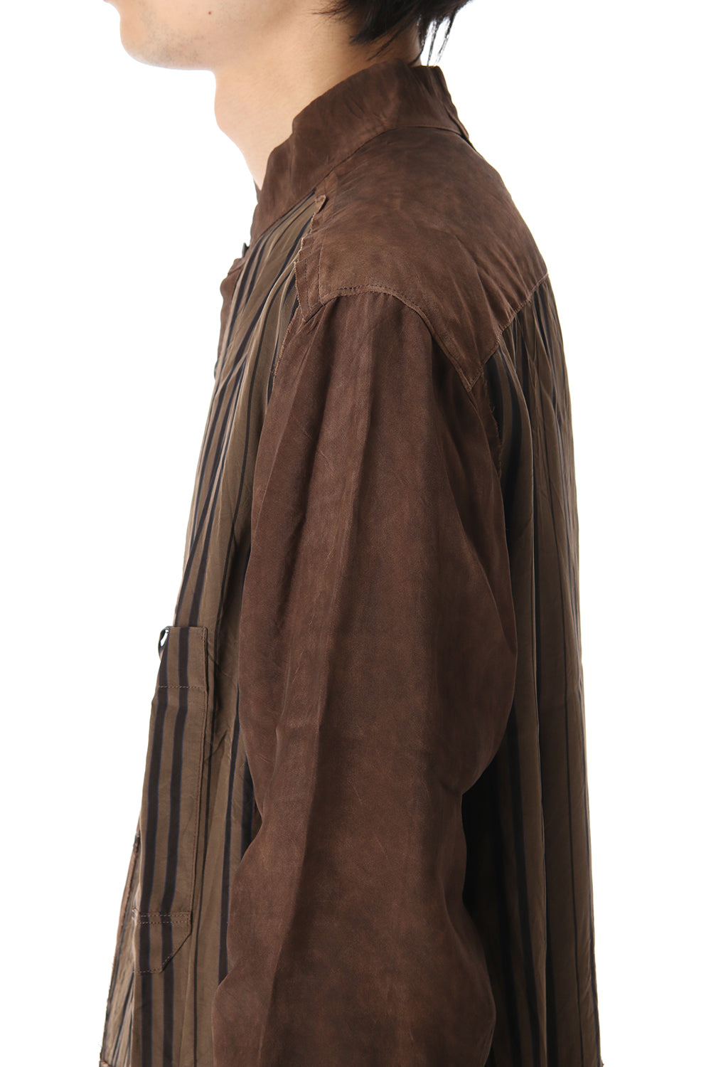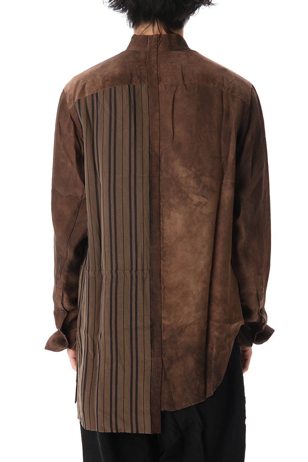 This is a collarless shirt with details that looks as if three types of Viscose fabric are combined into one shirt. The cut-off design is applied everywhere, creating a small, familiar texture like vintage wear. The cuffs are slightly wider like the turn-up cuffs.