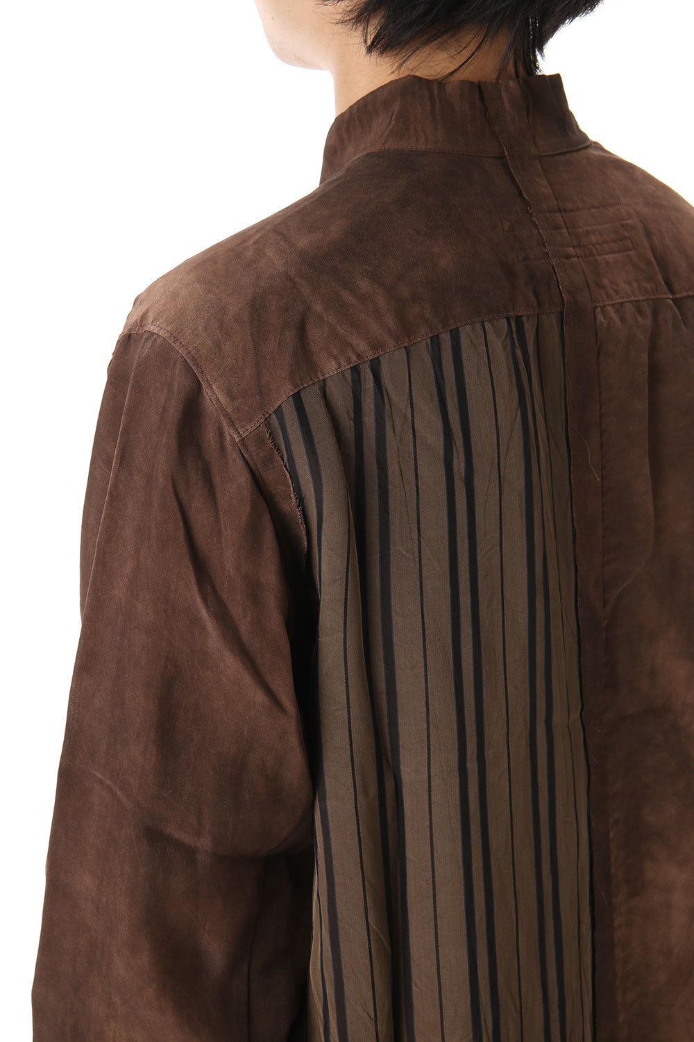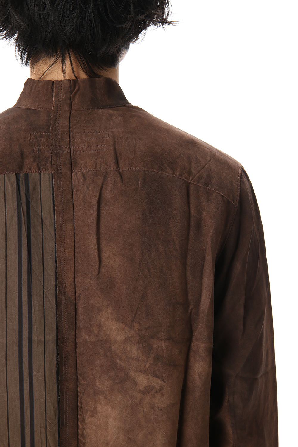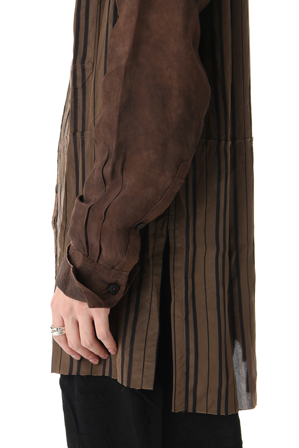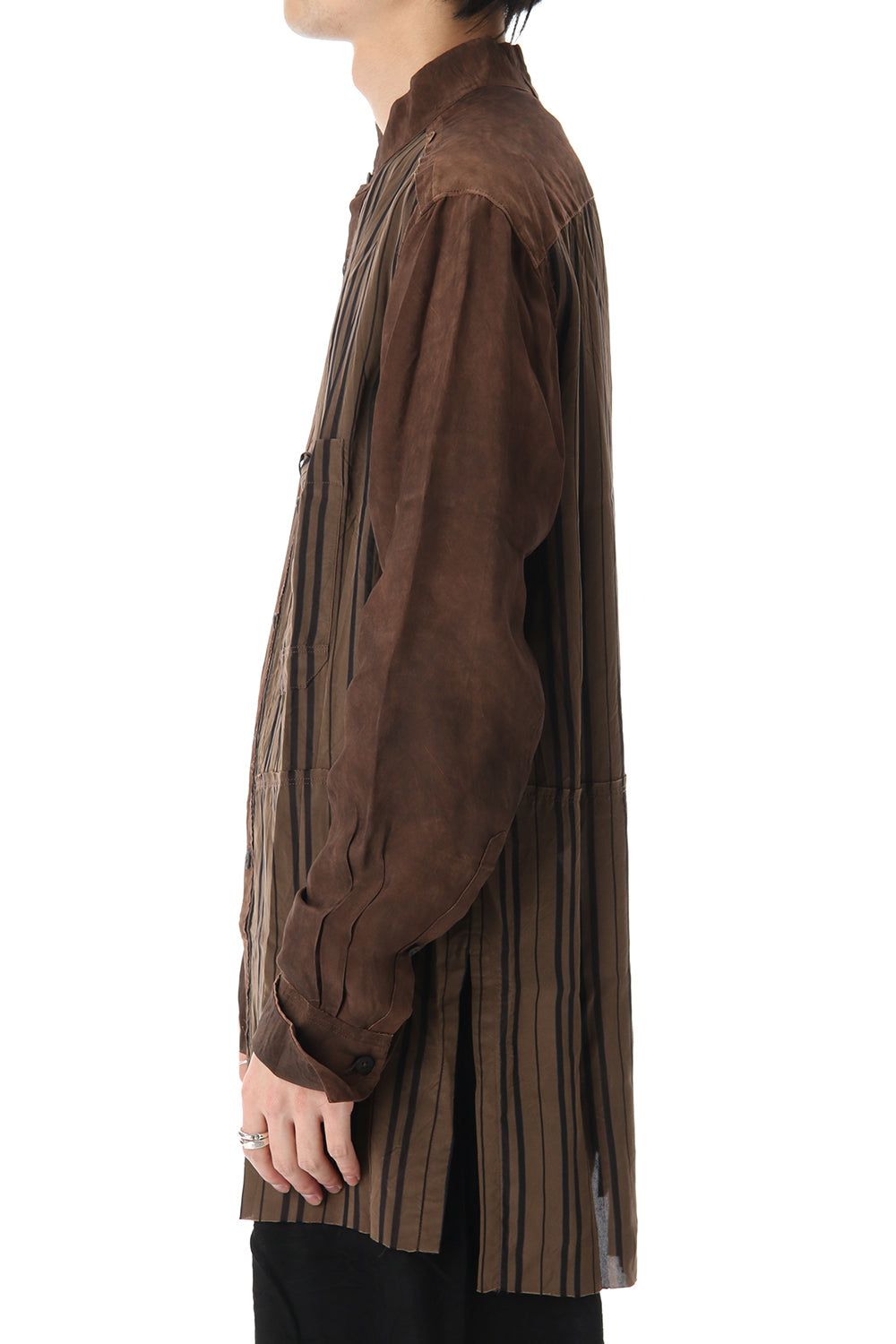 This is a collarless shirt with details that looks as if three types of Viscose fabric are combined into one shirt. The cut-off design is applied everywhere, creating a small, familiar texture like vintage wear. The cuffs are slightly wider like the turn-up cuffs.