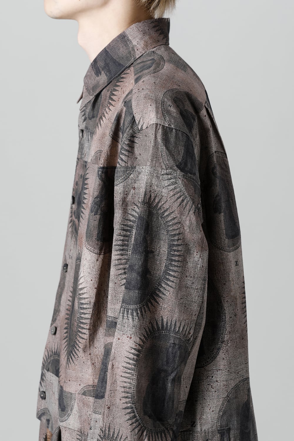 This cotton print shirt is characterized by its loose fit pattern print. The front has seven buttons and the cuff can be opened and closed with buttons, so you can roll them up. The print pattern is based on an ancient Chinese scholar. The front body and left side of this shirt has details that can be peeled off by opening and closing some buttons, symbolizing the 22 SS. Tighten the buttons for asymmetry. This shirt is made of dry and lightweight cotton fabric and can be worn even in the hot season.