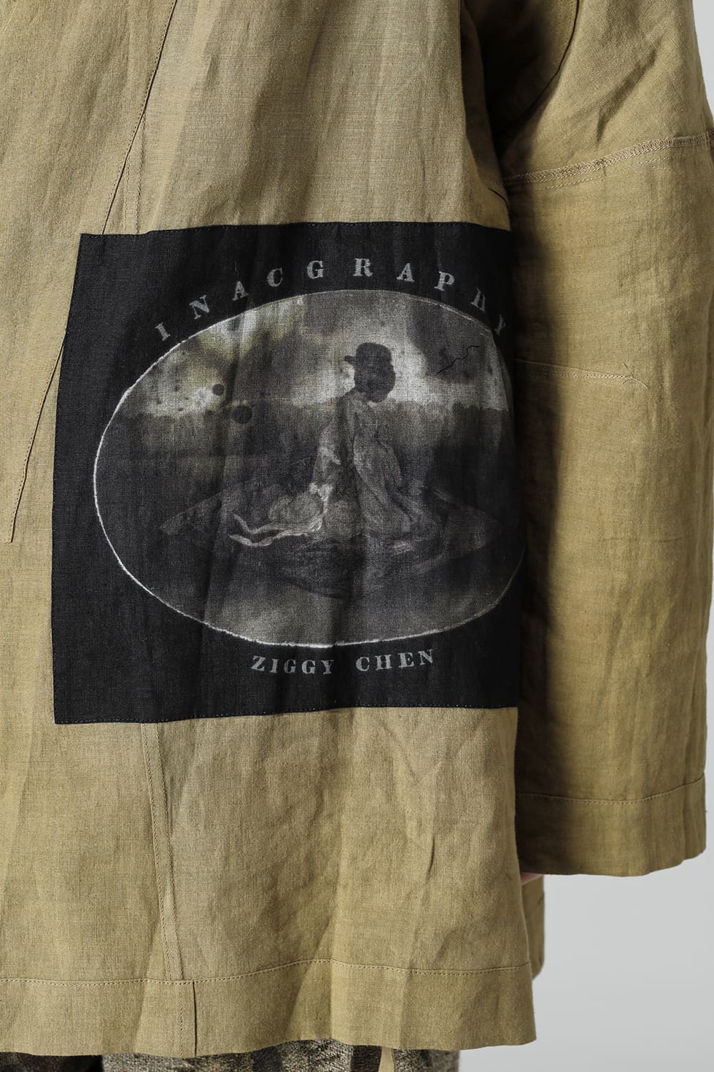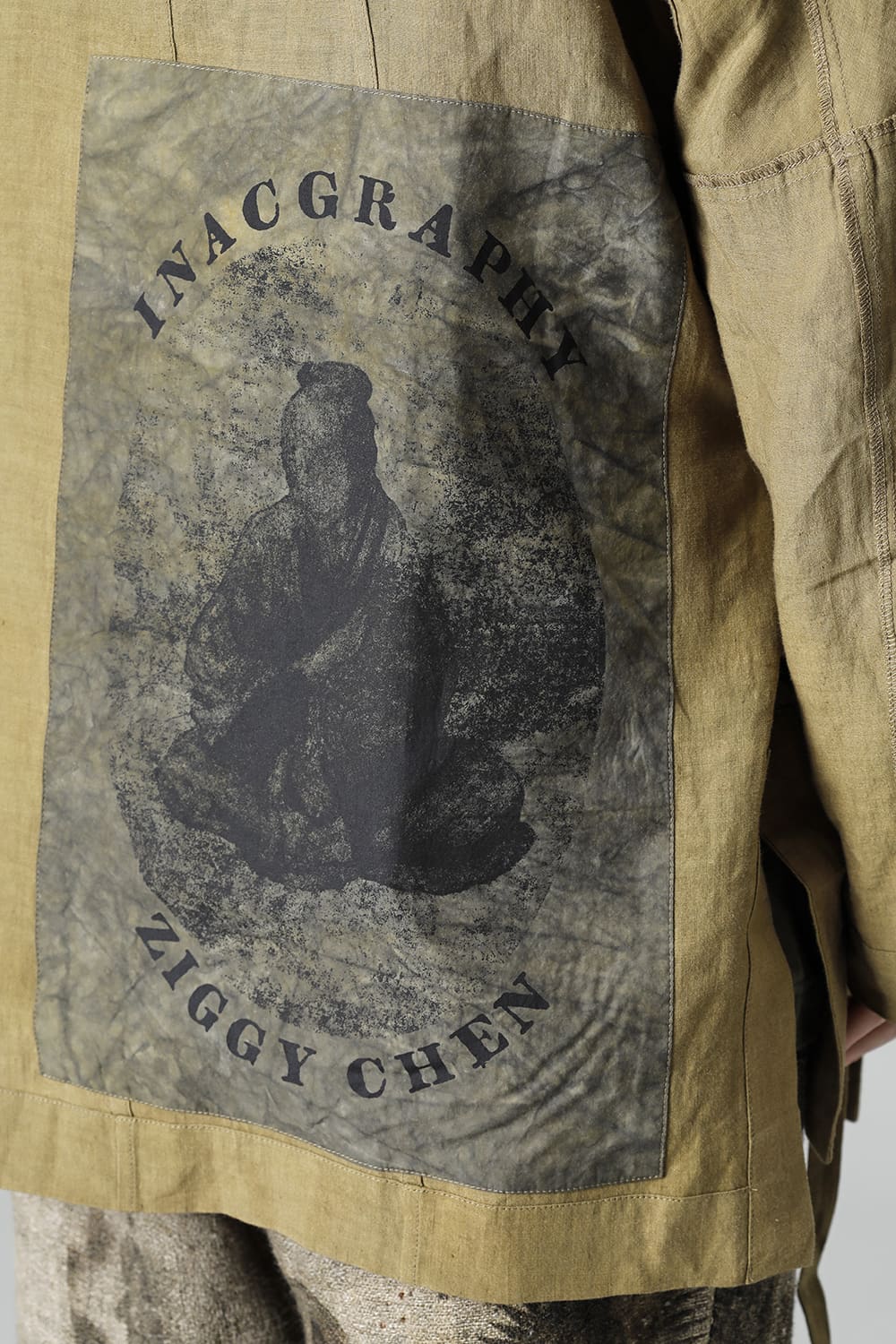 This model was originally a short robe made of black linen viscose fabric, but was changed to a Bronze color hand dye linen fabric as a special order item number of FASCINATE. As for the shape, it is a double robe shirt based on traditional Oriental hanbok and kimono, which is an antique shape at first glance, but the sleeves have a one-piece raglan sleeve pattern taken from the fabric of the body, the gusset pattern taken from different cloth under the sides, and the modern and beautiful pattern work is also characteristic. The inside is decorated with a patchwork design with a graphic print that expresses a collage of unrelated materials and reconstructions of mysterious figures that appear in classical Chinese paintings and religious iconography that ZIGGY CHEN has been in contact with since his childhood. This is a detail with the message of ZIGGY CHEN's antithesis to the modern fashion scene where social media has become the mainstream by hiding the design inside and only the appearance on the surface is emphasized. In this convenient world where online shopping has developed and people can enjoy shopping without visiting from anywhere in the world, you feel that shopping has become tasteless and have no hesitation about giving up your clothes. Therefore, in the days when shopping methods were more analogue, we wanted people to enjoy "the feeling of visiting and buying a store to find a rare item that can only be bought at that store", so we devised this model to make a special order model that can only be bought at FASCINATE, and the ZIGGY CHEN team cooperated with us. Limited items can be simply a feeling of exaltation to get a limited number of items, but they will become memorable items that will make you feel reluctant to give up even in a world where you can easily buy and sell clothes by yourself.