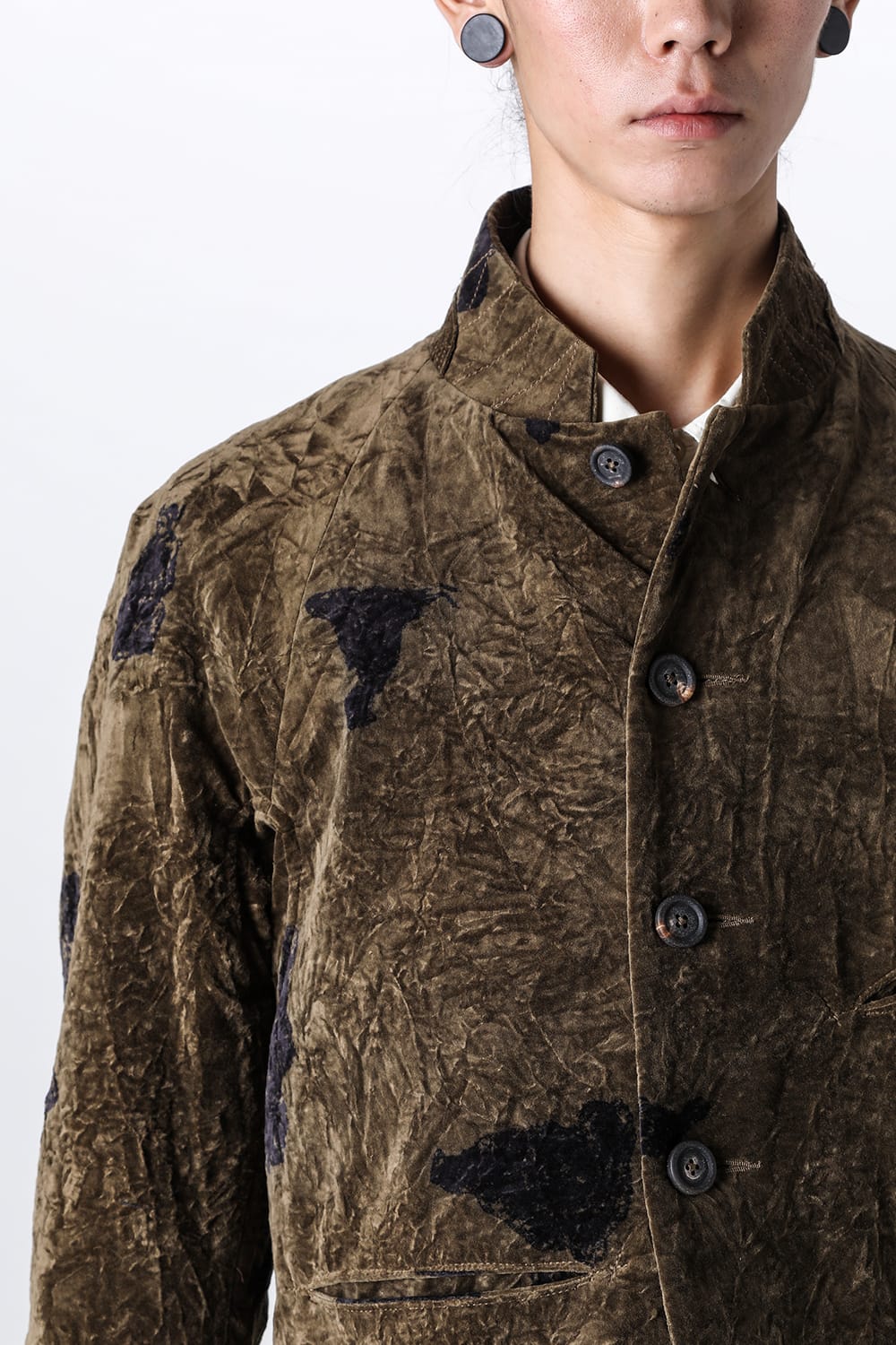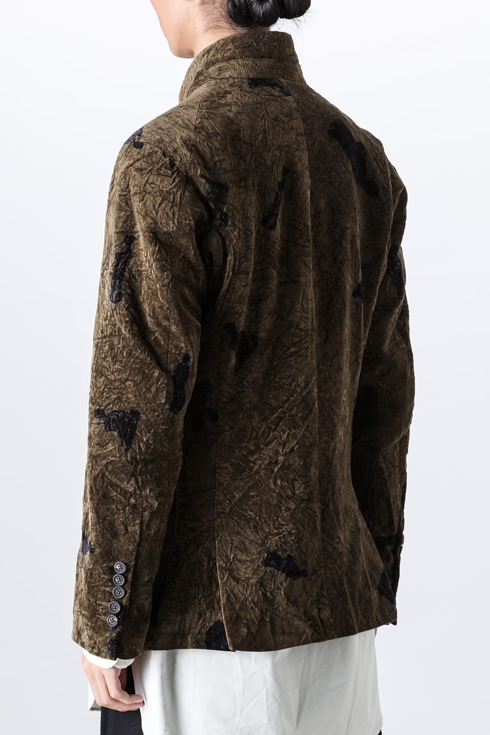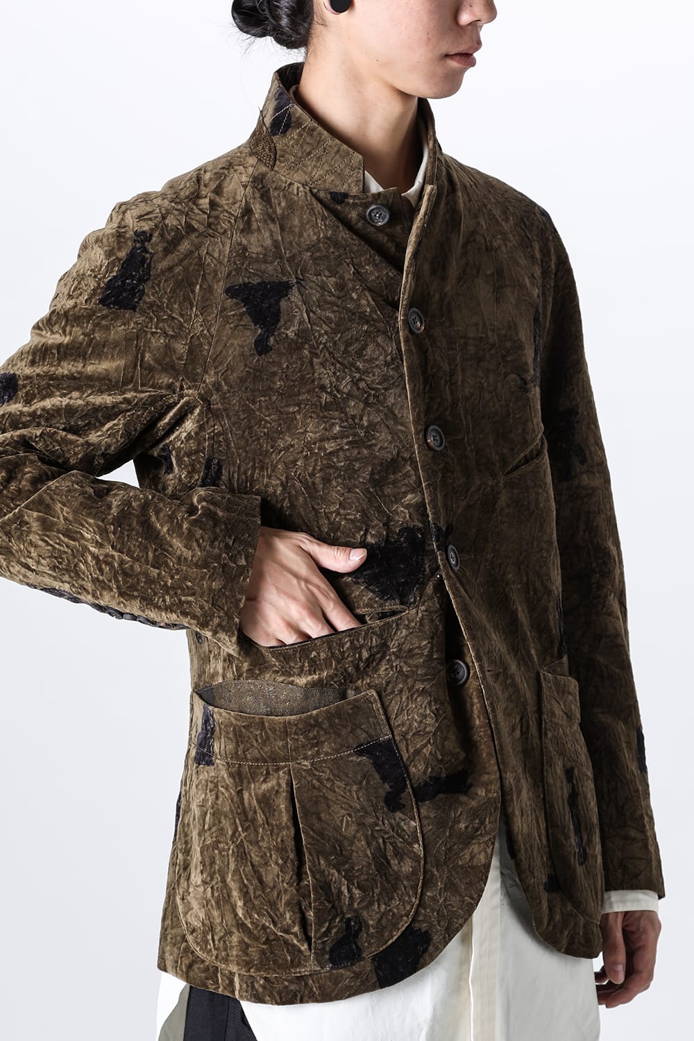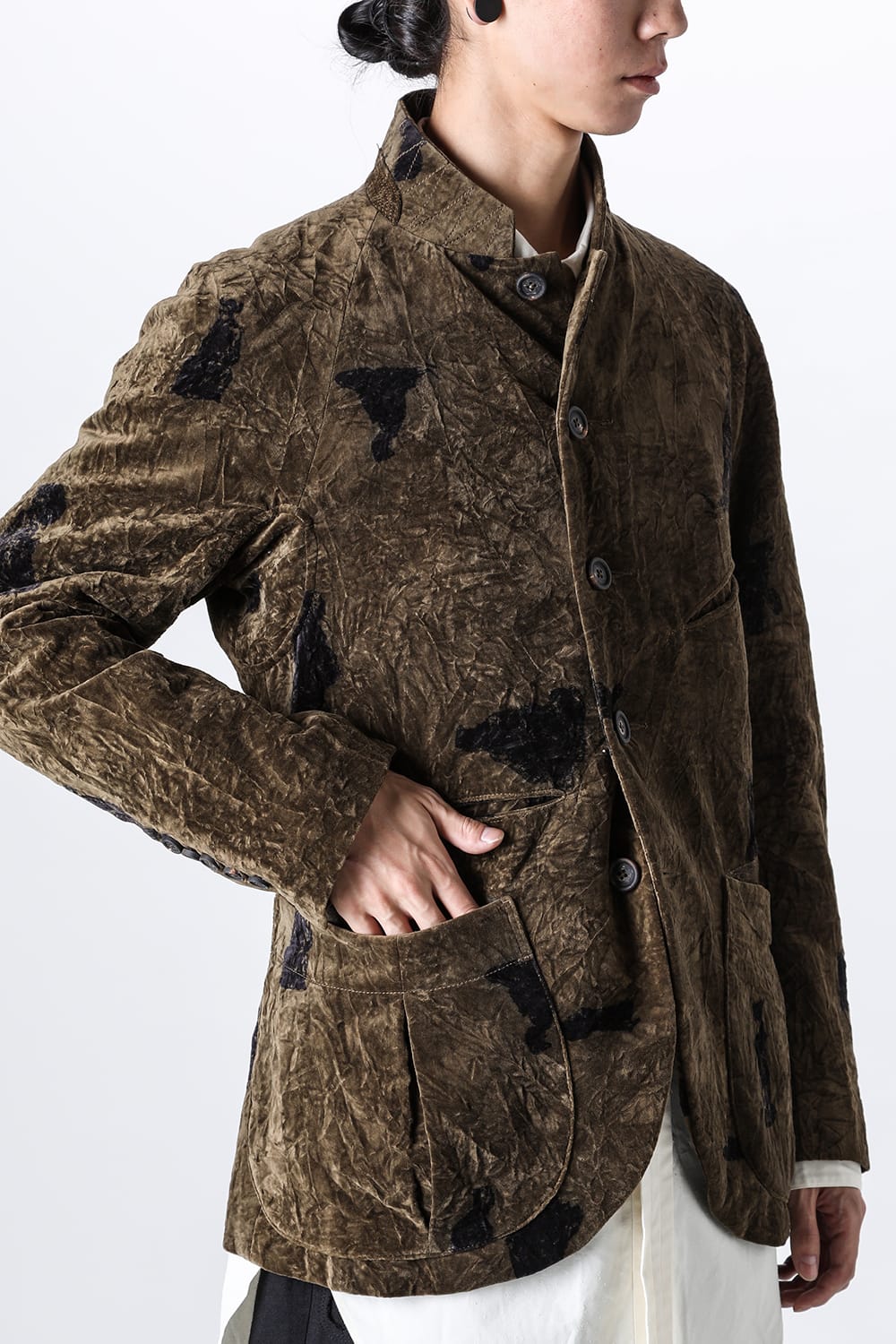 This stand-up collar jacket is made of a wrinkled velvet fabric, a fabric that was particularly eye-catching in the Paris installation of the 23-24 AW collection.