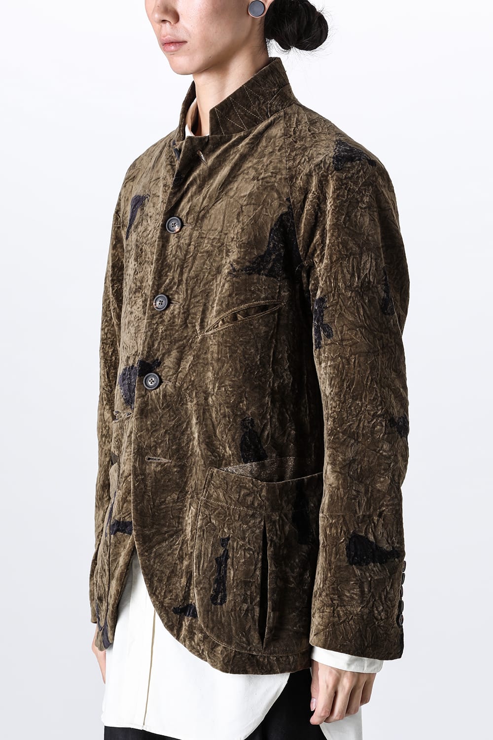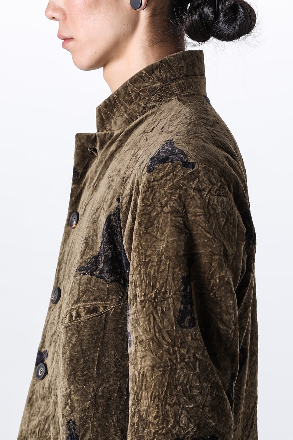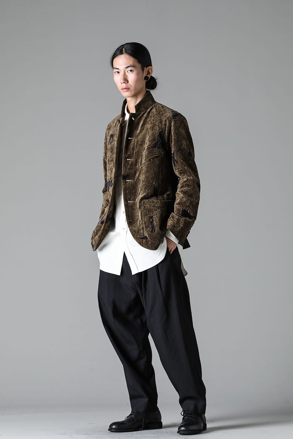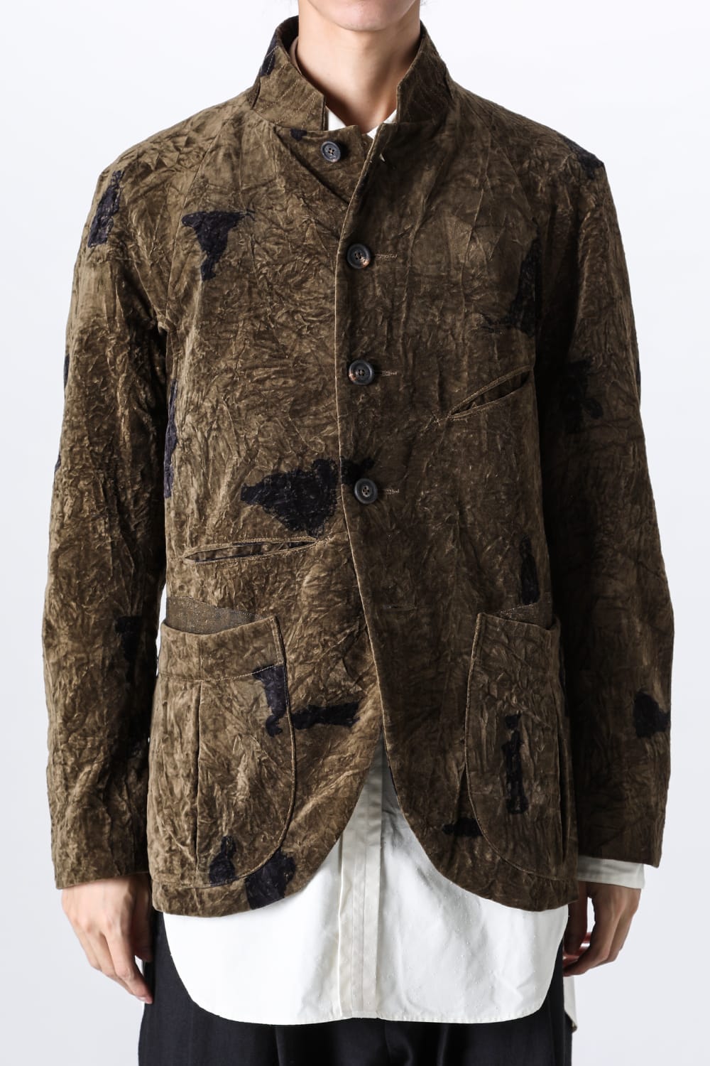 This stand-up collar jacket is made of a wrinkled velvet fabric, a fabric that was particularly eye-catching in the Paris installation of the 23-24 AW collection.