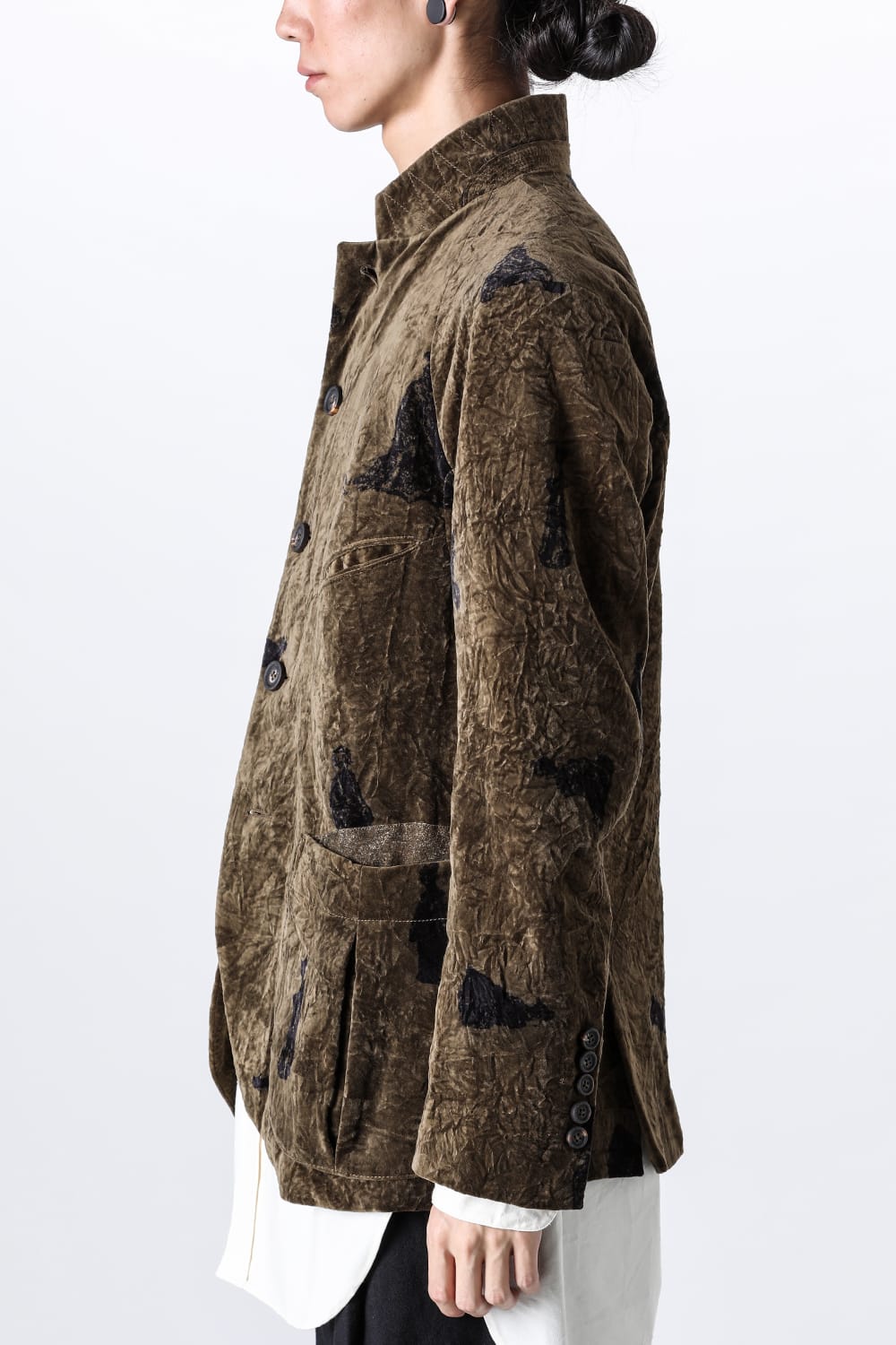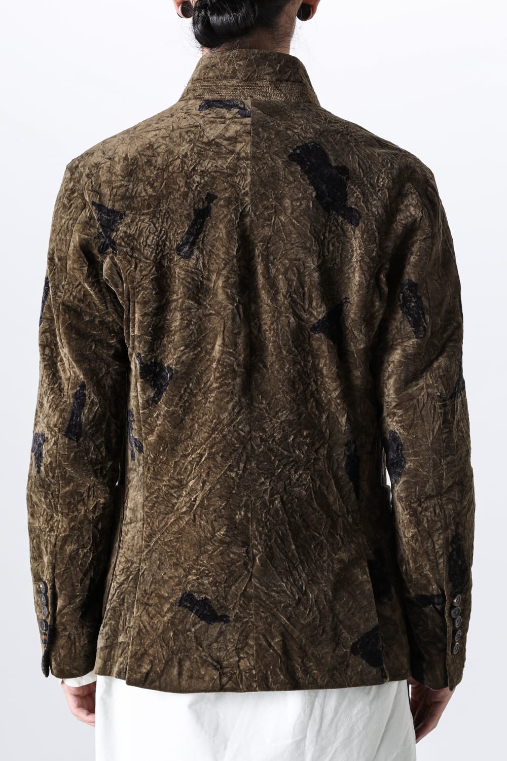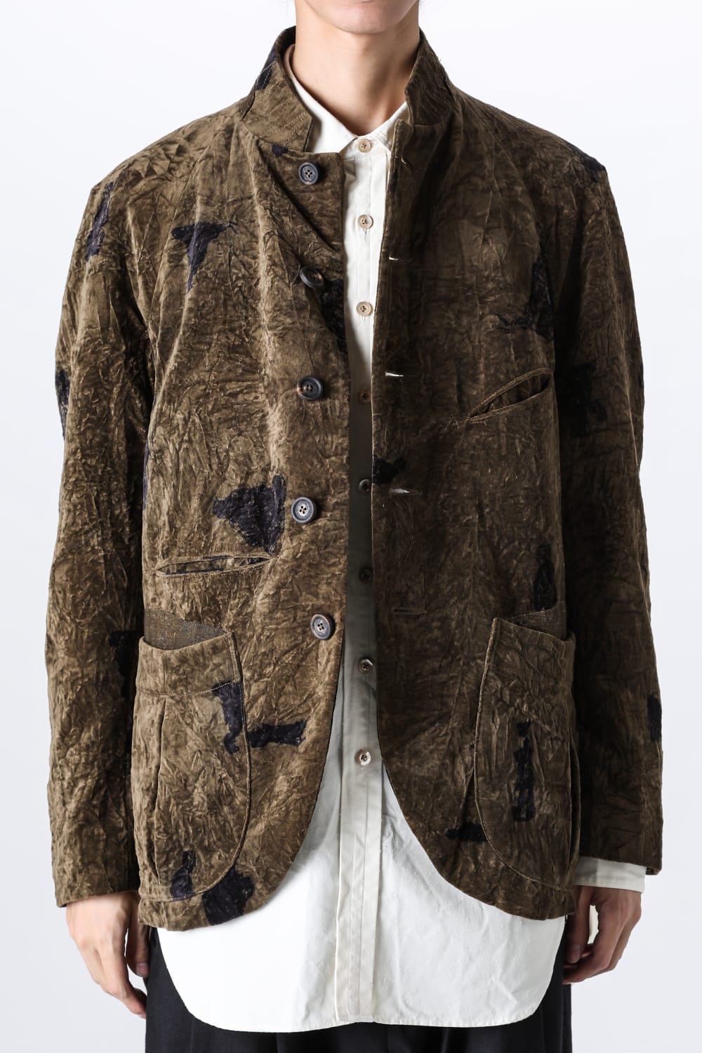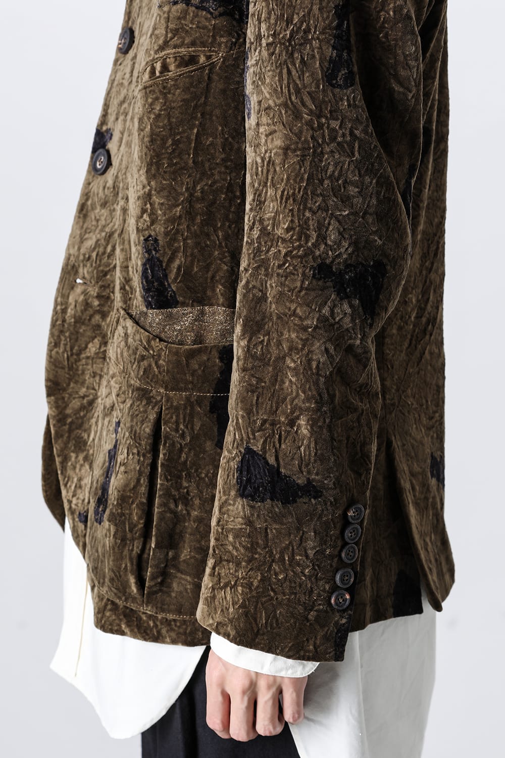 This stand-up collar jacket is made of a wrinkled velvet fabric, a fabric that was particularly eye-catching in the Paris installation of the 23-24 AW collection.