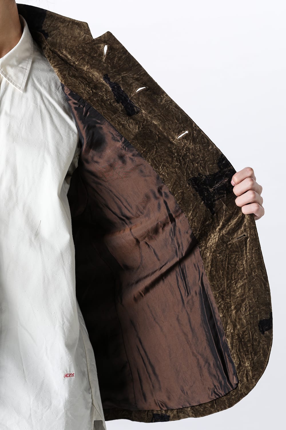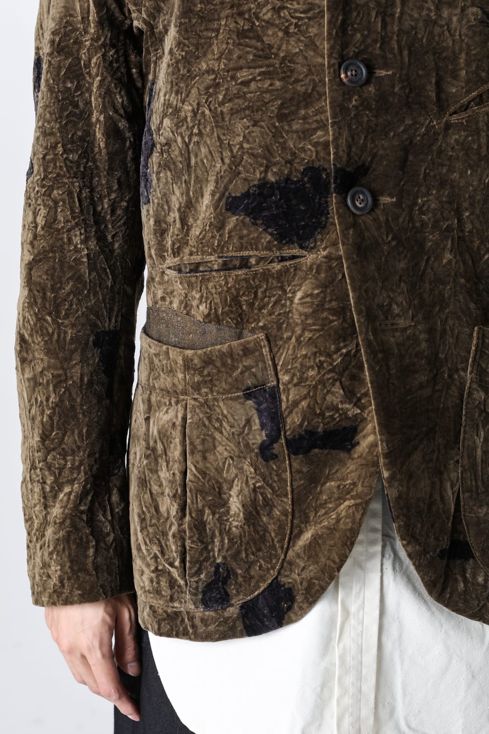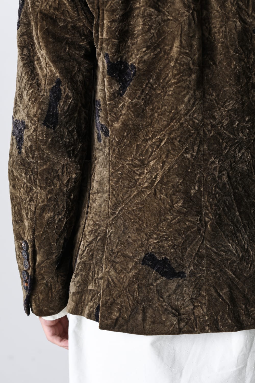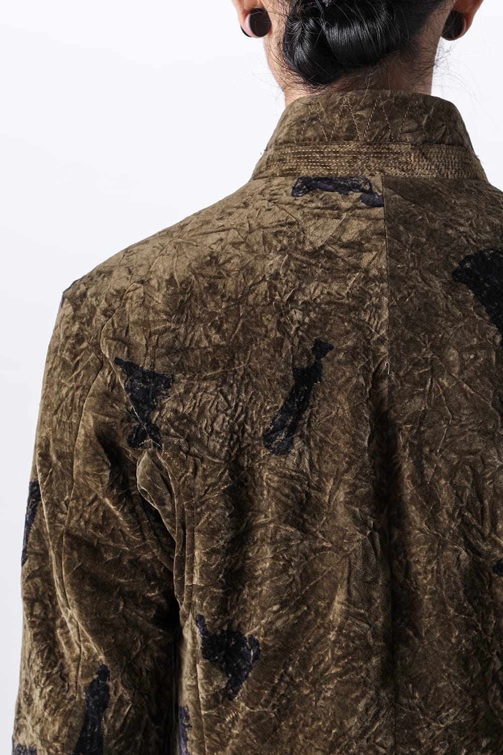 This stand-up collar jacket is made of a wrinkled velvet fabric, a fabric that was particularly eye-catching in the Paris installation of the 23-24 AW collection.