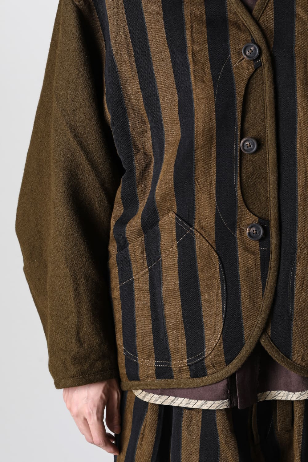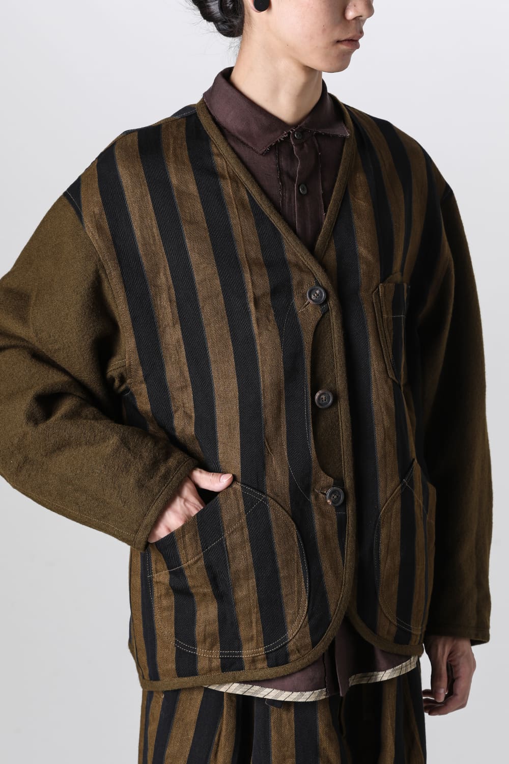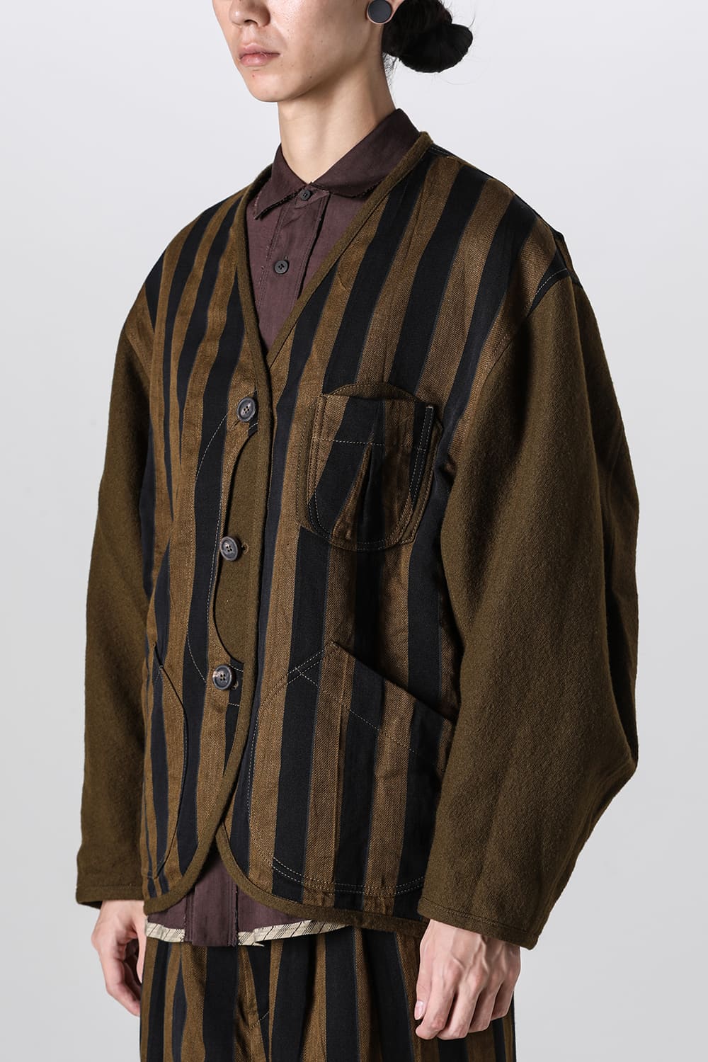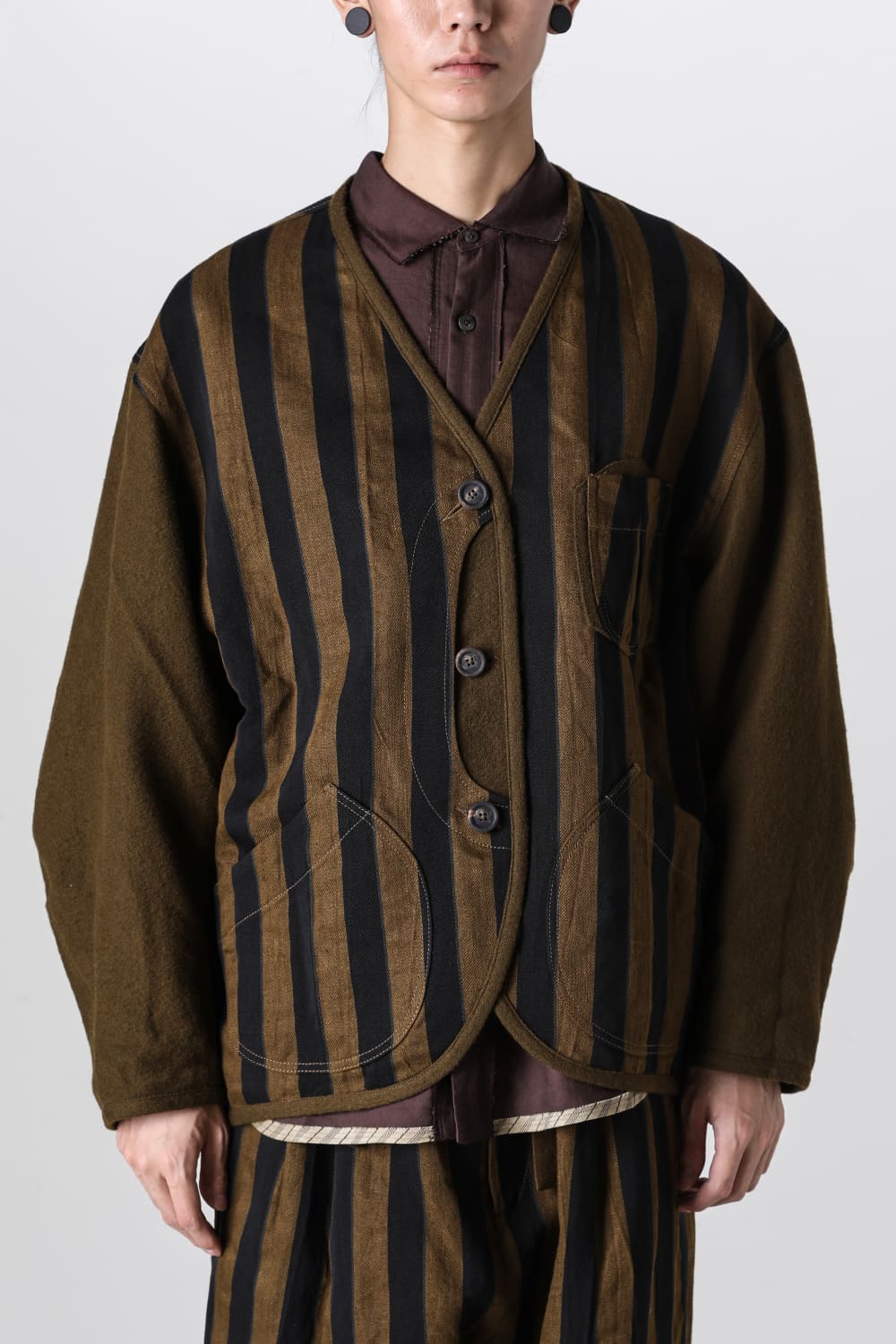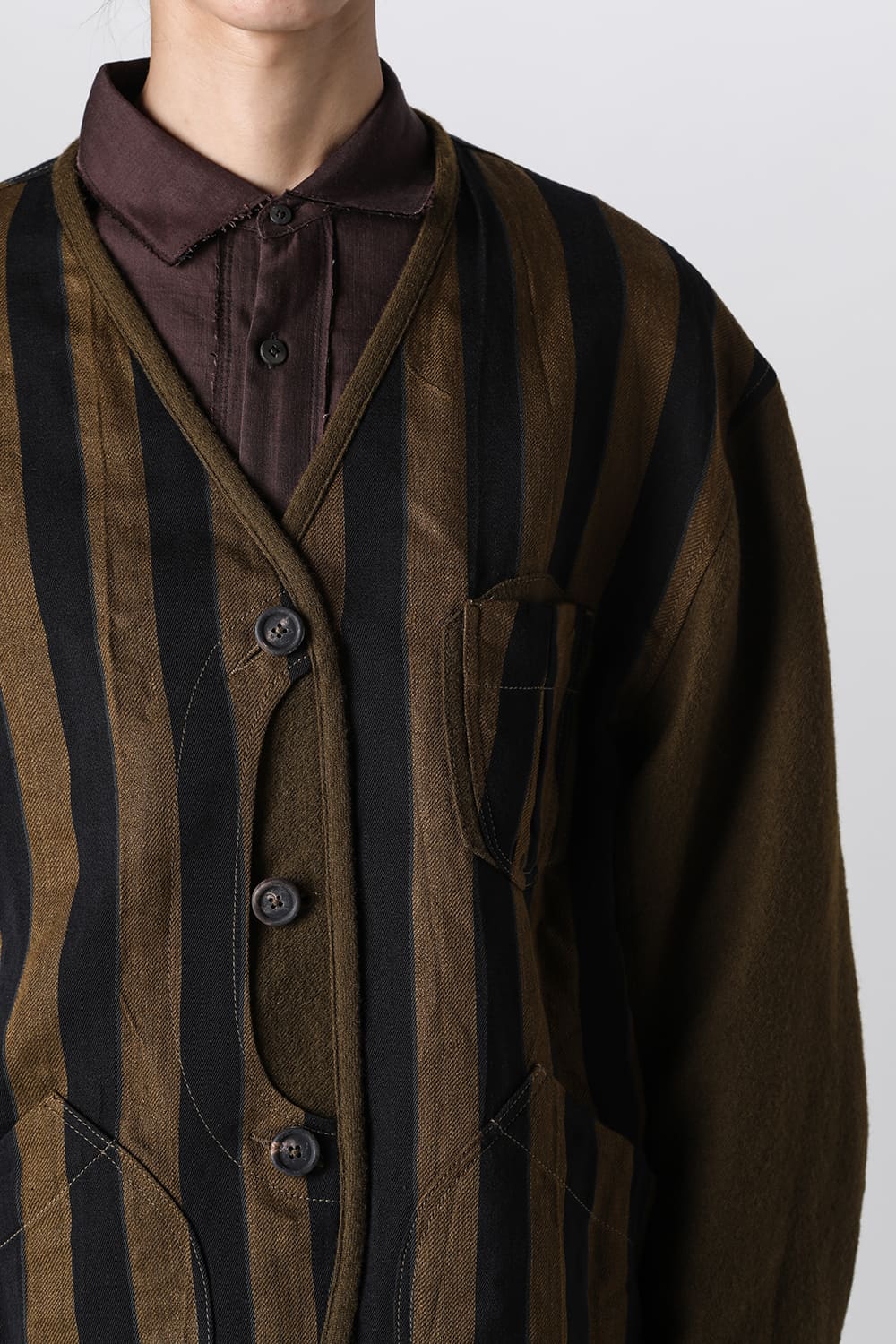 Collarless reversible jacket features V-neck neckline and striped fabric used throughout.