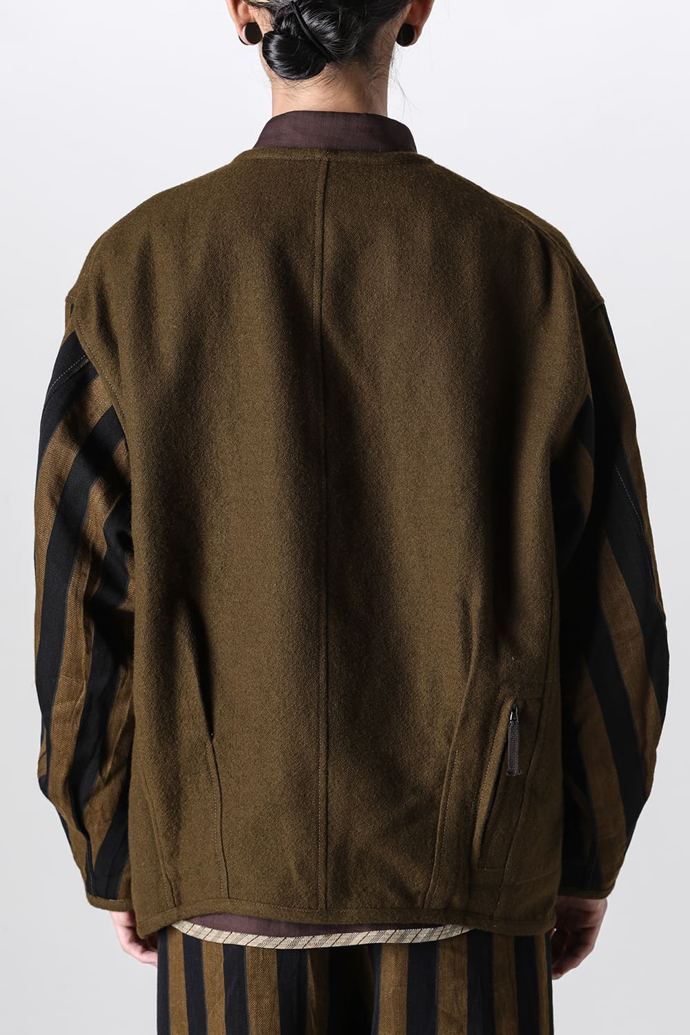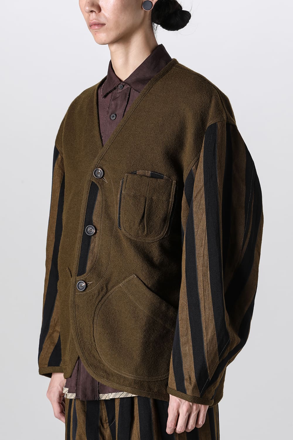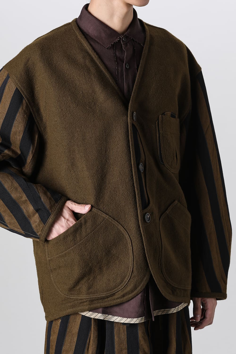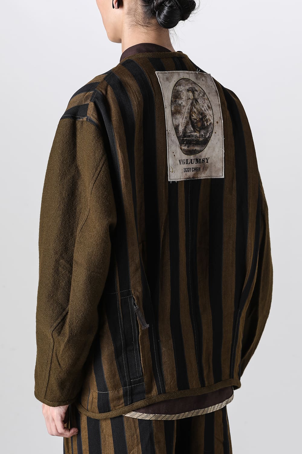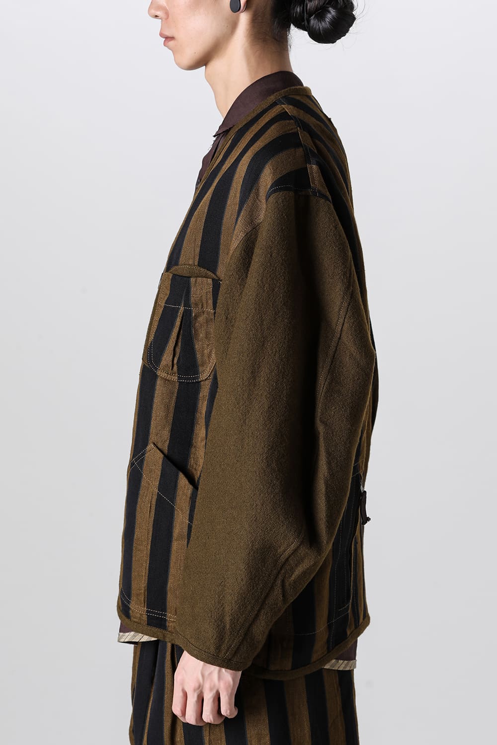 Collarless reversible jacket features V-neck neckline and striped fabric used throughout.