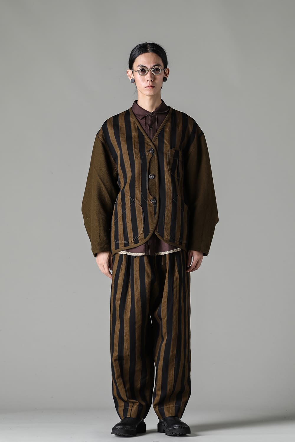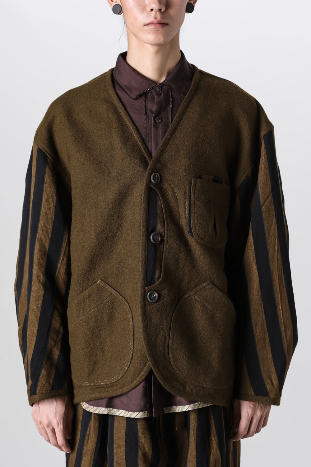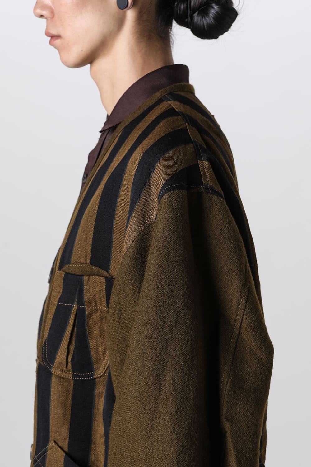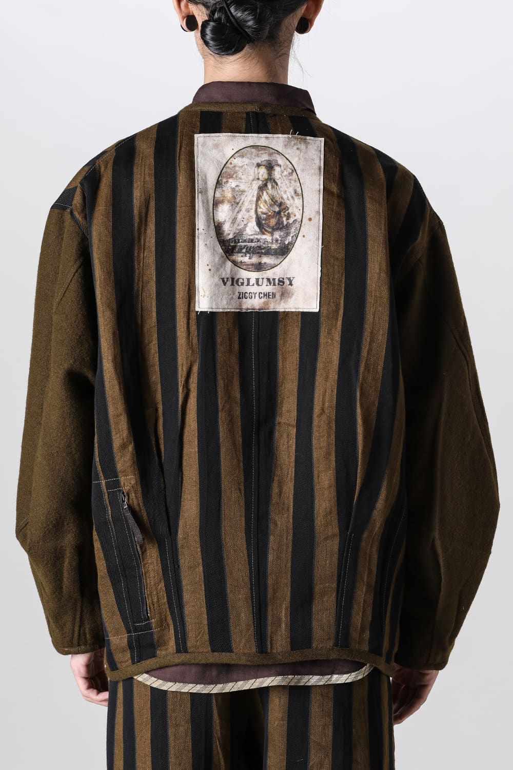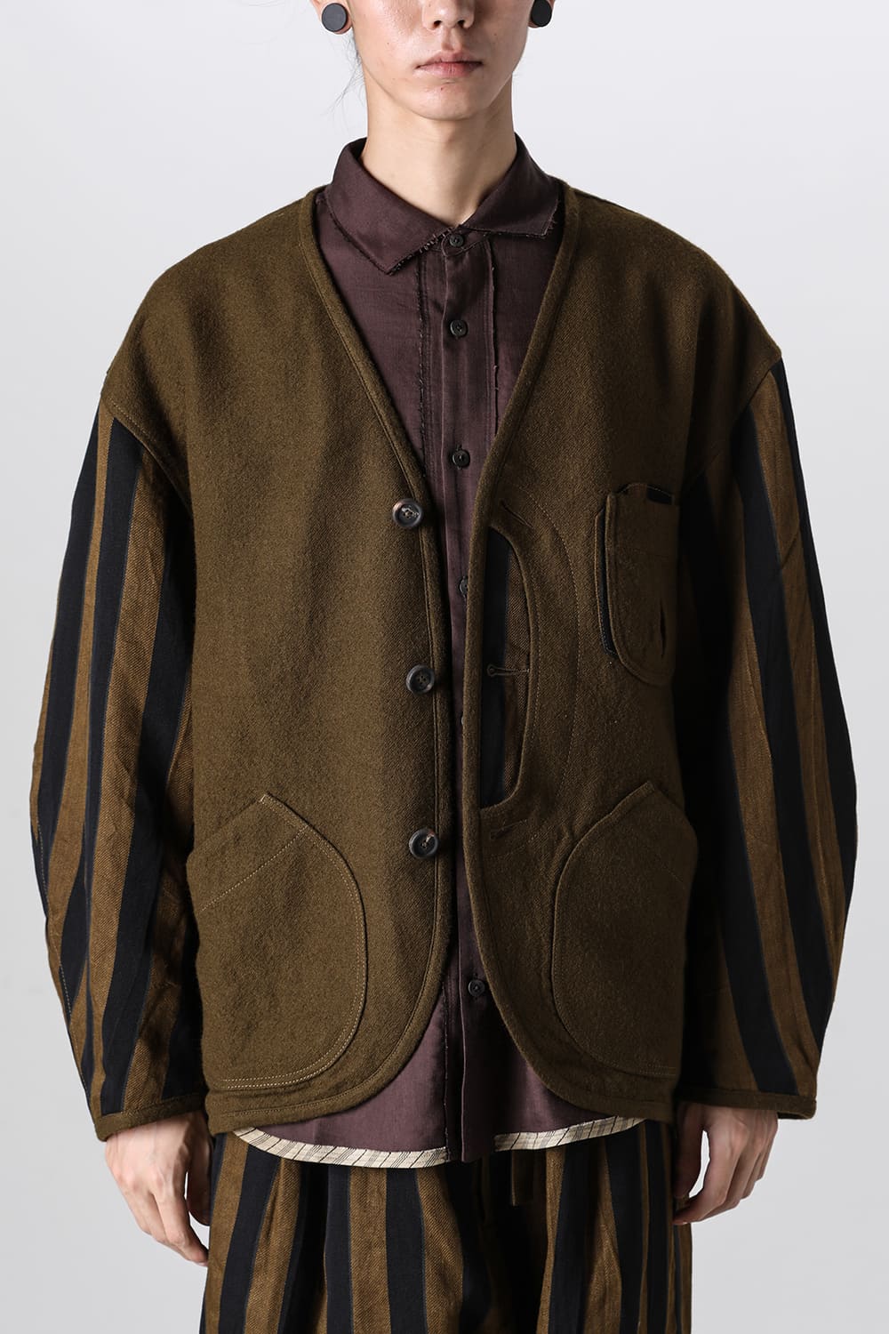Collarless reversible jacket features V-neck neckline and striped fabric used throughout.
