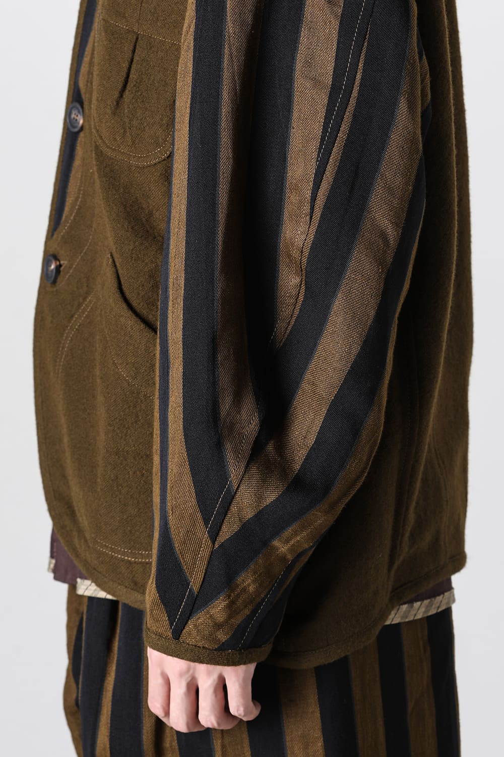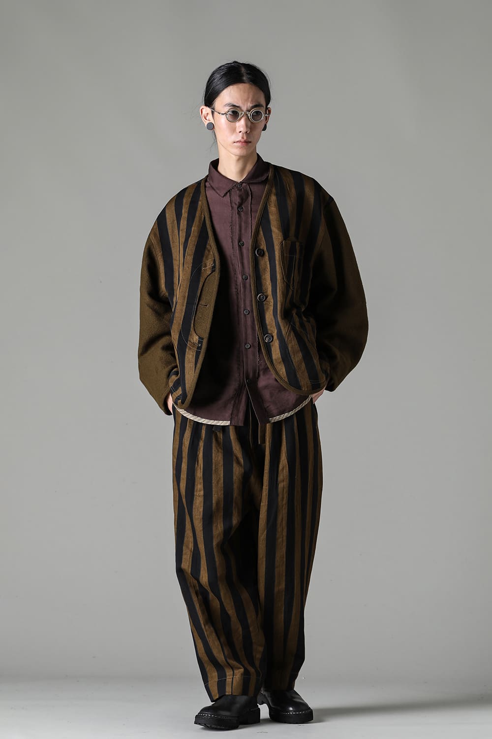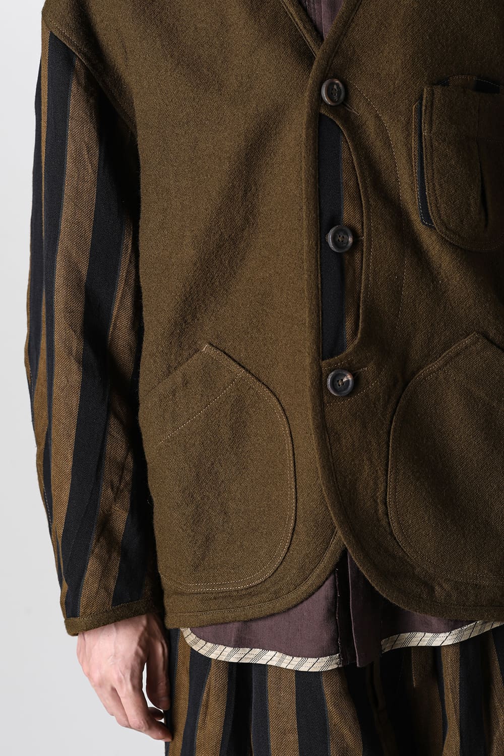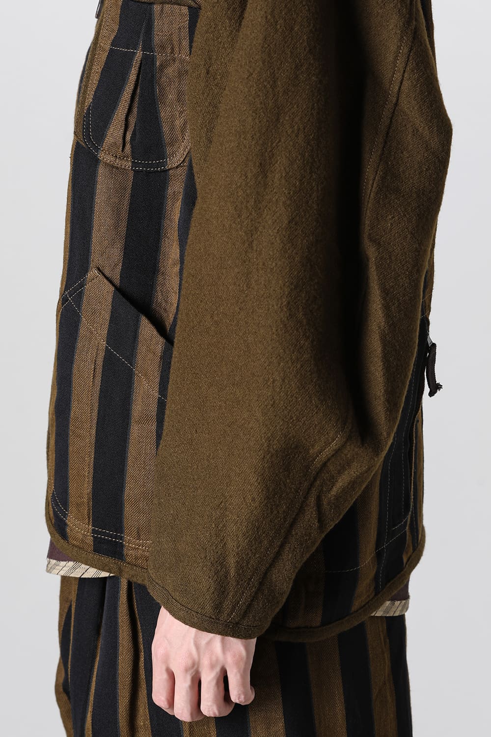 Collarless reversible jacket features V-neck neckline and striped fabric used throughout.