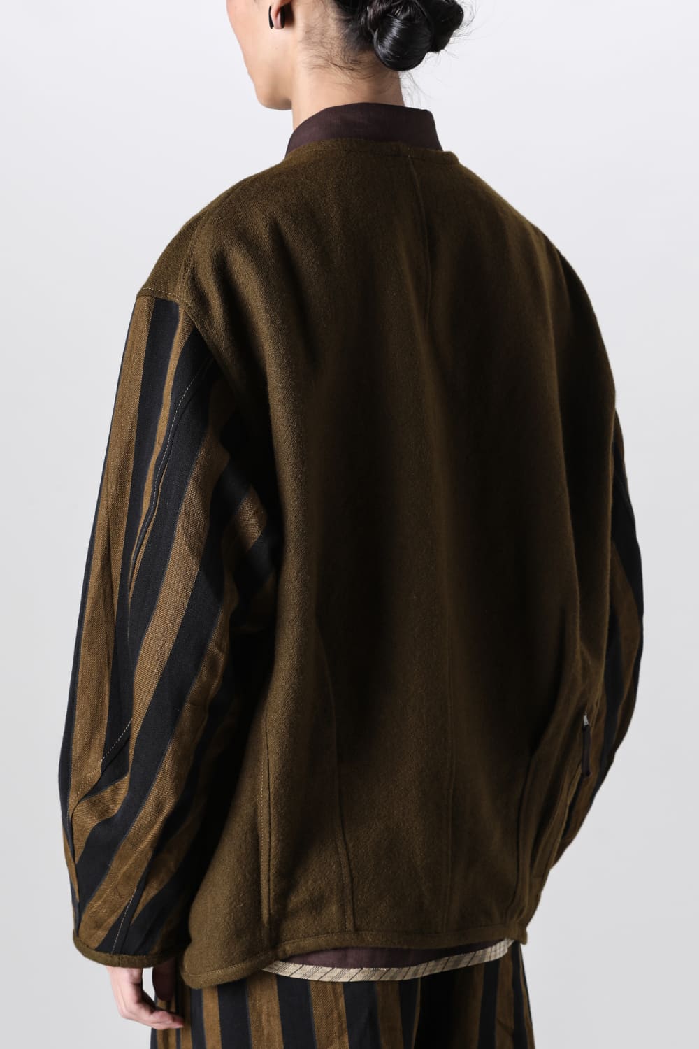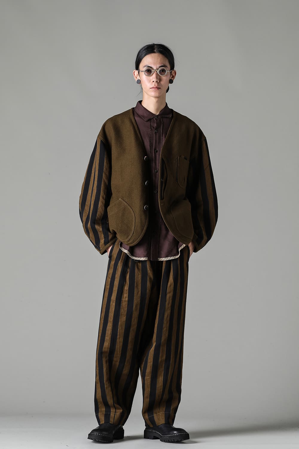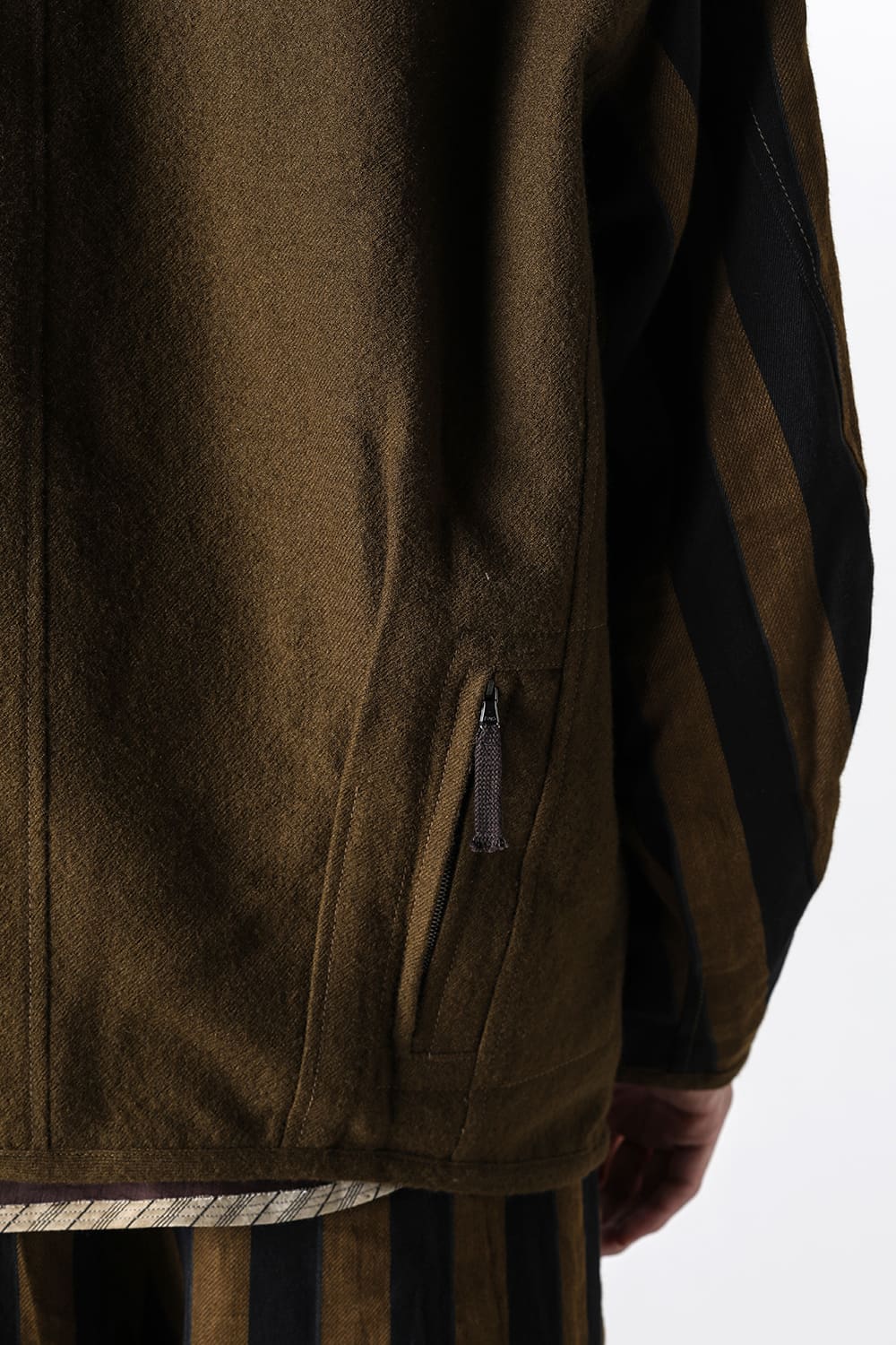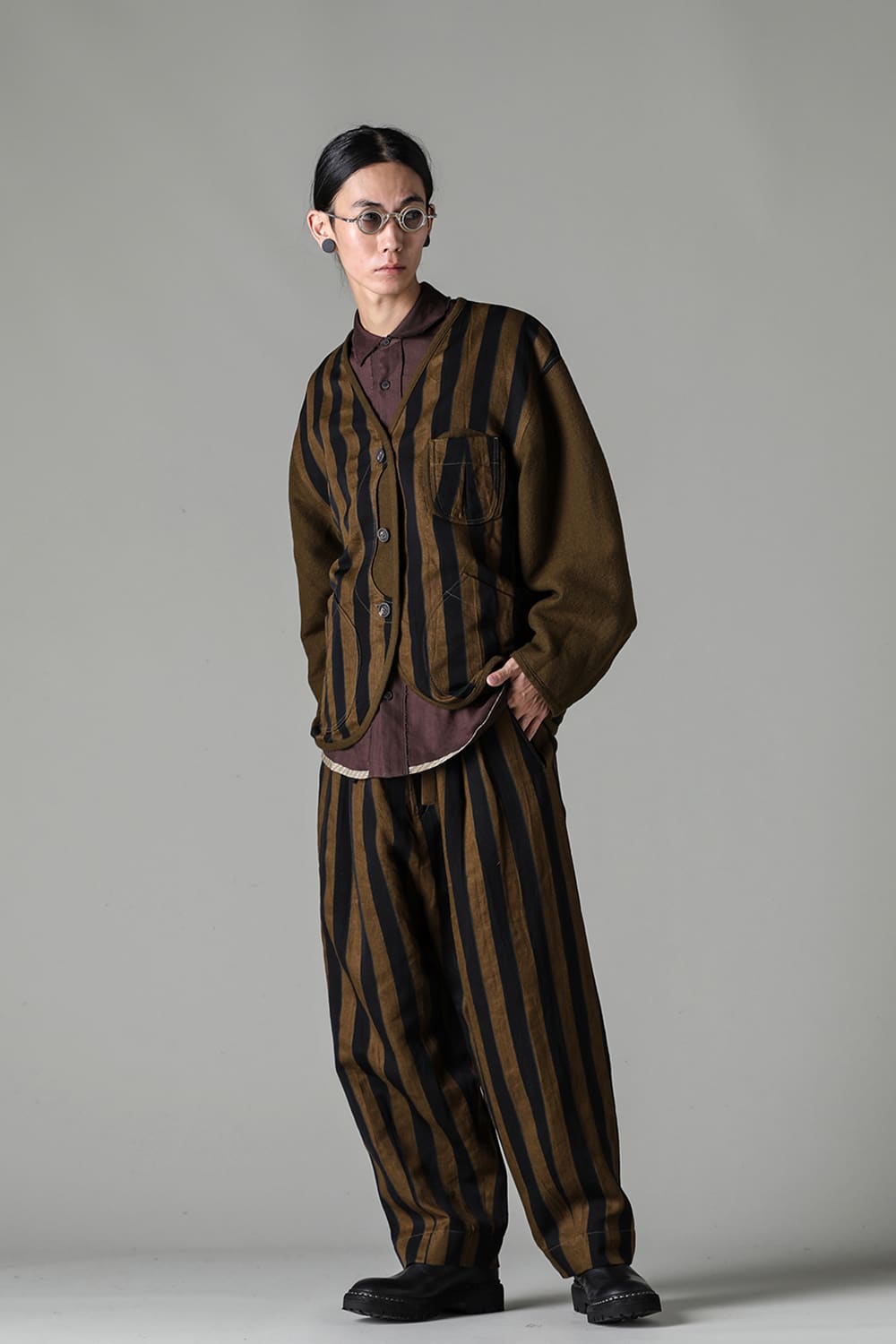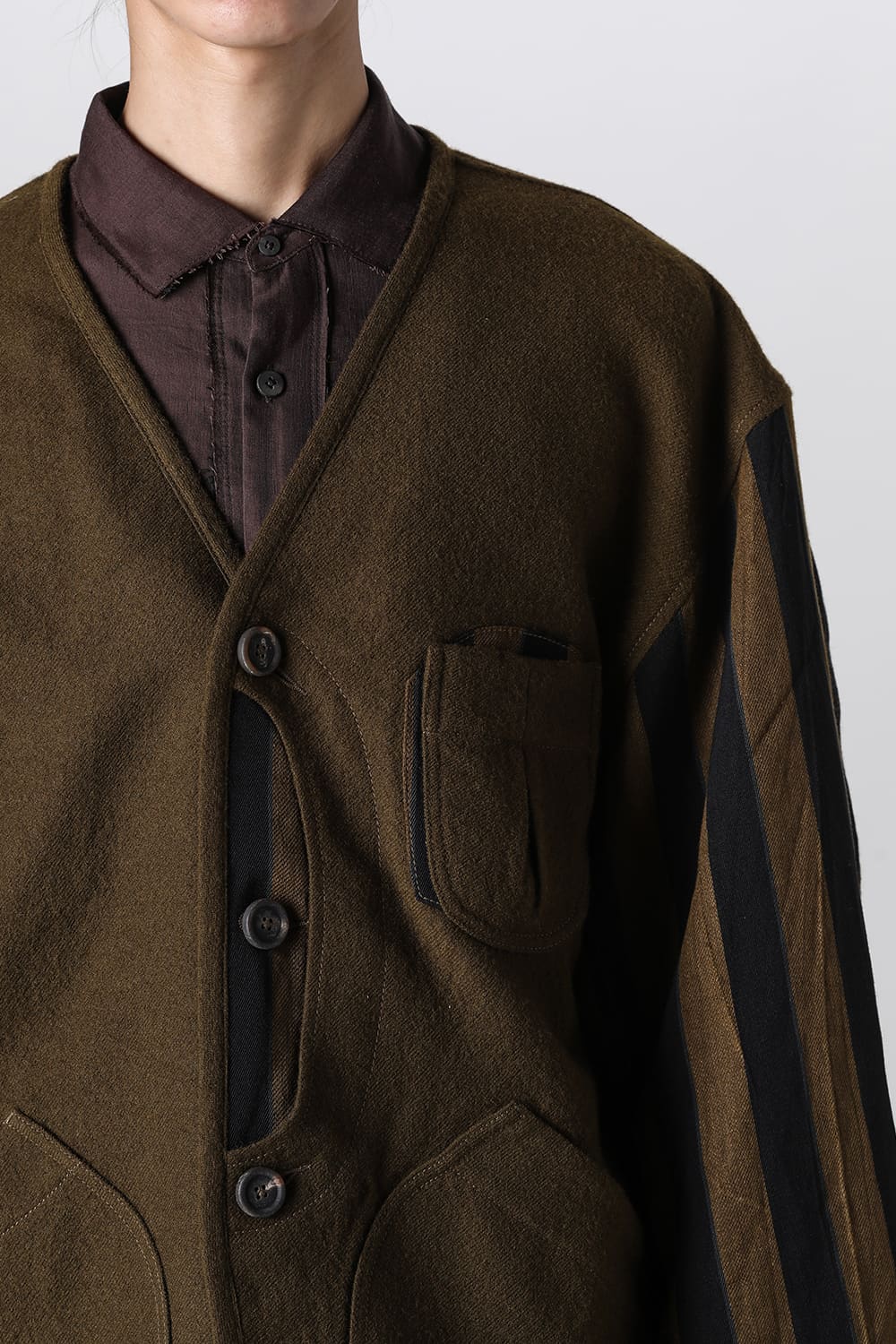 Collarless reversible jacket features V-neck neckline and striped fabric used throughout.