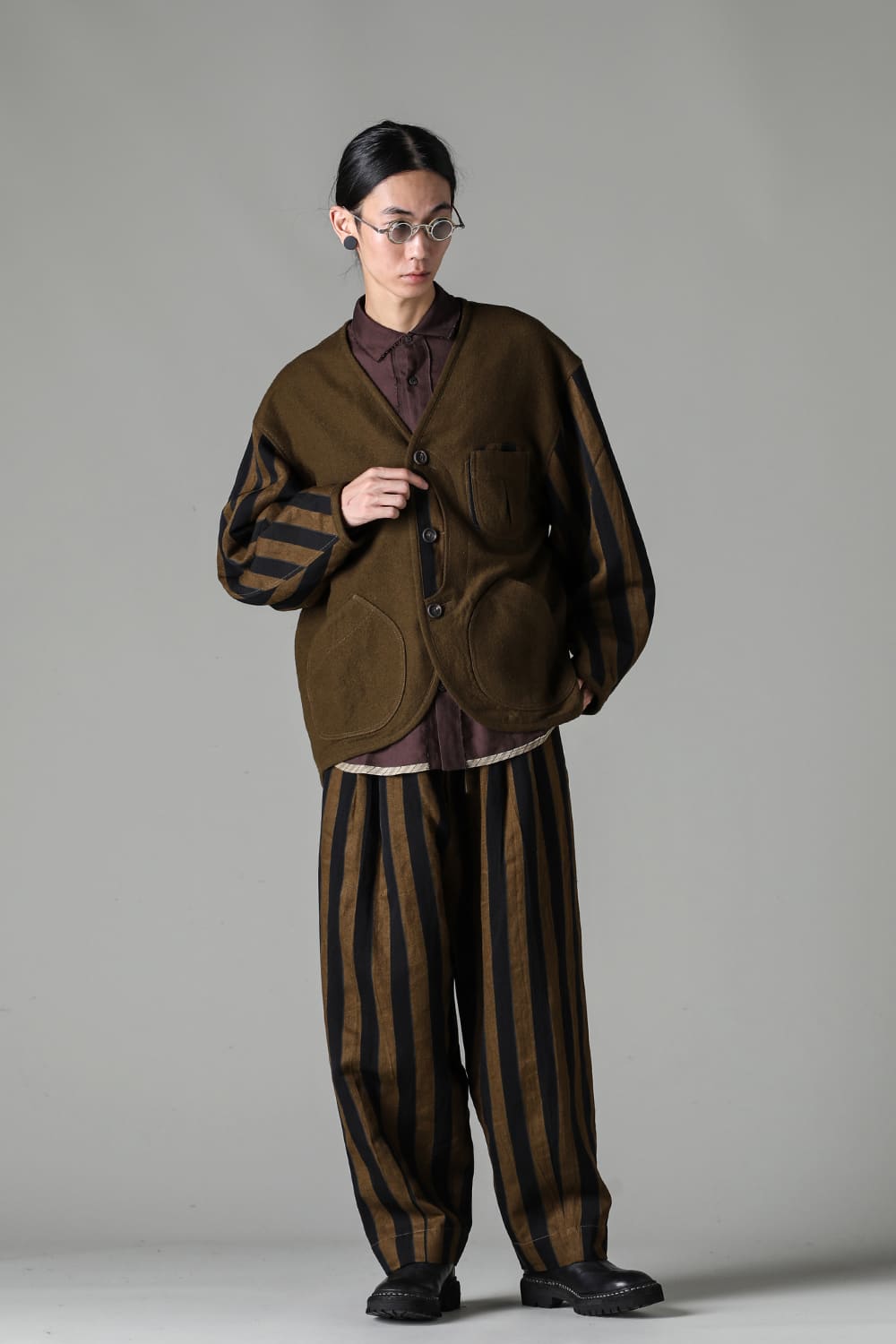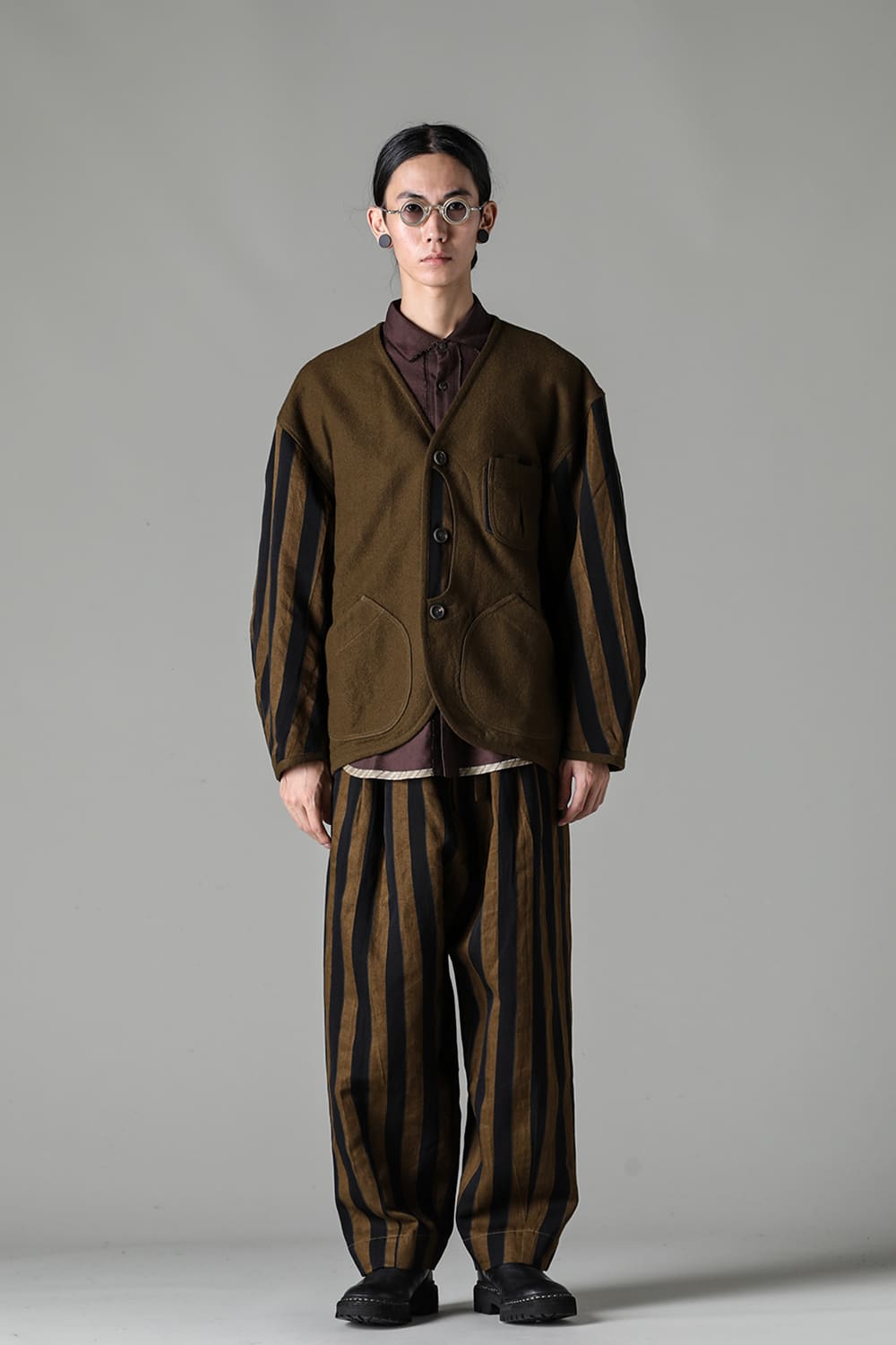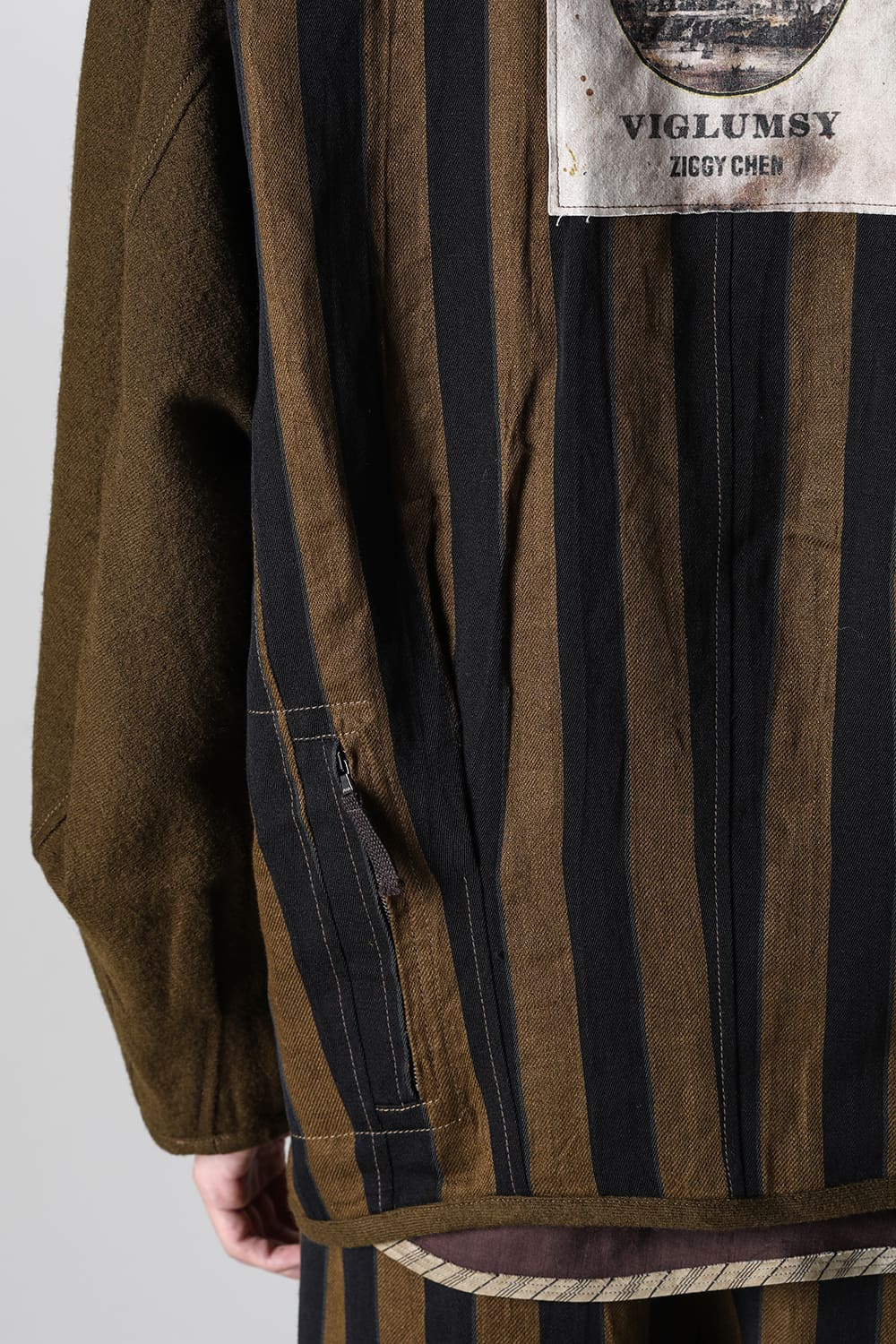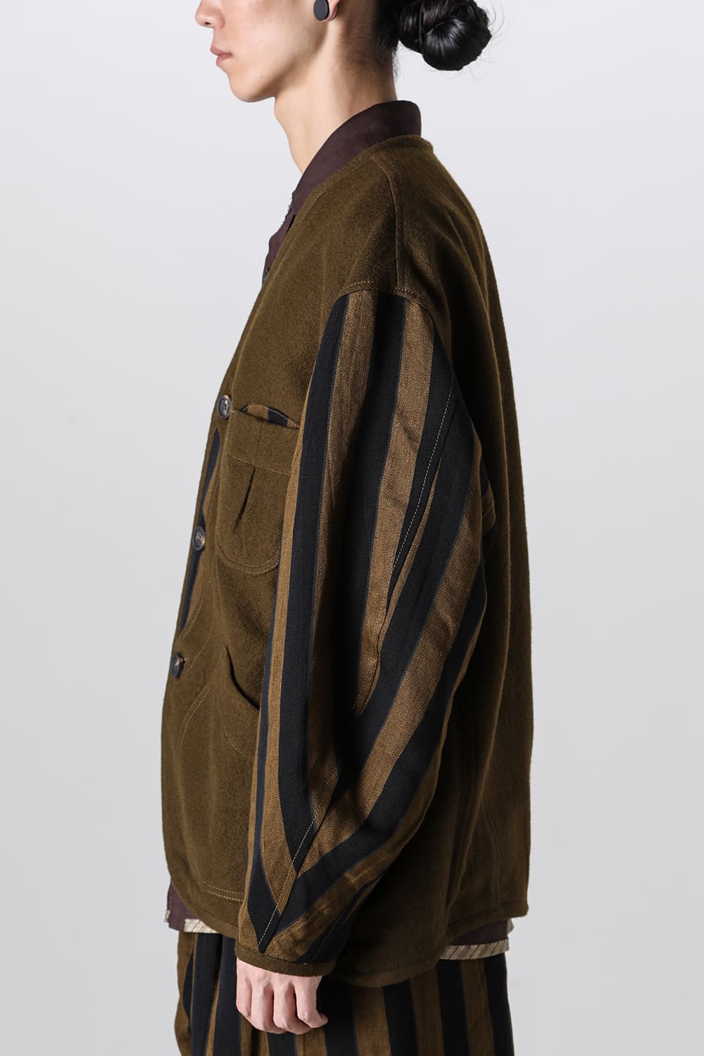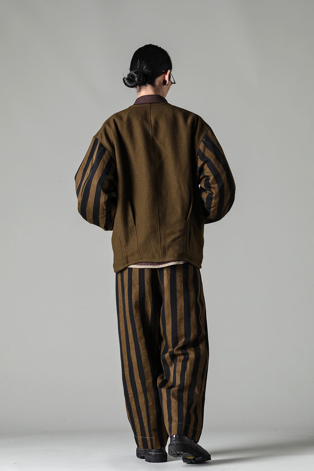 Collarless reversible jacket features V-neck neckline and striped fabric used throughout.