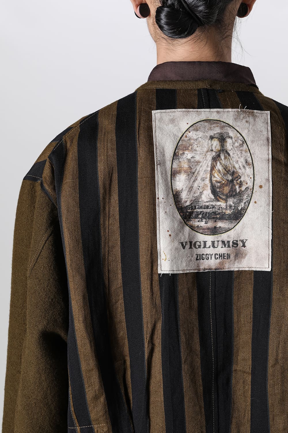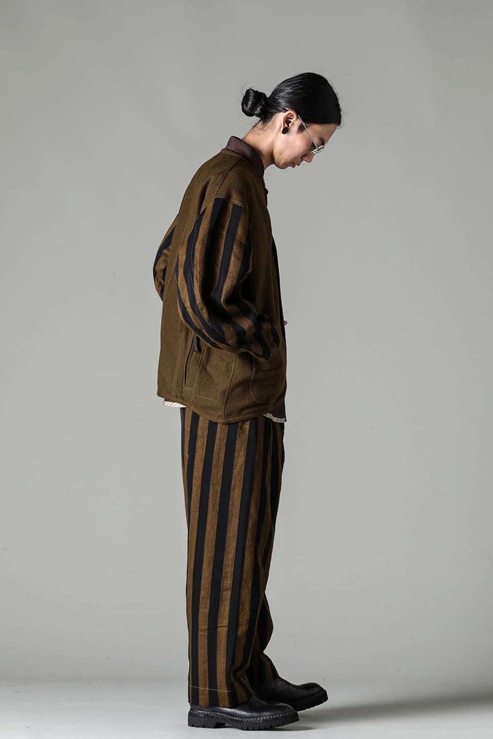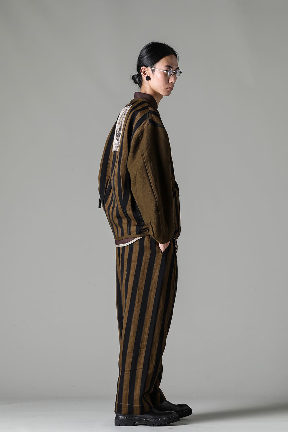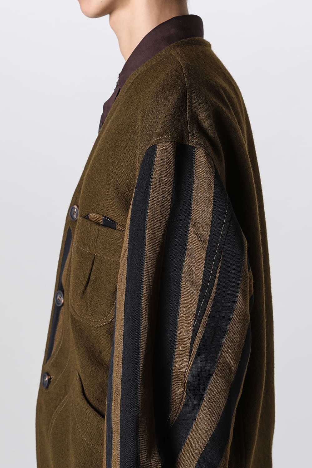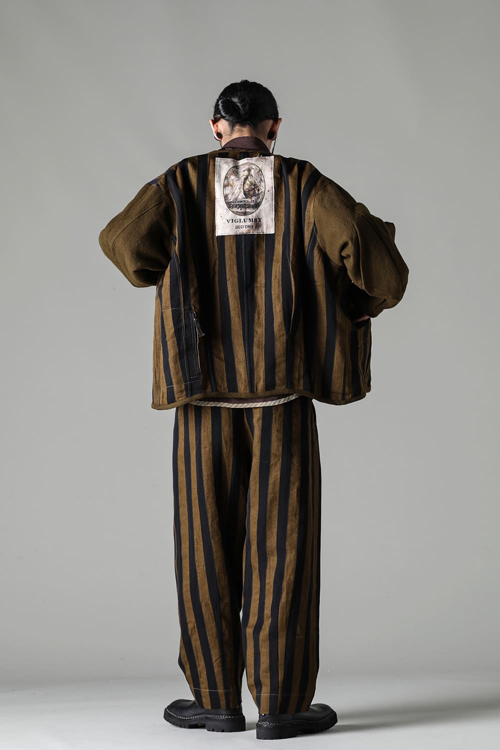 Collarless reversible jacket features V-neck neckline and striped fabric used throughout.