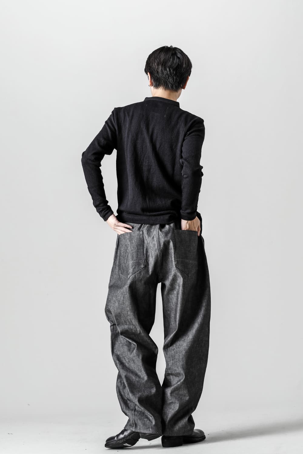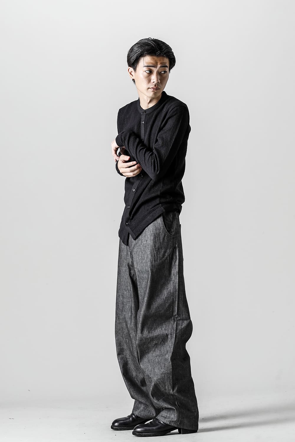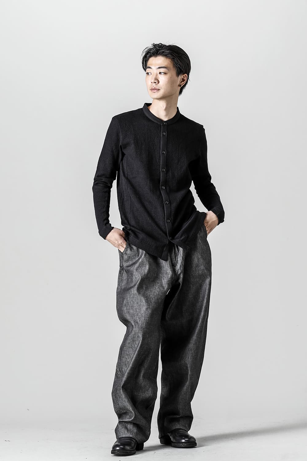 This cardigan is based on a classic innerwear design. The standard patterned construction and round neckline make it a comfortable and useful innerwear for the autumn and winter. The front is made of wool linen twill fabric. The different weave produces a slight difference in coloration and a good degree of crispness. The body is made of a top-dyed 48 monofilament and wool blend woven on a jacquard knitting machine. The hound's tooth pattern is not easily recognizable at a glance, and the unevenness created by the differences between the fabrics and the smoothness with which it conforms to the body make it a fabric with KLASICA's unique attention to detail.