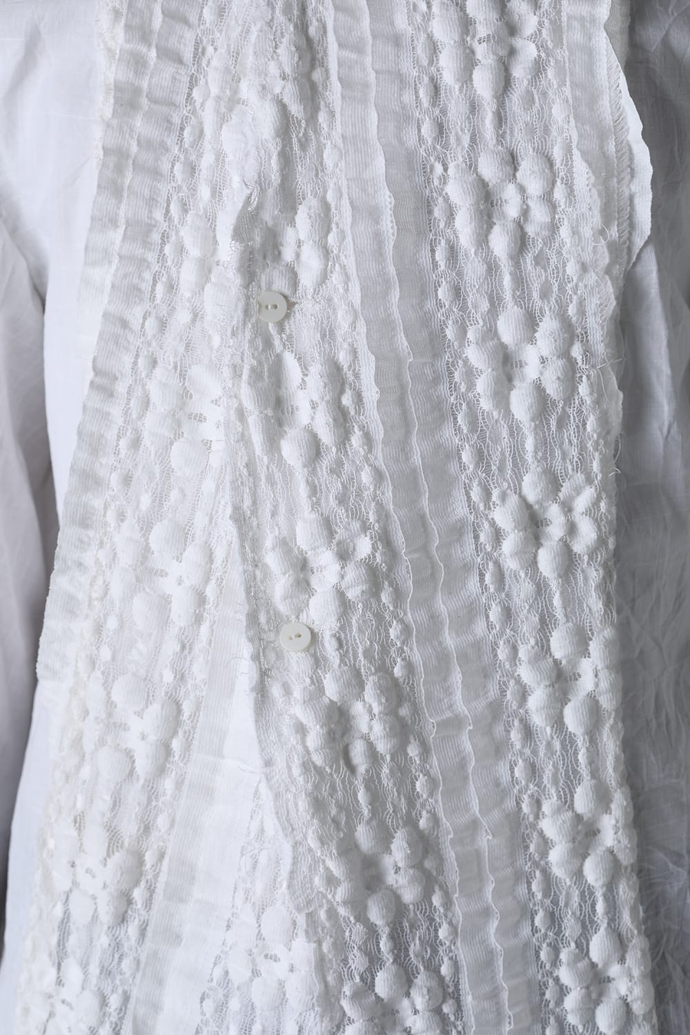 Jacket shirt made from antique curtain lace. Shirts made of curtain lace are a favorite of the designer and are released in a different fabric each season. This time around, the embroidered floral design is applied to the entire garment. The sleeves are simple and the contrast between the two is very beautiful.