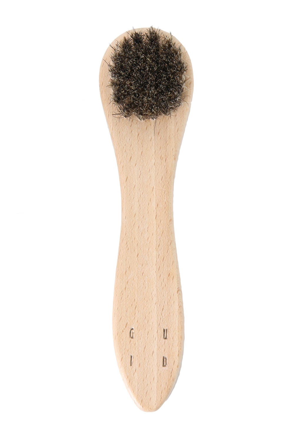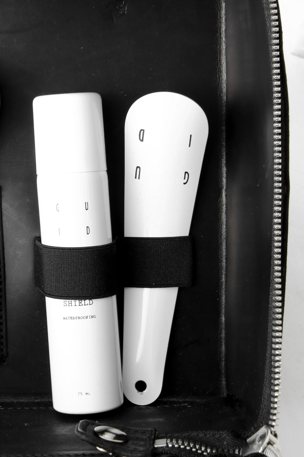 Contents of the GUIDI Shoe Care Set are, 4 brushes, 1 shoe horn and 1 cloth with 2 waterproof sprays, 2 soaps and 2 care creams (1 of each are extras kept in a white pouch). Everything is engraved with the GUIDI logo and the bag is made of a very GUIDI-like horse leather. This luxury care set has both great functionality as well as an excellent design.