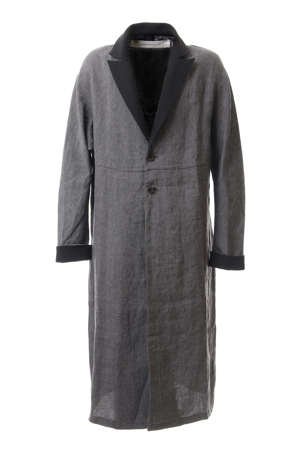 Light linen coat that can be worn loosely. The inside of the front is made of a separate black fabric, which peeks out from the lapel. This simple item is versatile and can be used for a long time. Available in black and gray black. This is a gray black.