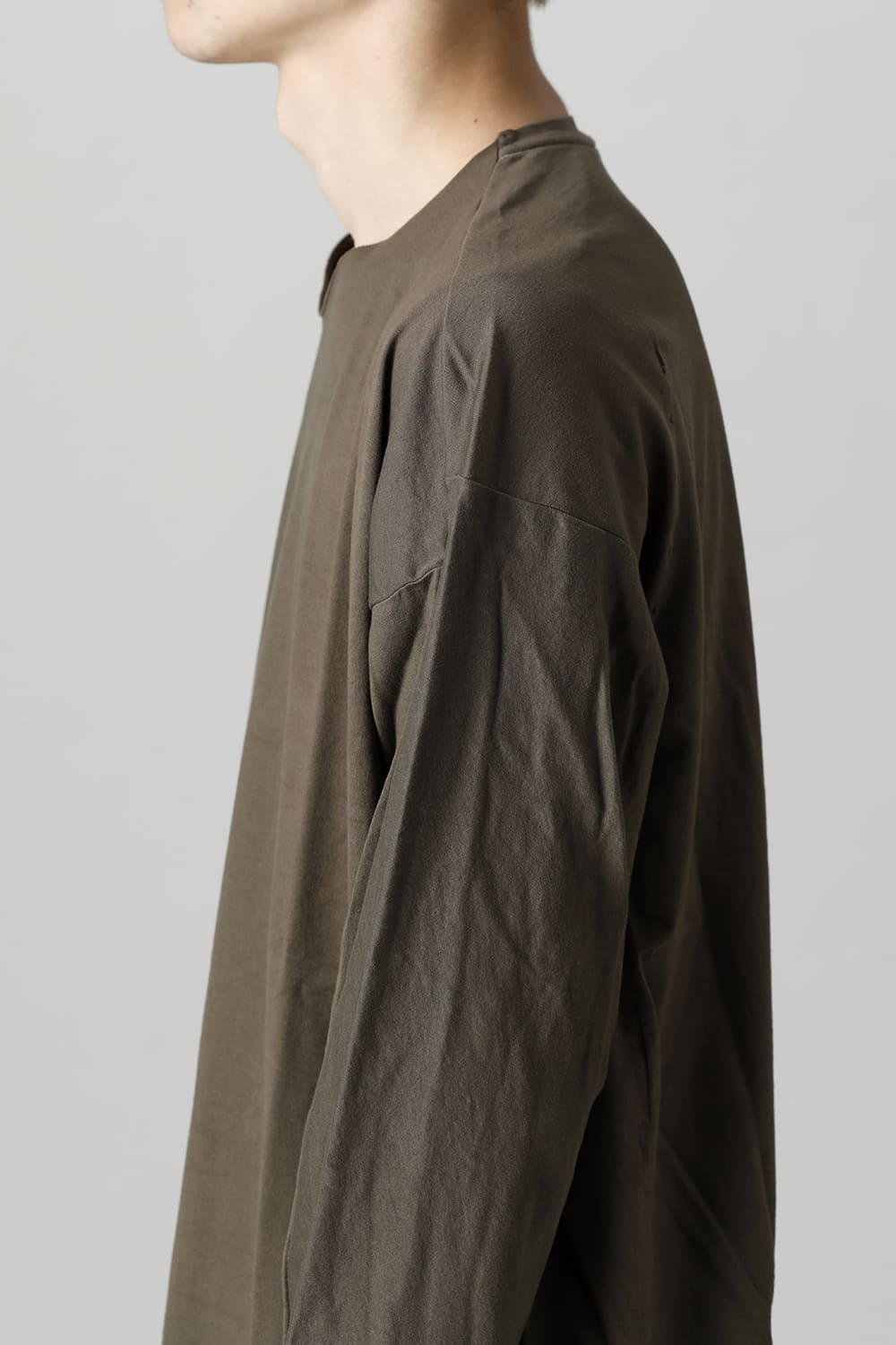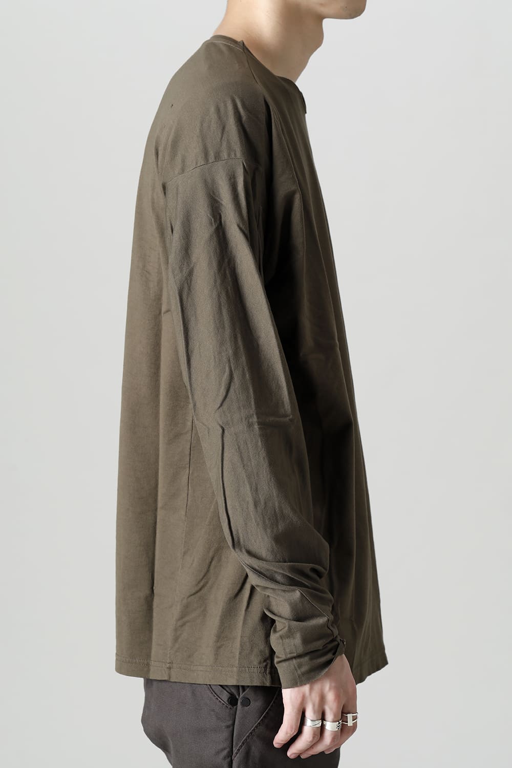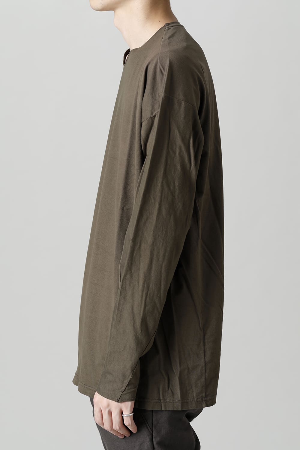 Relaxed fit long sleeve cut sew made of jersey fabric with 3 twisted 100 count fine threads.