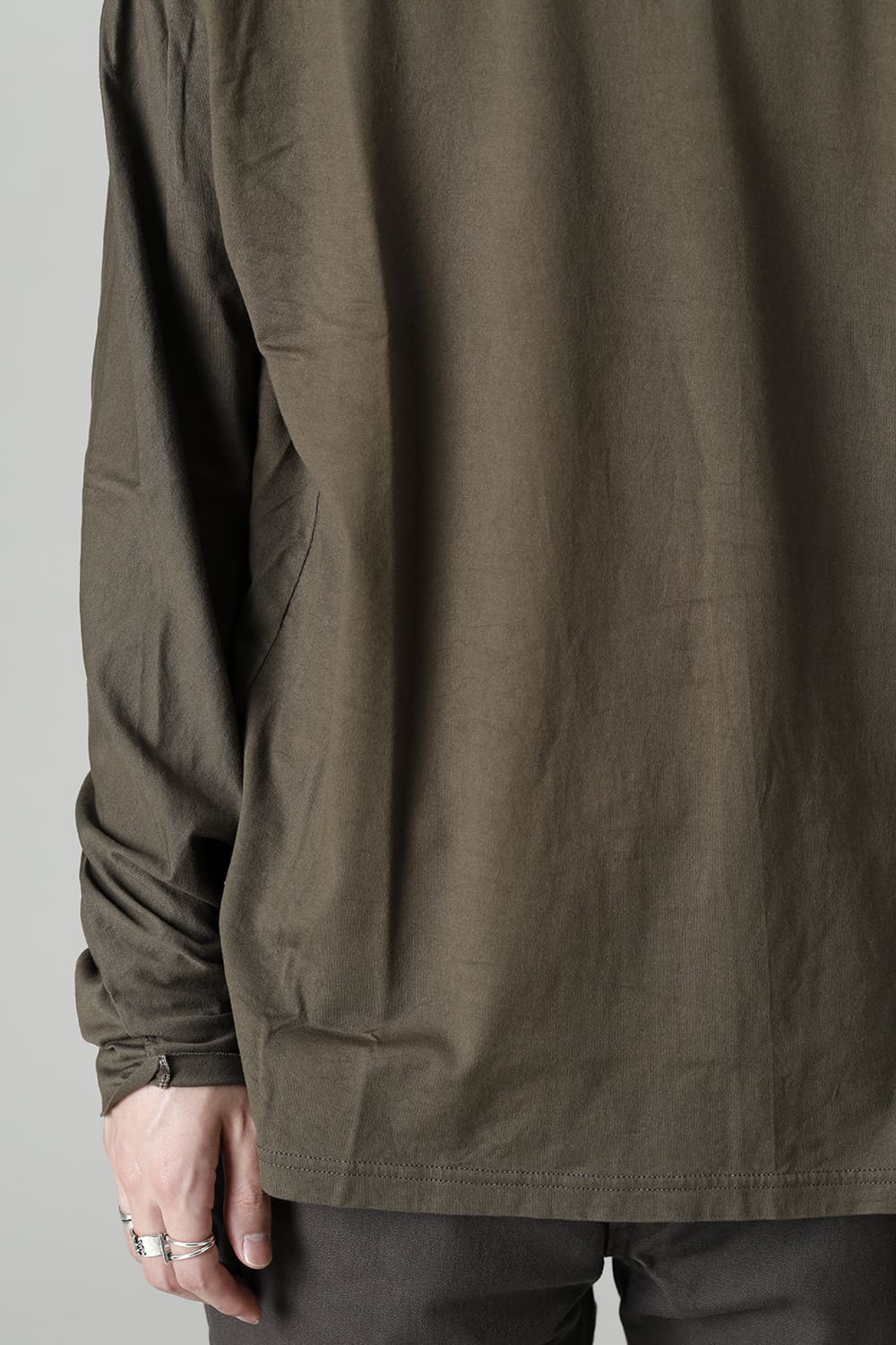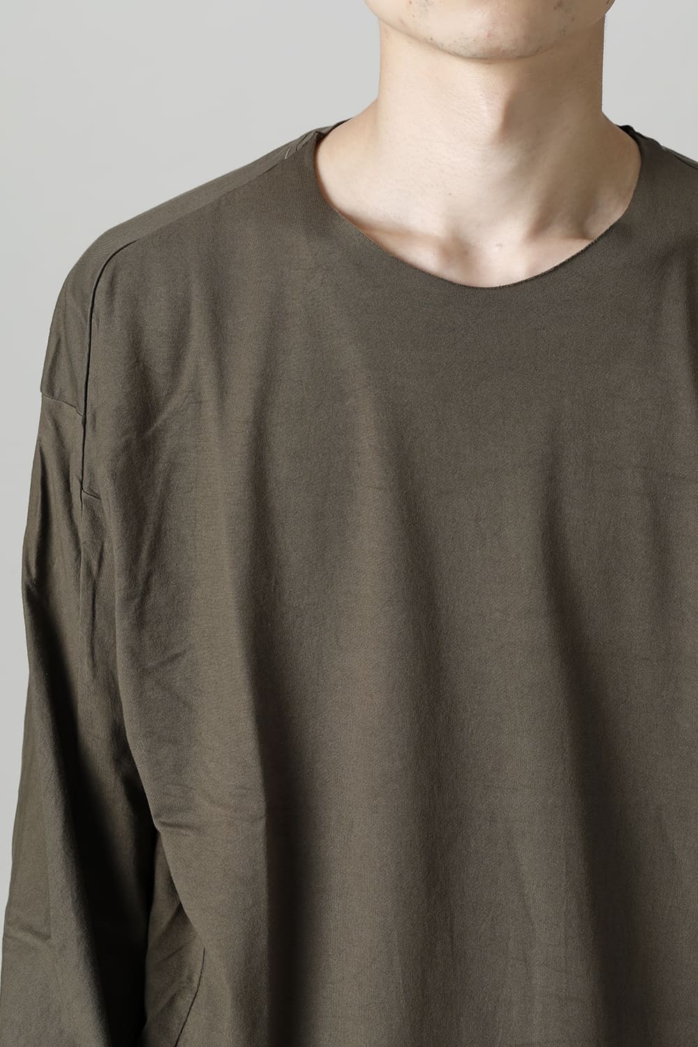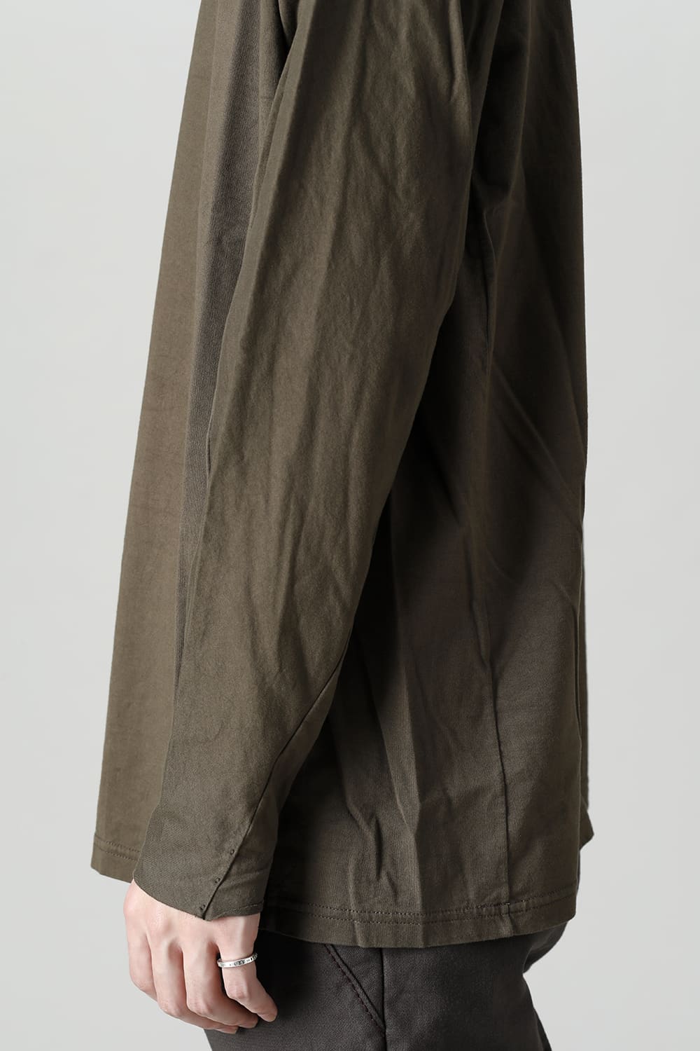 Relaxed fit long sleeve cut sew made of jersey fabric with 3 twisted 100 count fine threads.