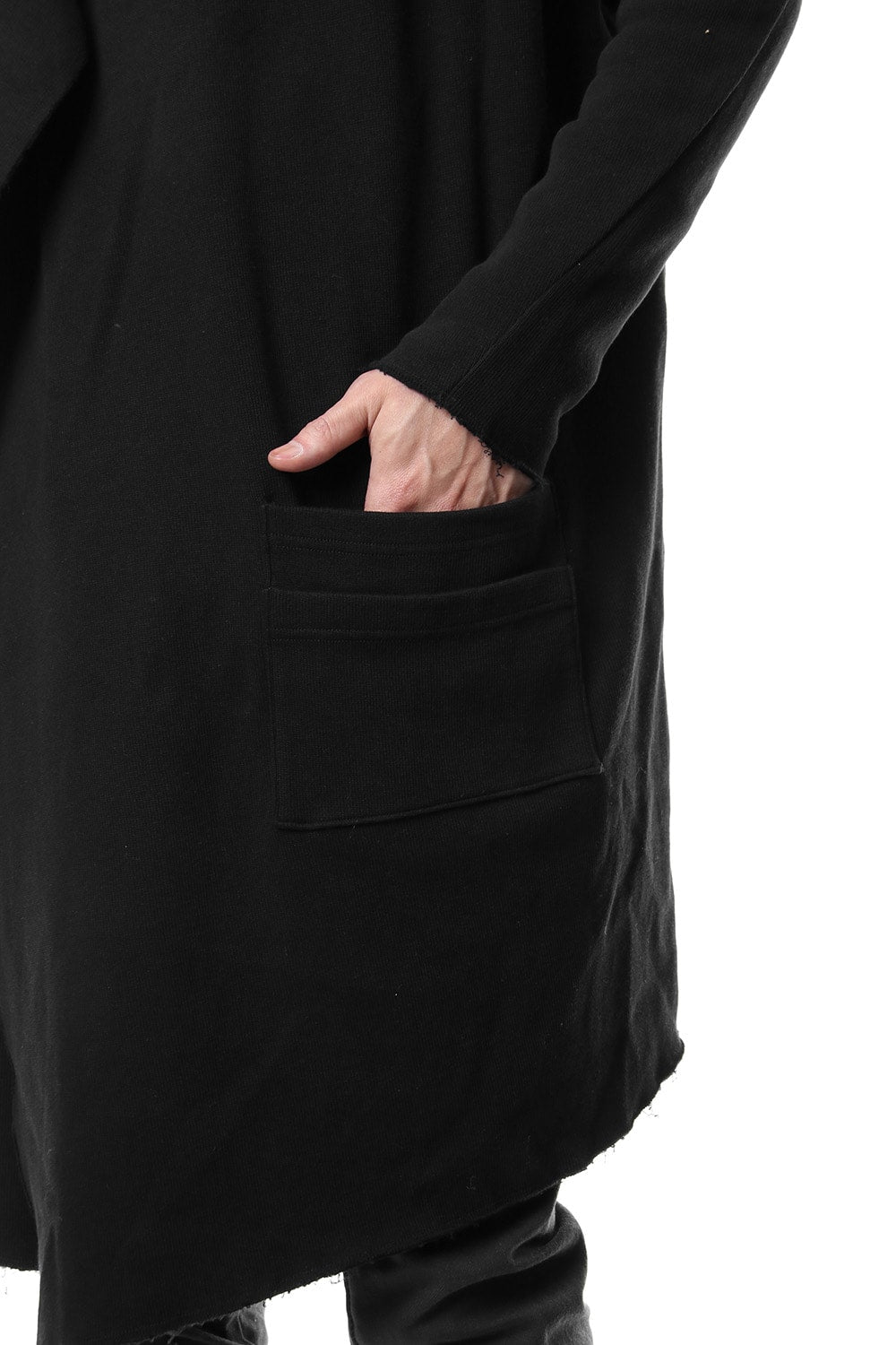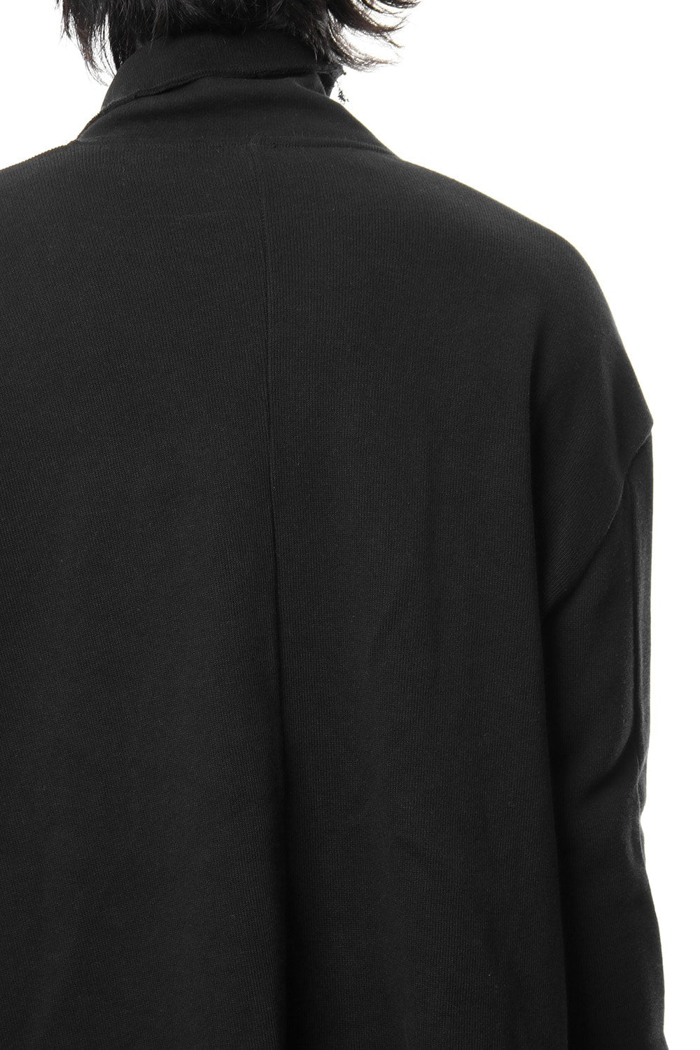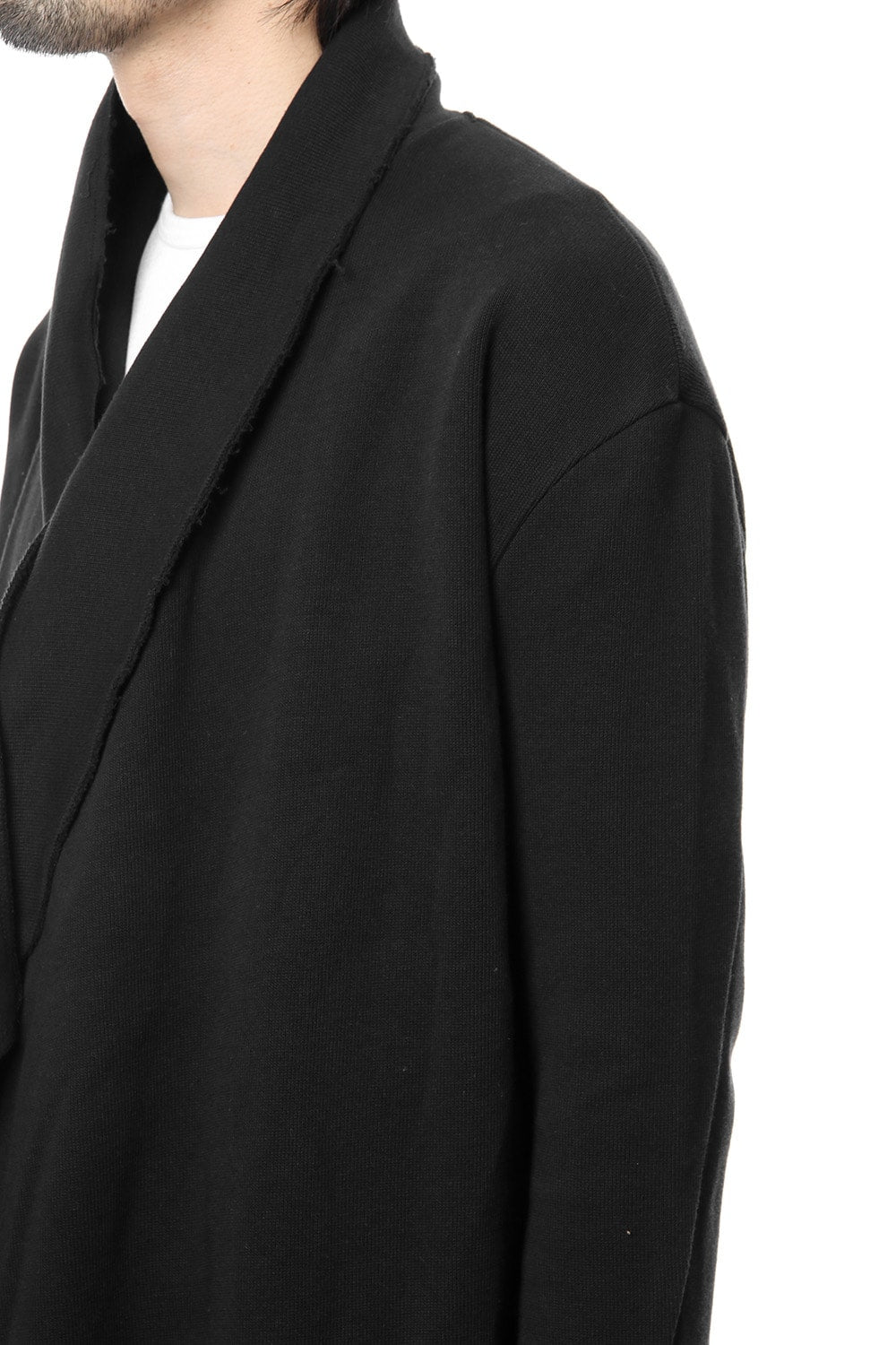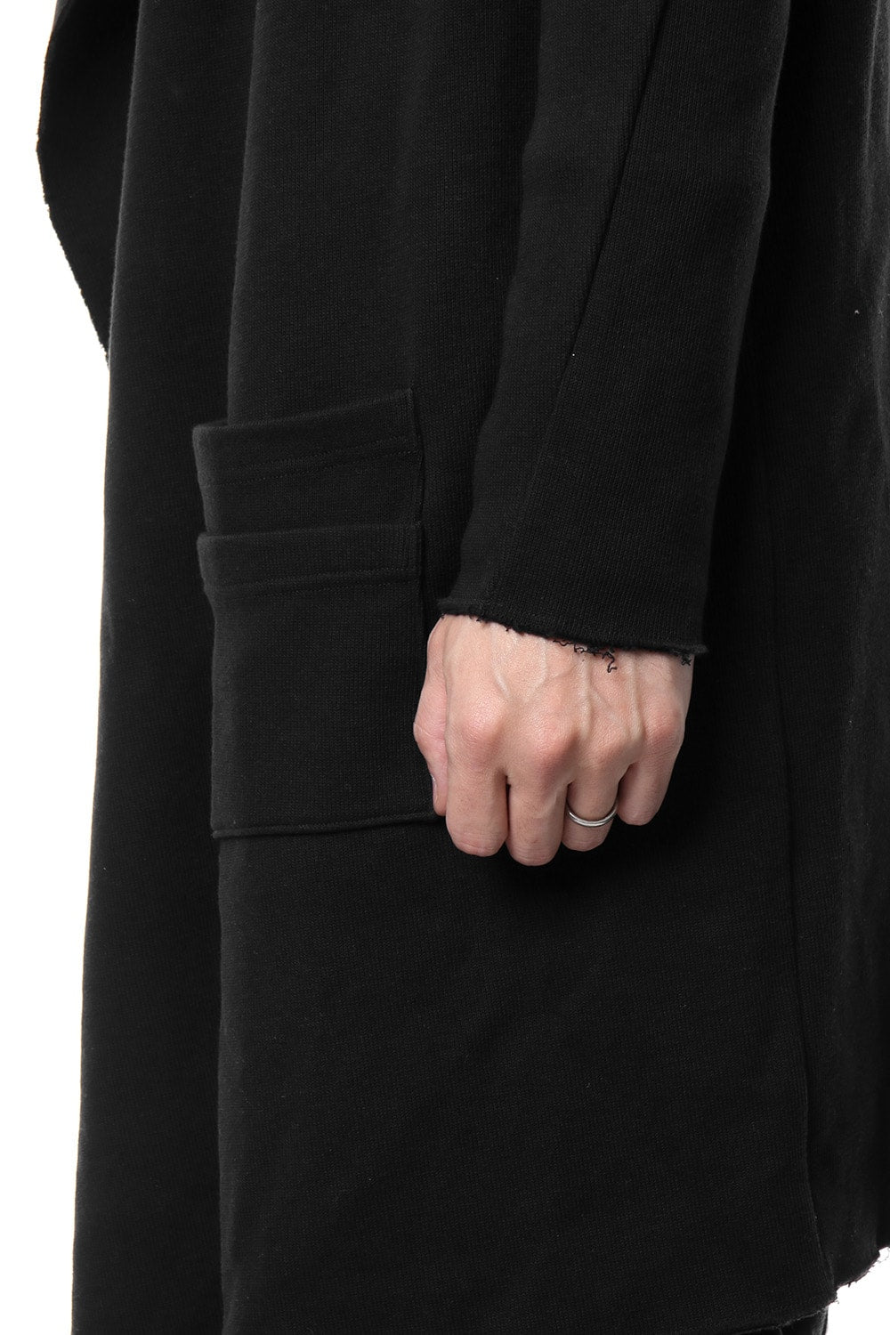 コートの様な雰囲気のあるローブカーデ。非常に希少な編み機を使用した中肉素材。表目はリブ。裏目は天竺のダブルフェイス組織。秋冬に最適なカットソーで風合い、肌触りも新感覚なものになりました。