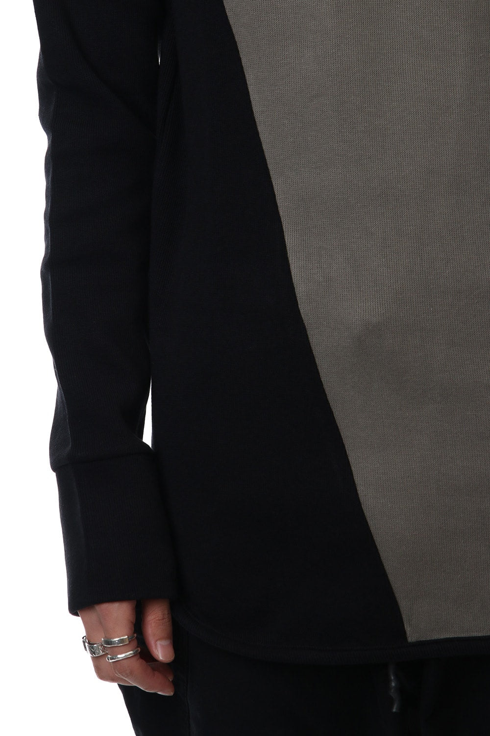 非常に希少な編み機を使用した中肉素材。表目はリブ。裏目は天竺のダブルフェイス組織。秋冬に最適なカットソーで風合い、肌触りも新感覚なものになりました。カーキはあえてバイカラーに。洗濯機でもガンガン洗えるイージーケアも魅力です。BLACKとKHAKIの2色展開でこちらはKHAKI。