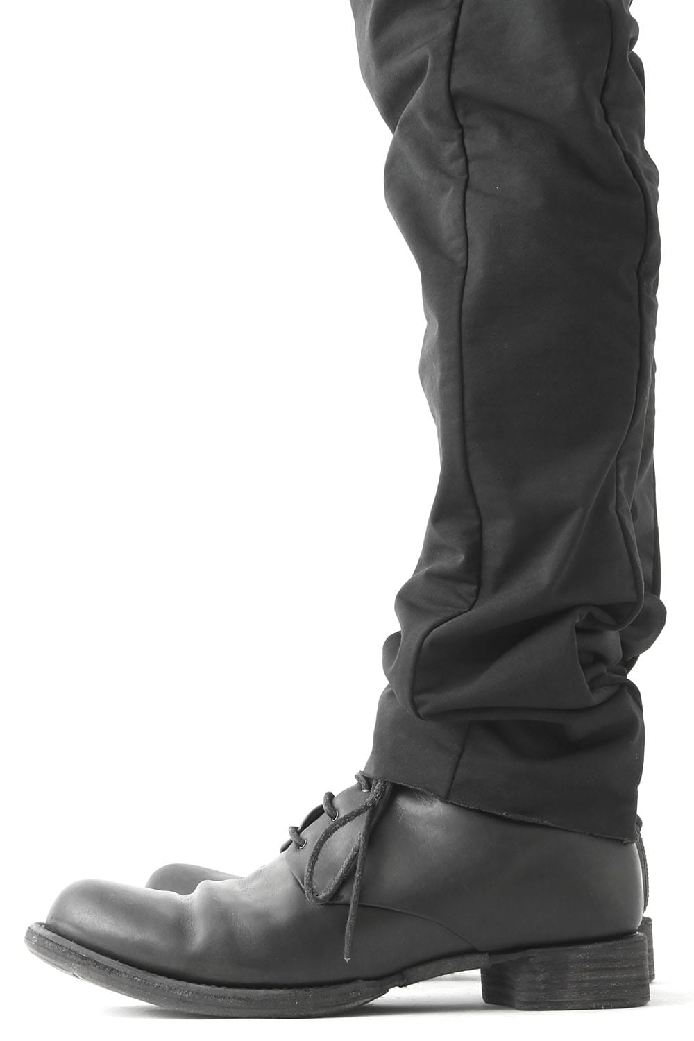 This new type of Jodhpurs is made with a fleece lining with polyester and cotton threads fused to it, showing hardness and a slightly used impression with the fine brushing finishing applied, that was also present in the 16SS collection. This time the rise is deeper, and have a tapered silhouette from the knee and a sharp pattern.