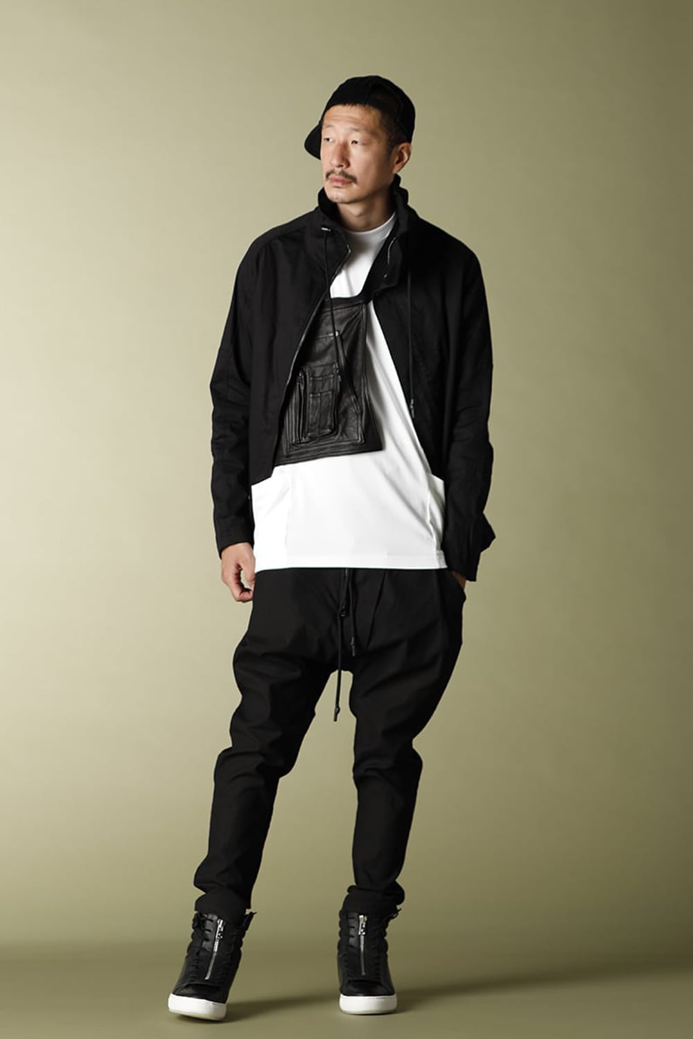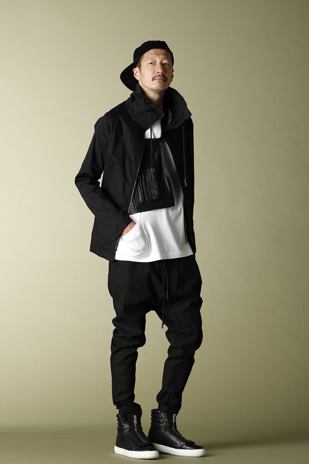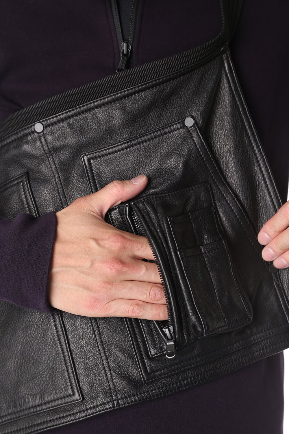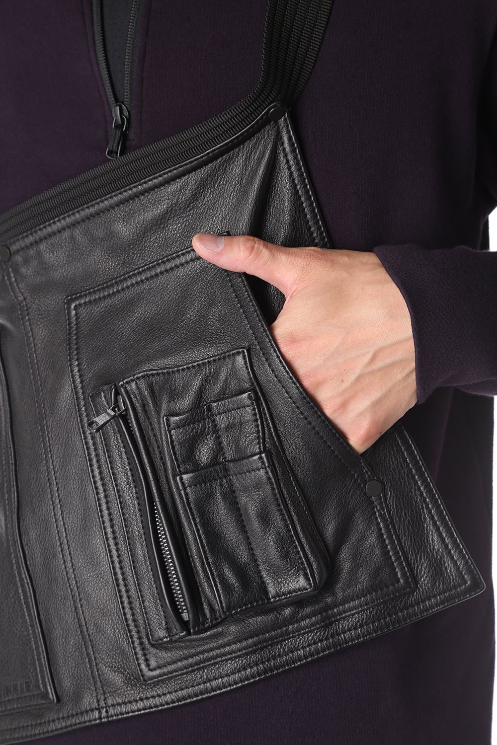 The cow leather is a RIPVANIWNKLE original leather. It has a thick look, but it also has a soft touch. The back side of the body is made of cotton herringbone material in consideration of friction. It's a combination. The use of leather allows you to enjoy the changes over the years, and the apron shape creates a supple look all over, which improves the fit when worn.
