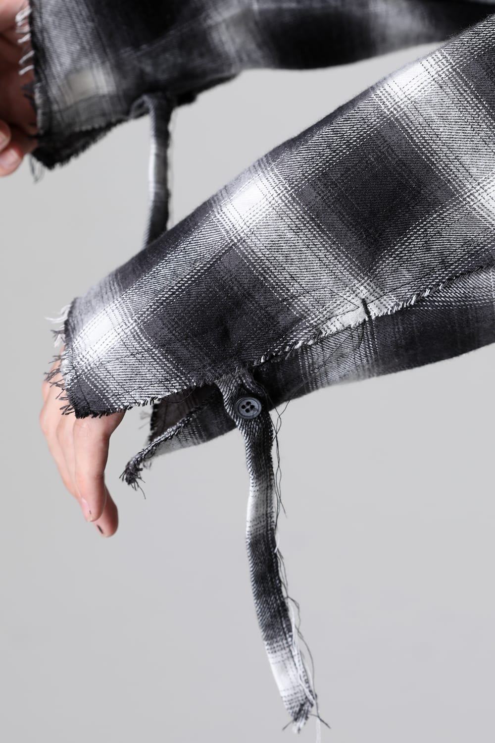 True to ASKYY's style, it showcases a bold black-and-white gradient blend, featuring a check pattern with depth. The hem and cuffs have a frayed edge design, creating a grunge-inspired look that becomes more pronounced as you wear it.