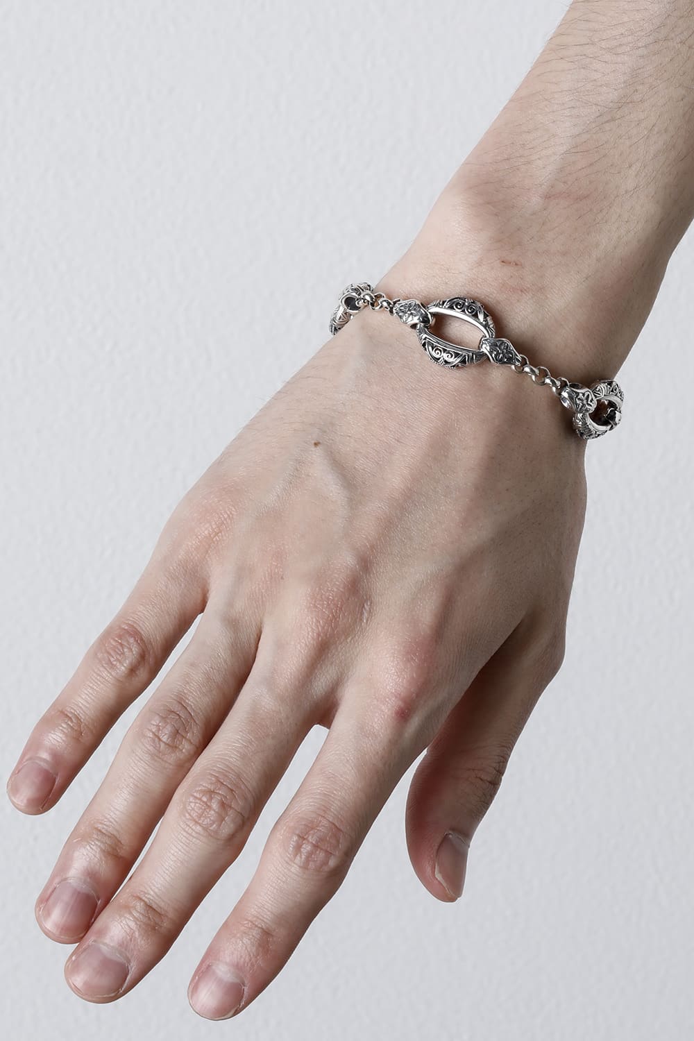 This toggle-type bracelet features three design chain motifs. The three large chain motifs are decorated with the brand's signature openwork design, and although the specific weight is lighter than the apparent volume, the delicate design allows the other side to show through, making it impossible to tell how the bracelet was made. Compared to GB1, which is almost the same model, the chain motif is even larger, and the round can for the toggle is plainly designed. The original toggle and the delicate Byzantine-style carving pattern make this a very high quality piece of jewelry. Please feel free to contact us for any size orders you may have.