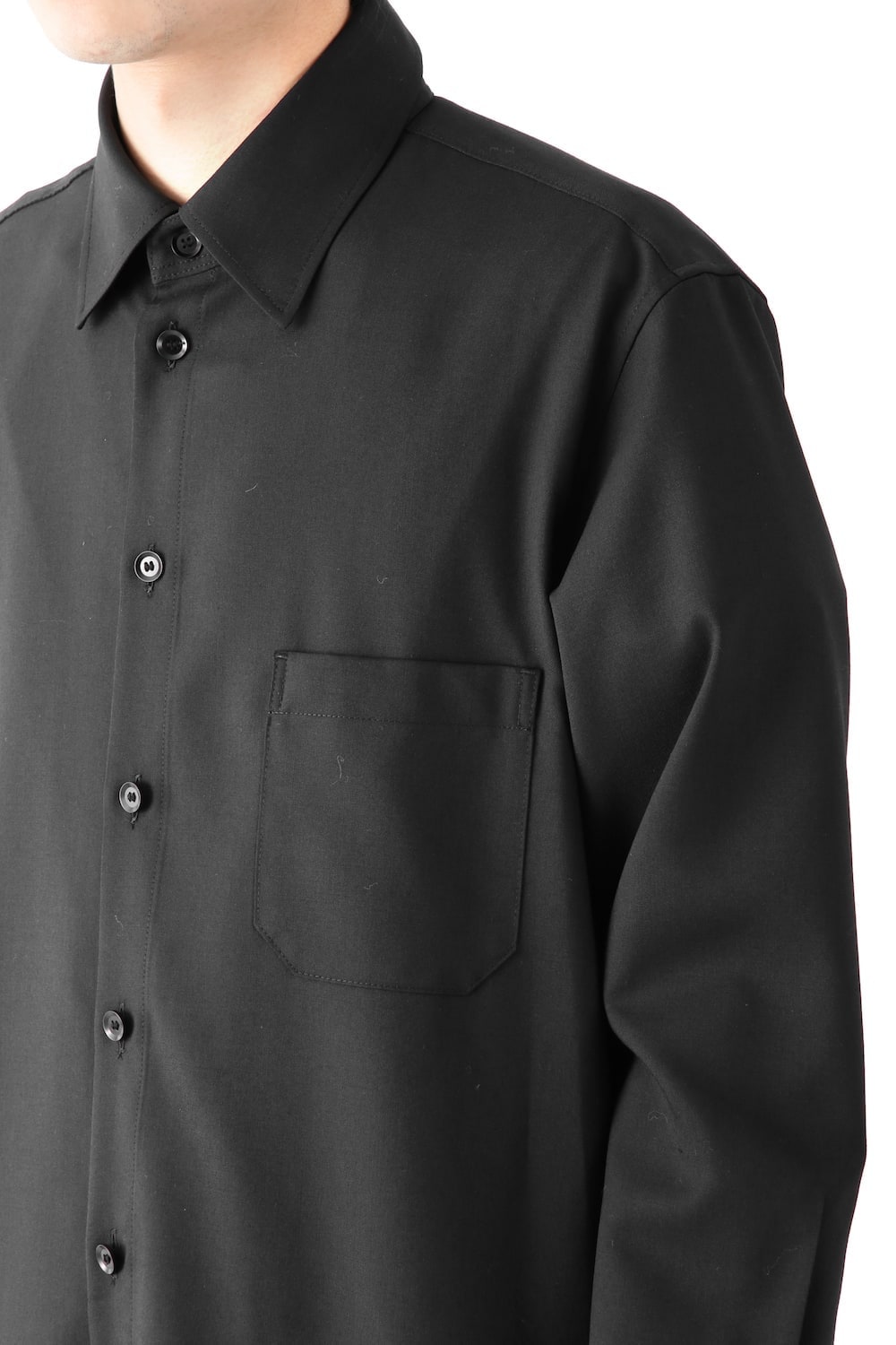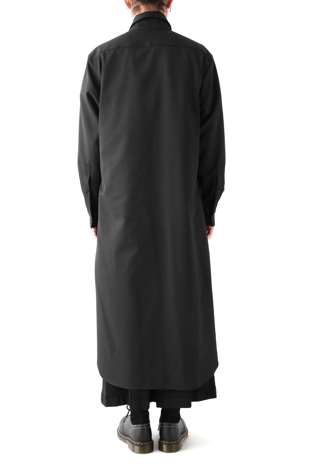 Classic wool / polyester fabric. It is a durable fabric with unique gloss and beautiful drape. A piece that combines a shirt and a dress, you can use it as a light outer layer. Refreshing silhouette of A line with a unisex look.