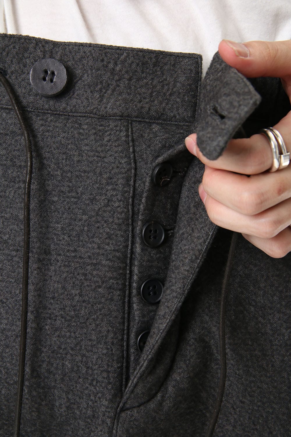 · It has a deep rise and there is clearance around the hips, it has a silhouette with sharpness that is set from under the knee. The pattern also makes it easier to bend the knees. For the waist button, it is made with a cordovan hand-made button.