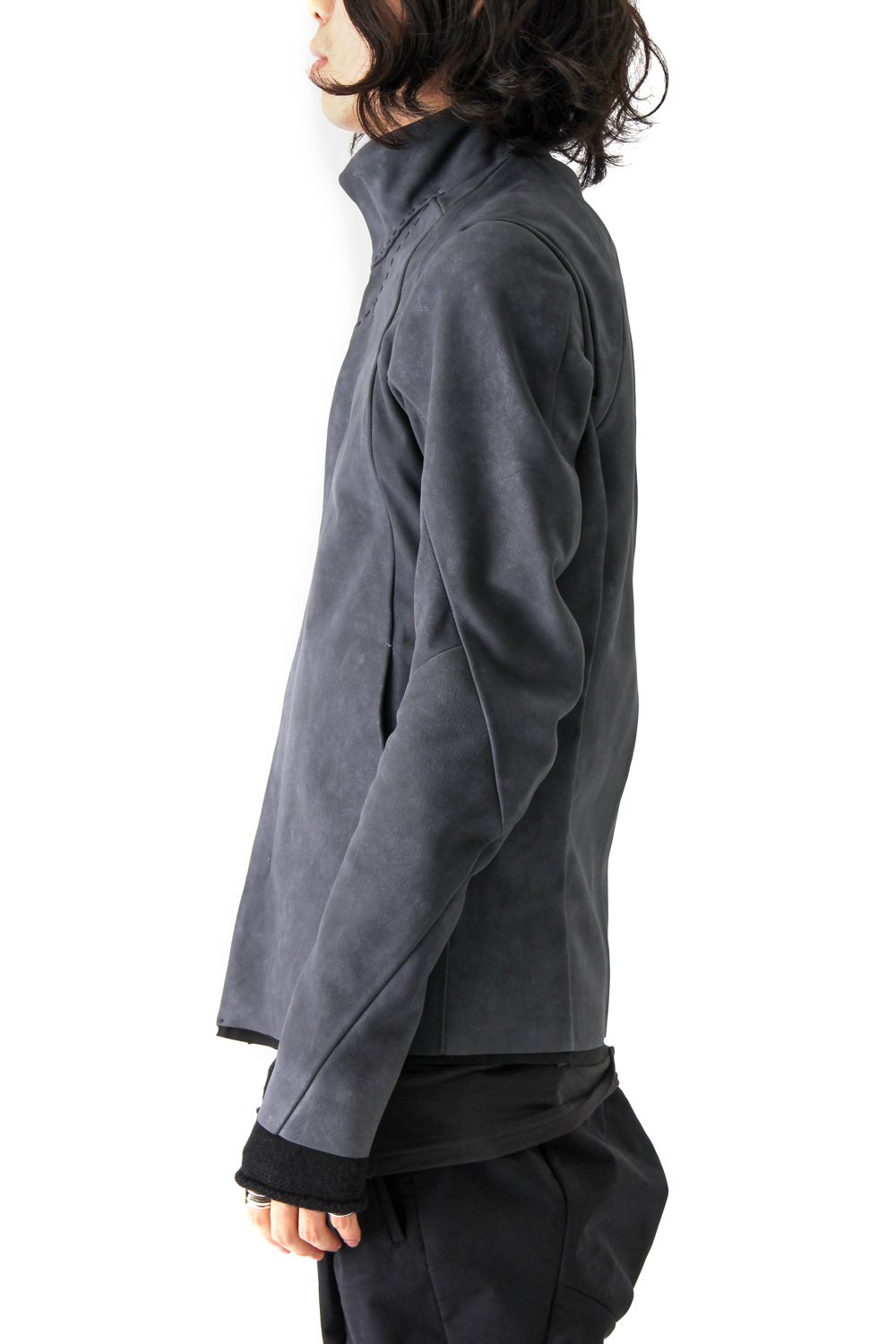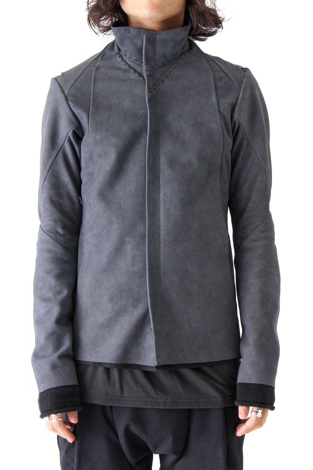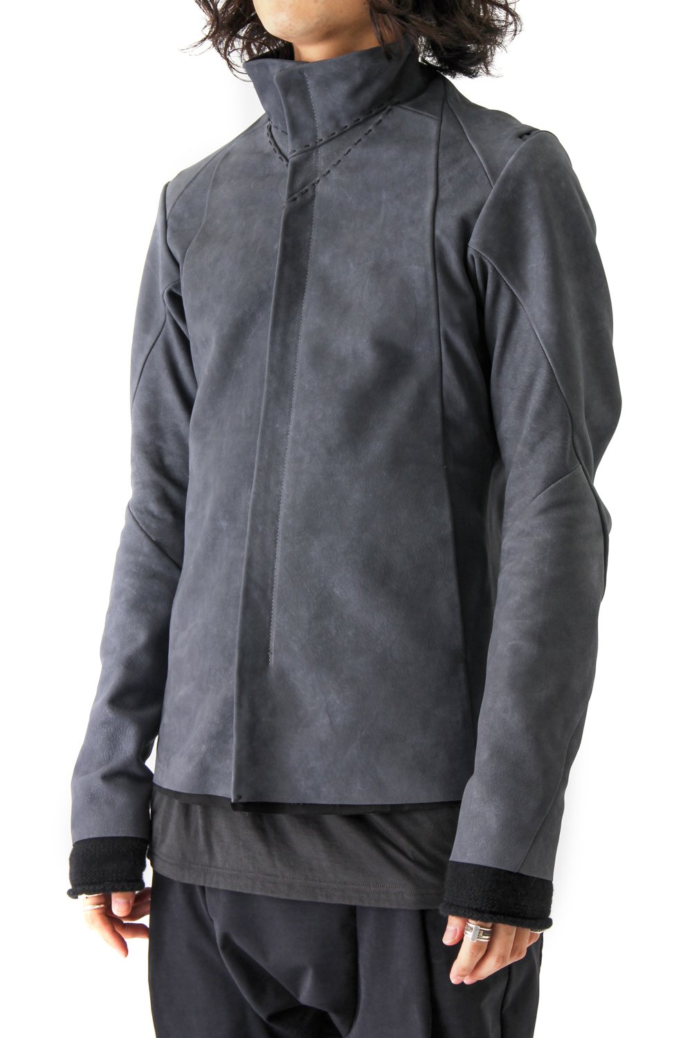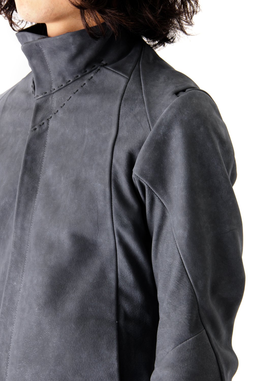Jacket made with white pigment finishing special order Italian tanned calf leather. Except for the armpit front part, the side panel and the elbow part it is made with a 1.3mm leather. The armpit front part, the side panel and the elbow part are thinner to give a nice mobility to this piece. The pattern on the sleeve hem is a special pattern made with the Yamamoto company rubber. It gives this jacket a great stretch for a superb comfort. So the fabric volume on the back was reduced for a nice silhouette. The collar area has hand stitches for a good design point.