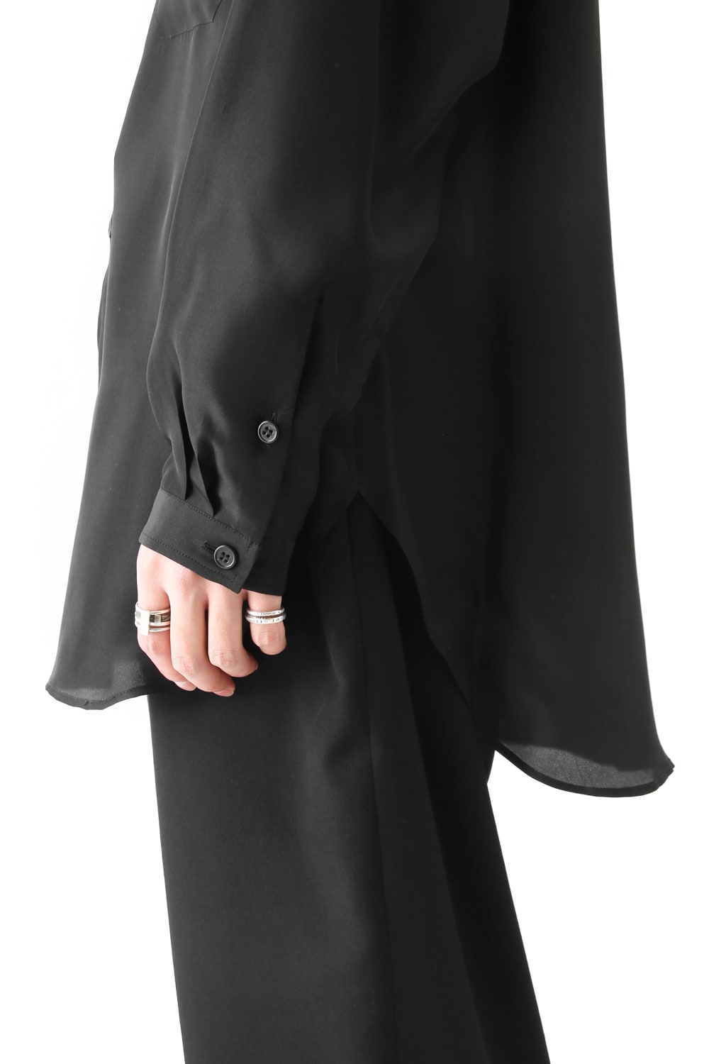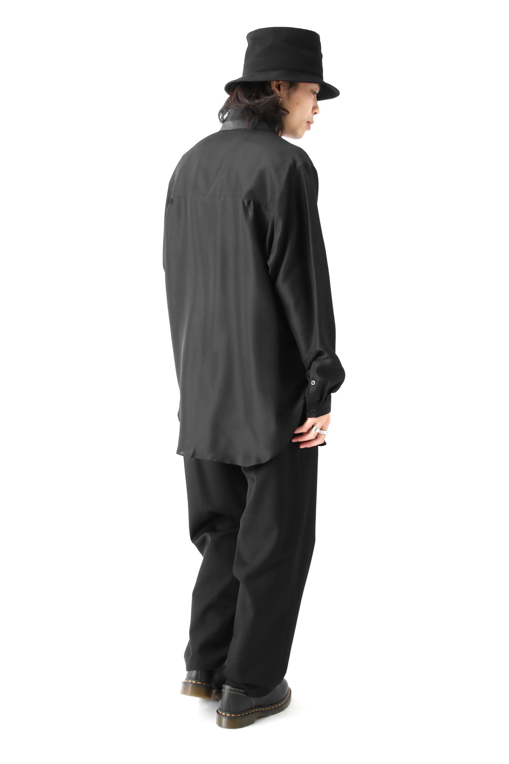 This silk shirt features a design that has a hidden two-tone collar by using the elegant luster and collar back button. This piece was worn on the runway LOOK 9 as well. This is highly recommended for those who do not particularly like shirts in the broad fabric as this silk on is of a very light fabric that is soft and flowy. The base of this piece is simple at first glance, but the cuffs have a narrow width and the tuck under the yoke has given this piece an added design element.