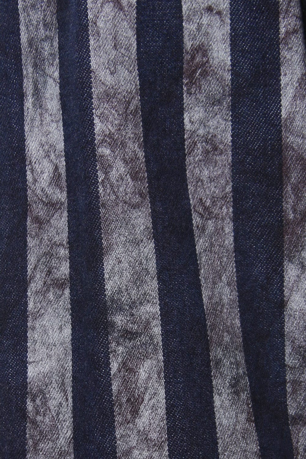 This shirt jacket is characterised by the stripe pattern of the sleeves that was worn during the runway LOOK 11. The linen material is switched to cotton fabric making it a light weight jacket with no lining. The stripe part of the sleeve is accented with the zipper design on the lapel part with a texture like uneven dying.
