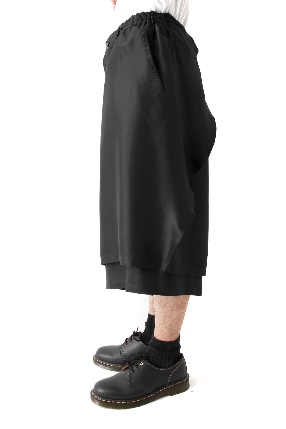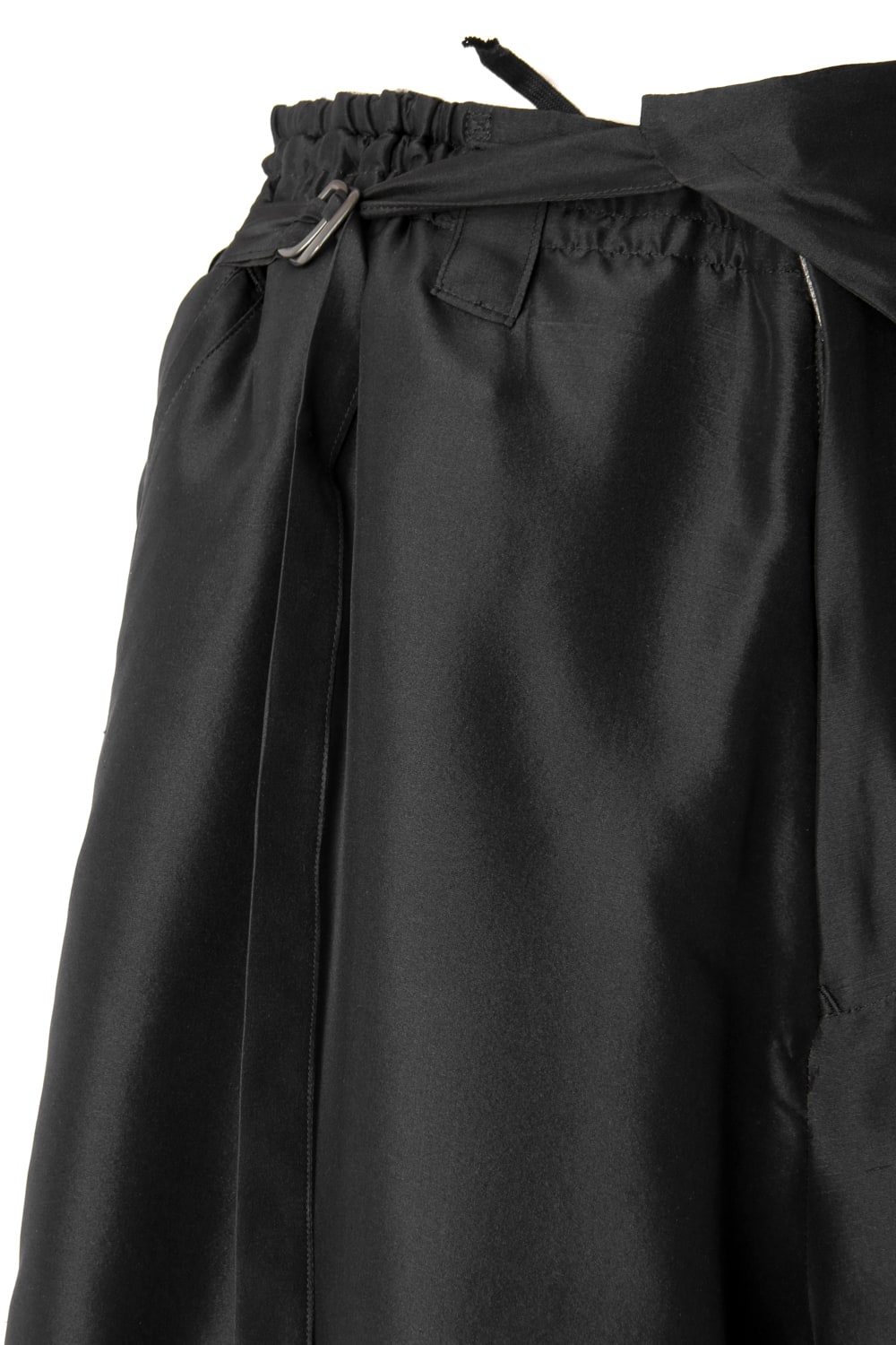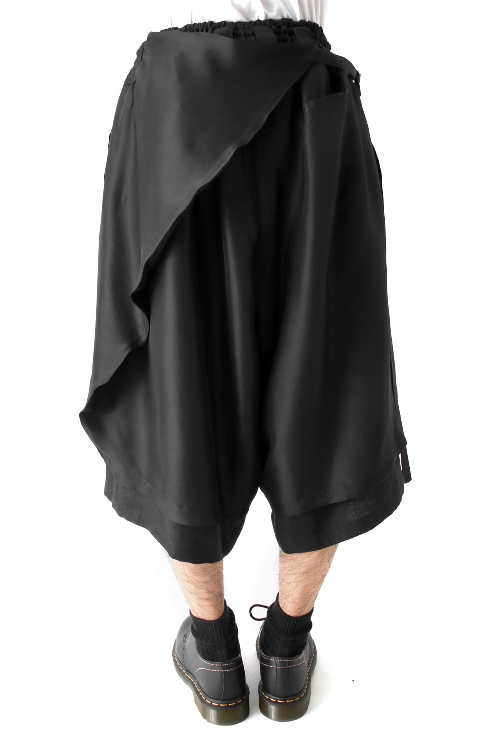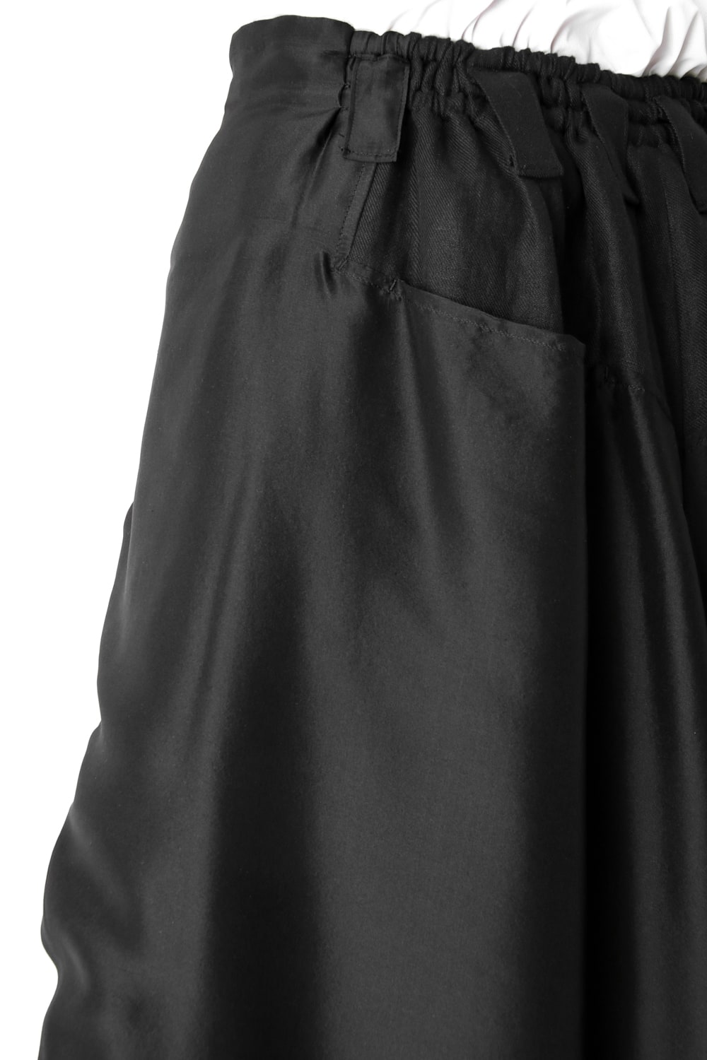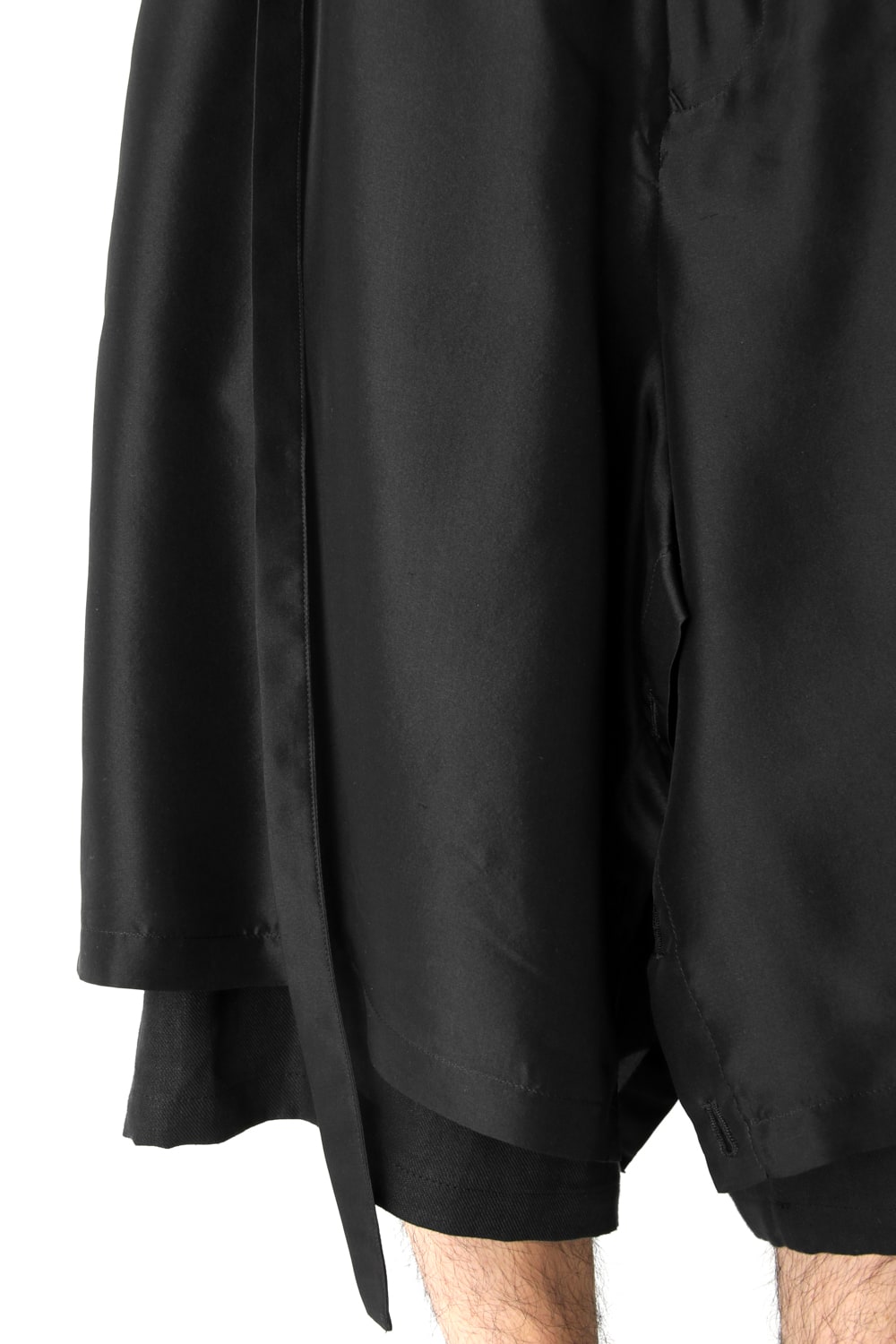 This new type of wrap pants has a 2 piece material of an elegant silk and airy linen tailored characteristic. By opening and closing the button of the inseam, it is possible to use the 2 layered pants and wrap pants 2 way specifications, the wrap parts extending from the left side can be brought forward or backward.