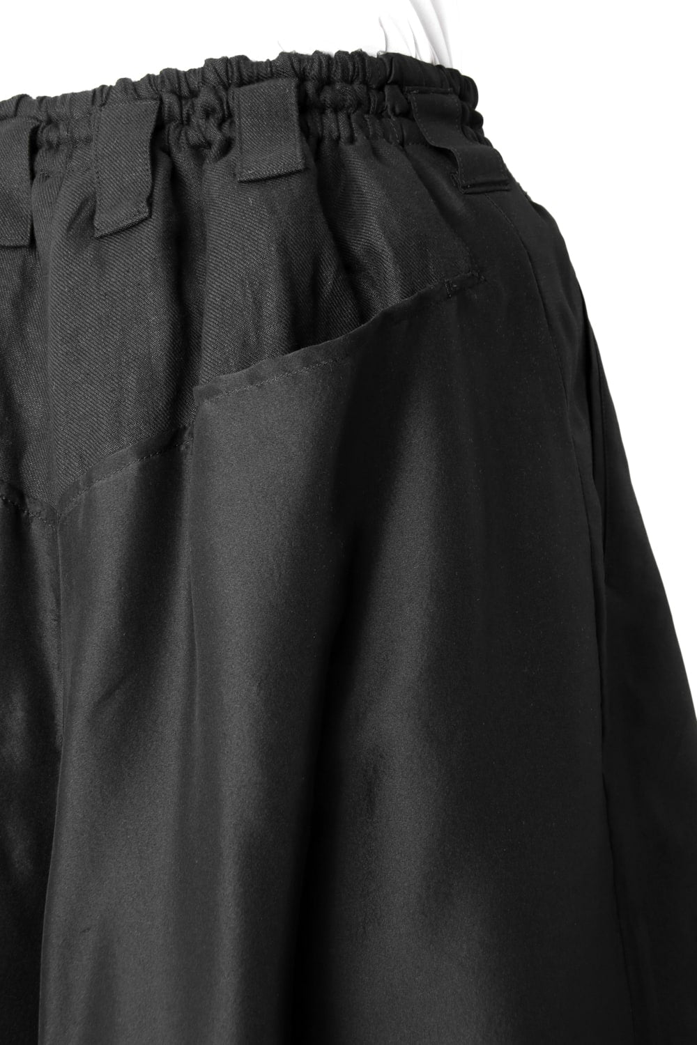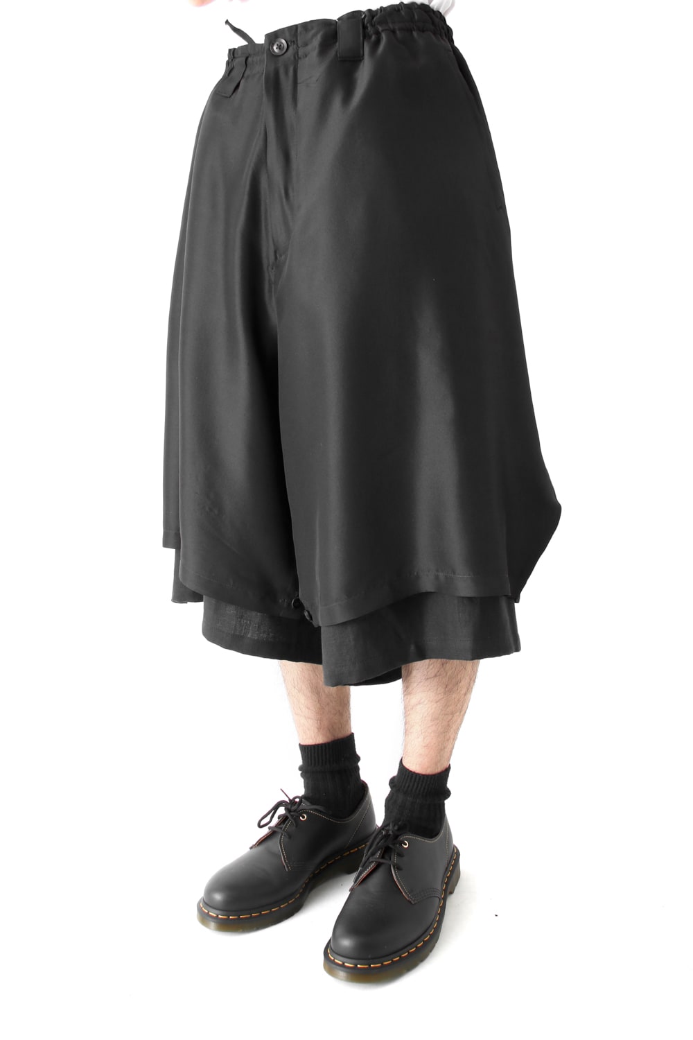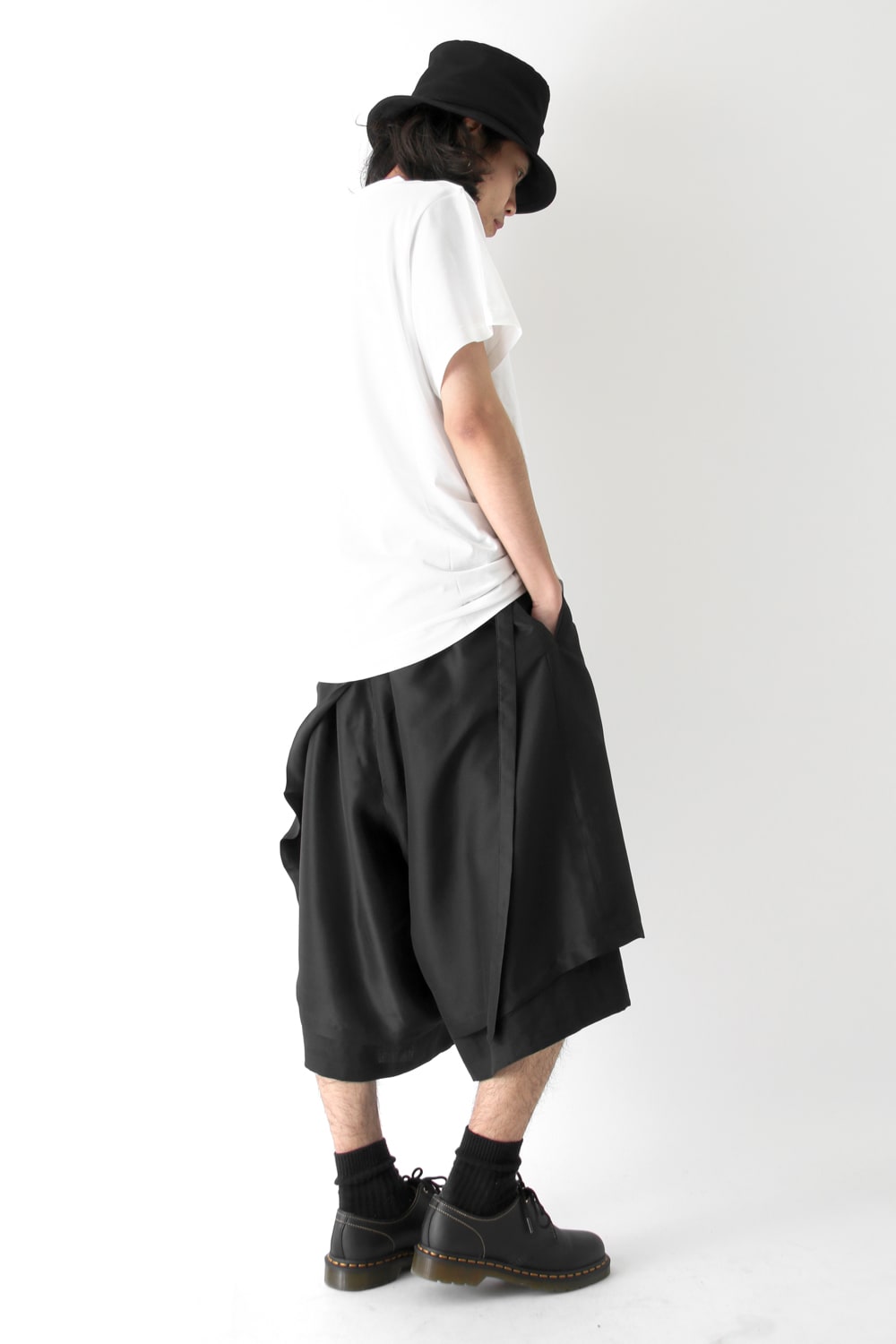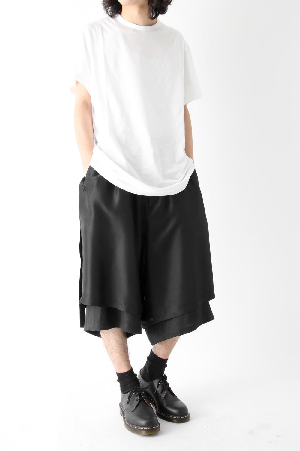 This new type of wrap pants has a 2 piece material of an elegant silk and airy linen tailored characteristic. By opening and closing the button of the inseam, it is possible to use the 2 layered pants and wrap pants 2 way specifications, the wrap parts extending from the left side can be brought forward or backward.
