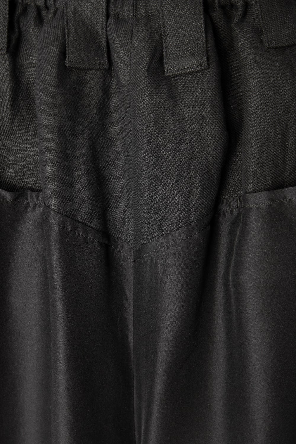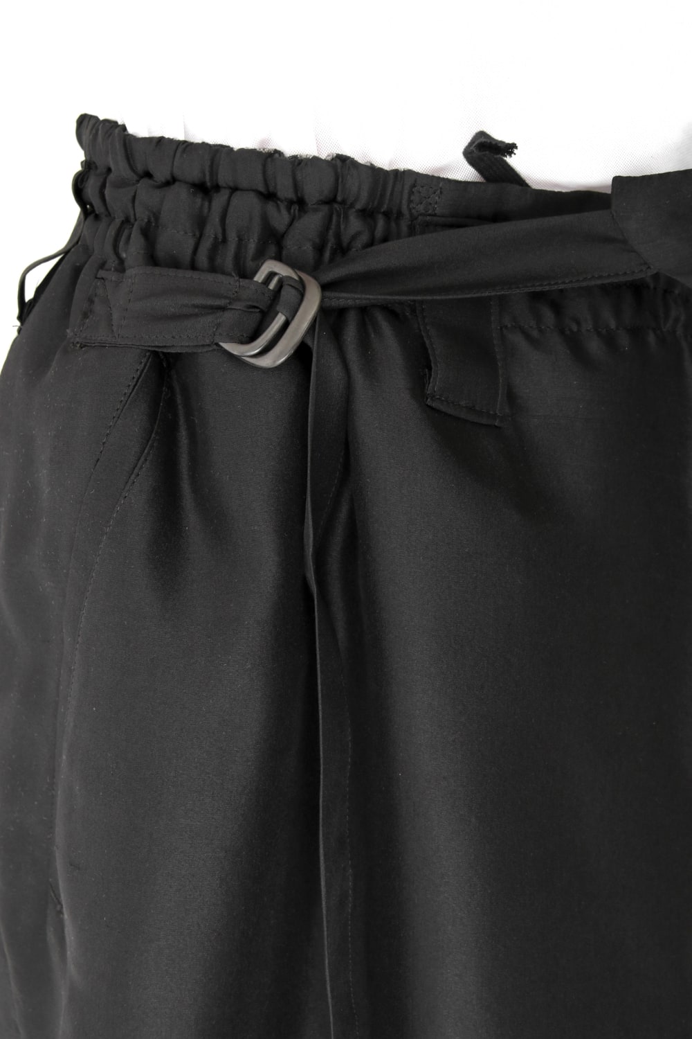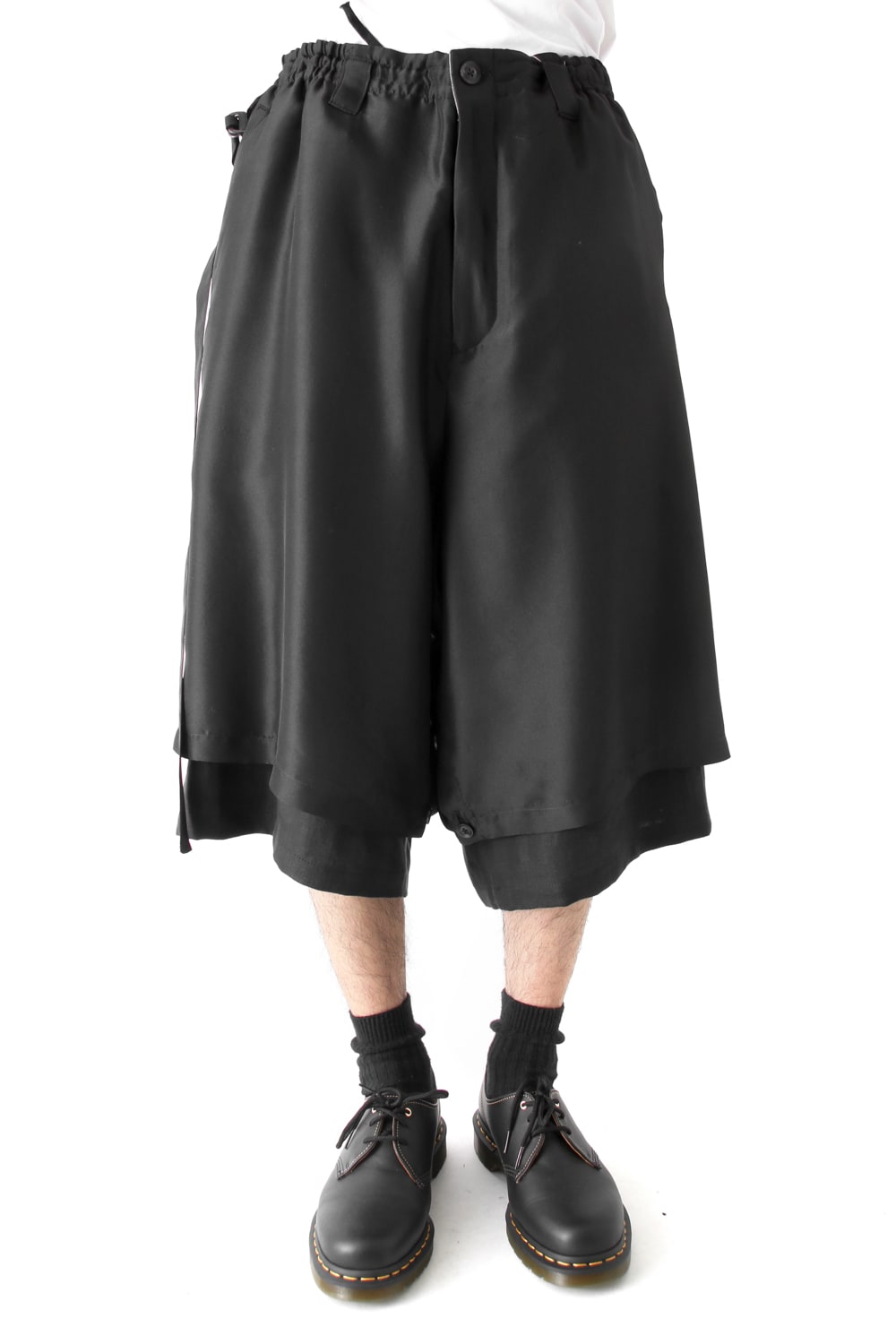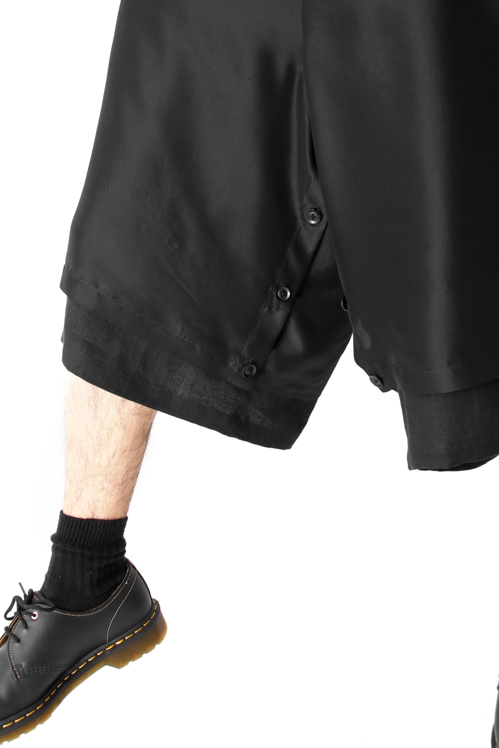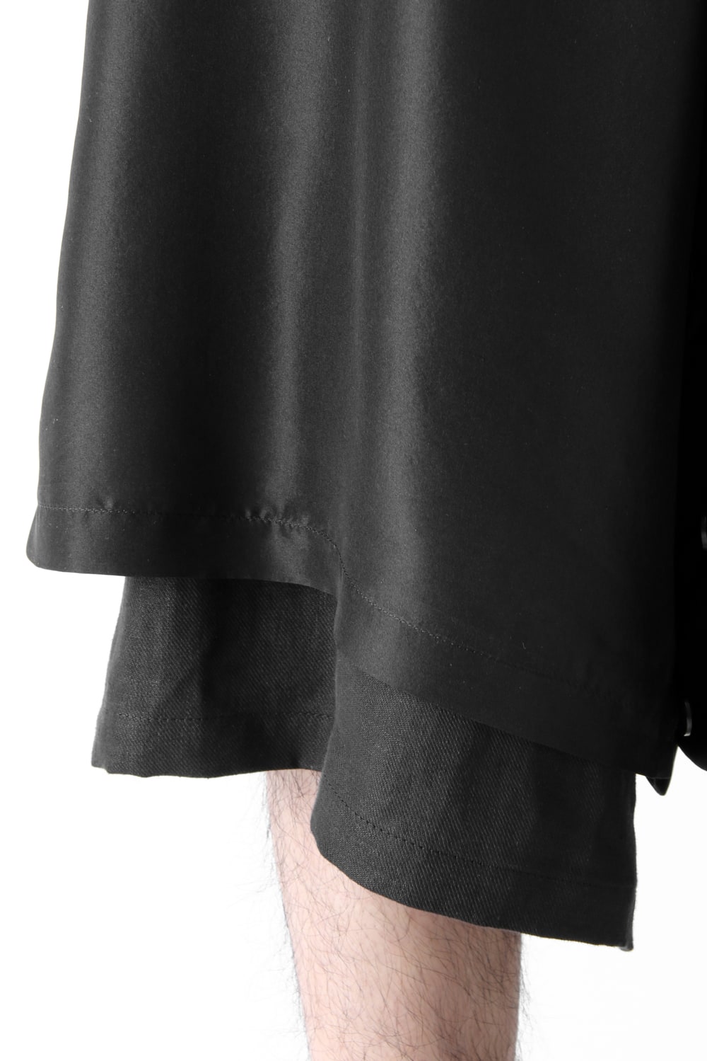 This new type of wrap pants has a 2 piece material of an elegant silk and airy linen tailored characteristic. By opening and closing the button of the inseam, it is possible to use the 2 layered pants and wrap pants 2 way specifications, the wrap parts extending from the left side can be brought forward or backward.