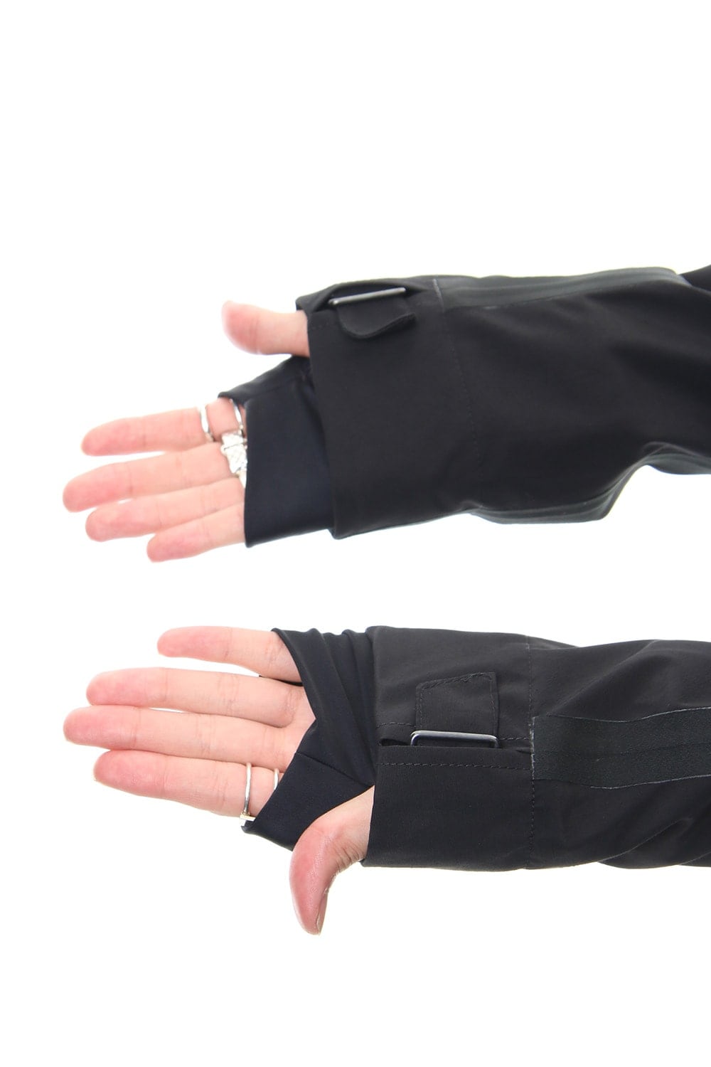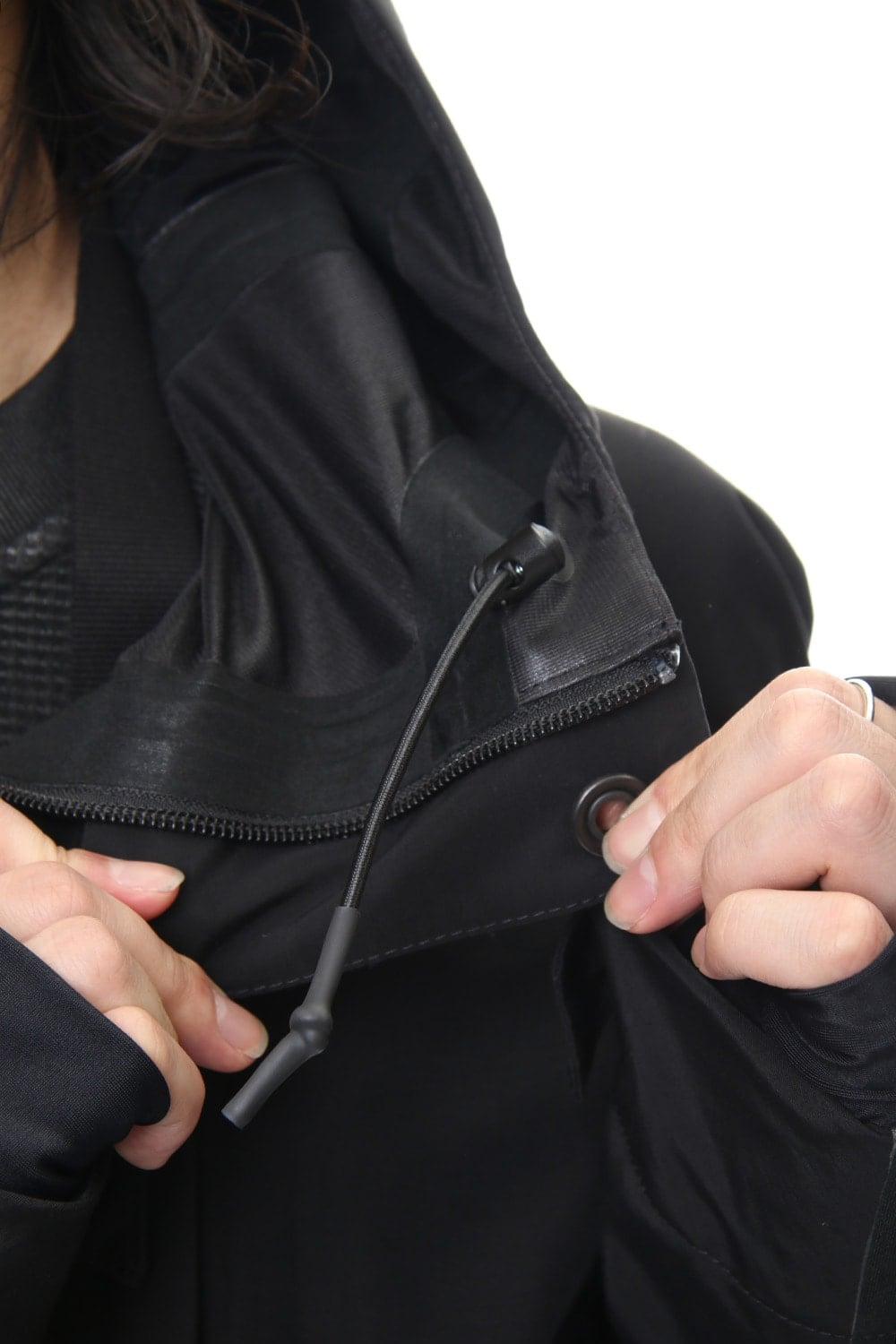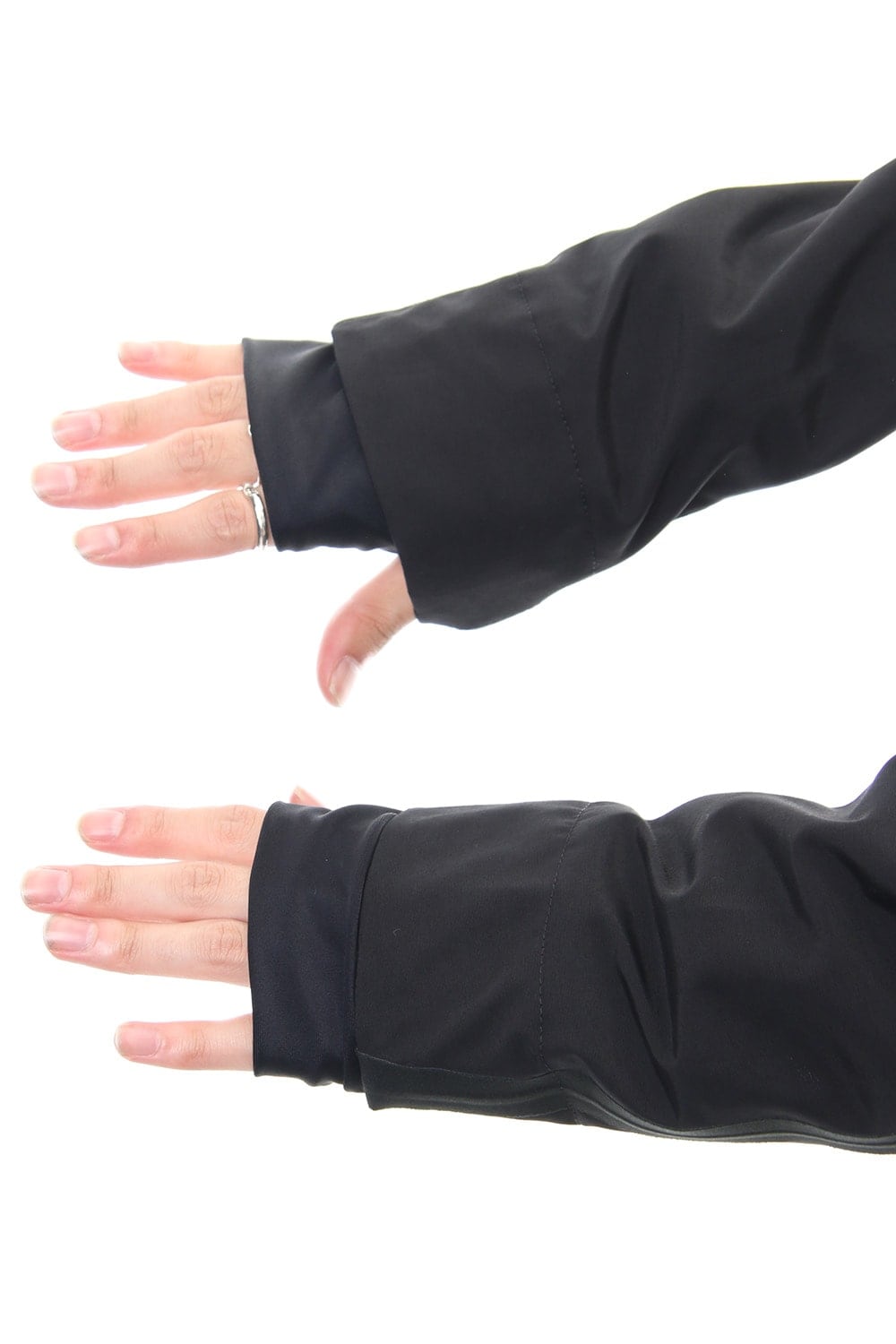 The neck part is finished in a high neck, the cuffs incorporate a thumb hole and the waist part has a rubber cord that can be adjusted.