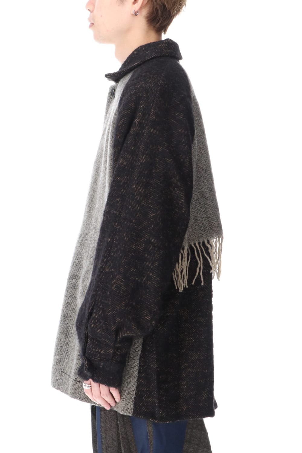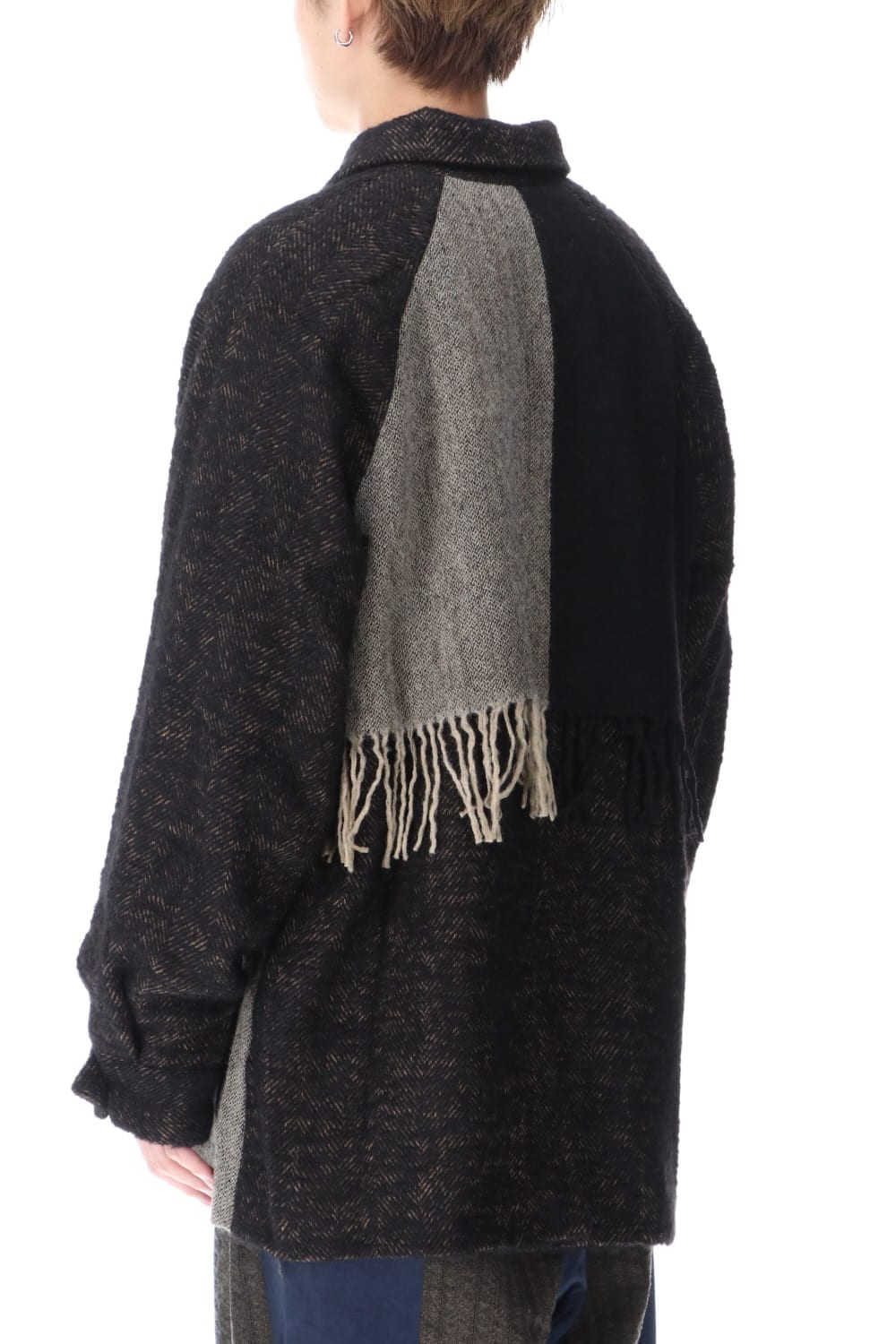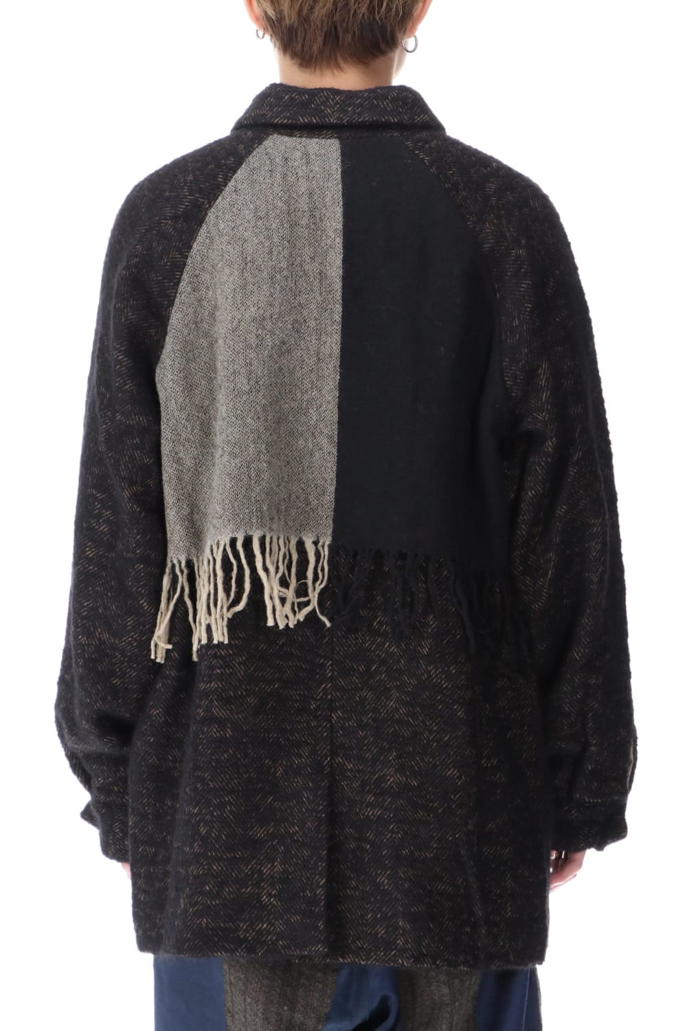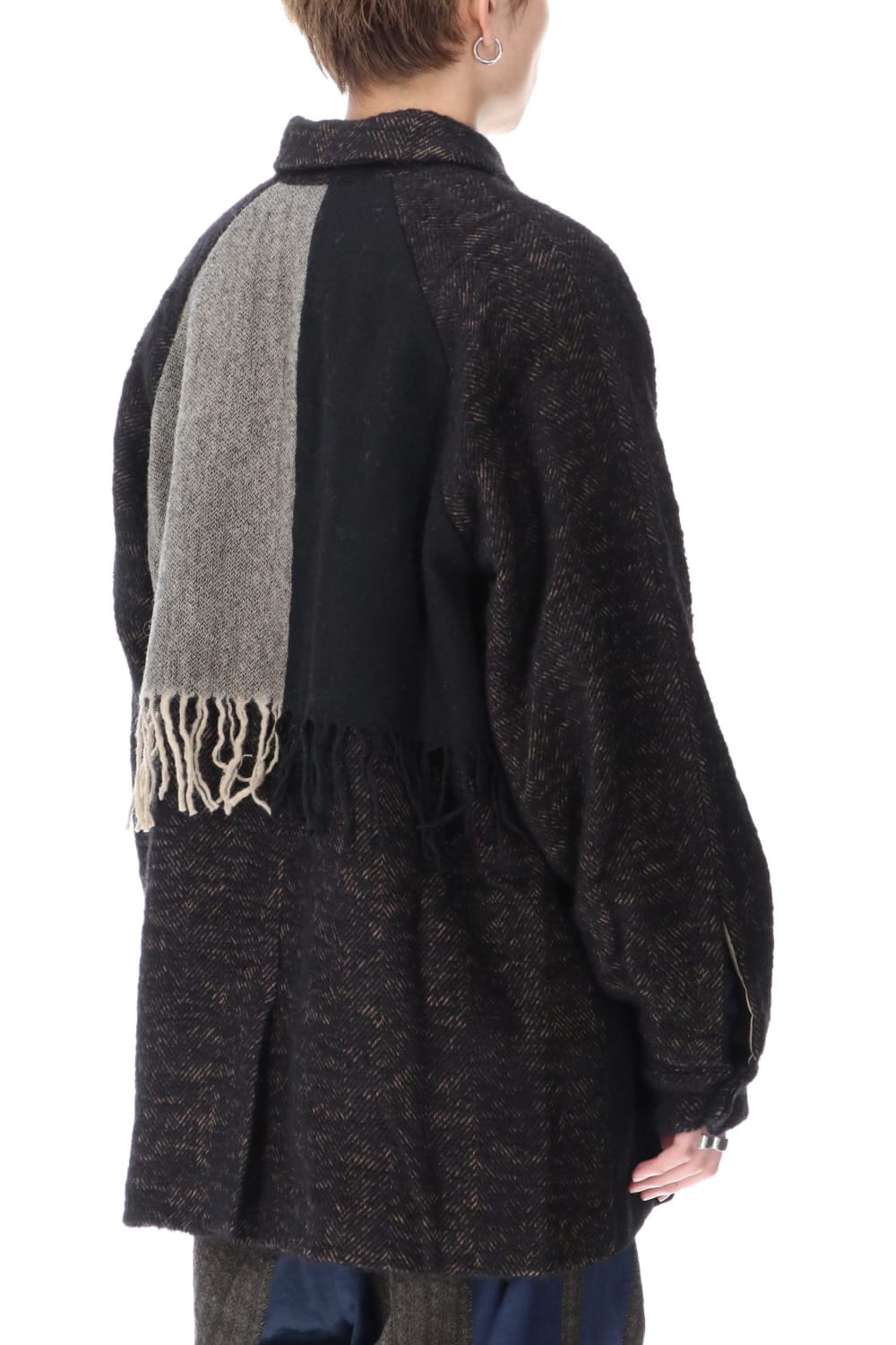 This is an asymmetrical oversizing jacket with randomly switched fabric on each part. The sleeves are made fairly wide with raglan sleeves and the rounded sleeves are formed by tightening at the end of the sleeves. This item is made of soft tweed fabric which is woven all over. The front body and the back body like a scarf are made of the same fabric in different colors. The sleeves and back body are made of herringbone fabric. This item has a very light and stress-free feel and can be worn under a thick knit top.