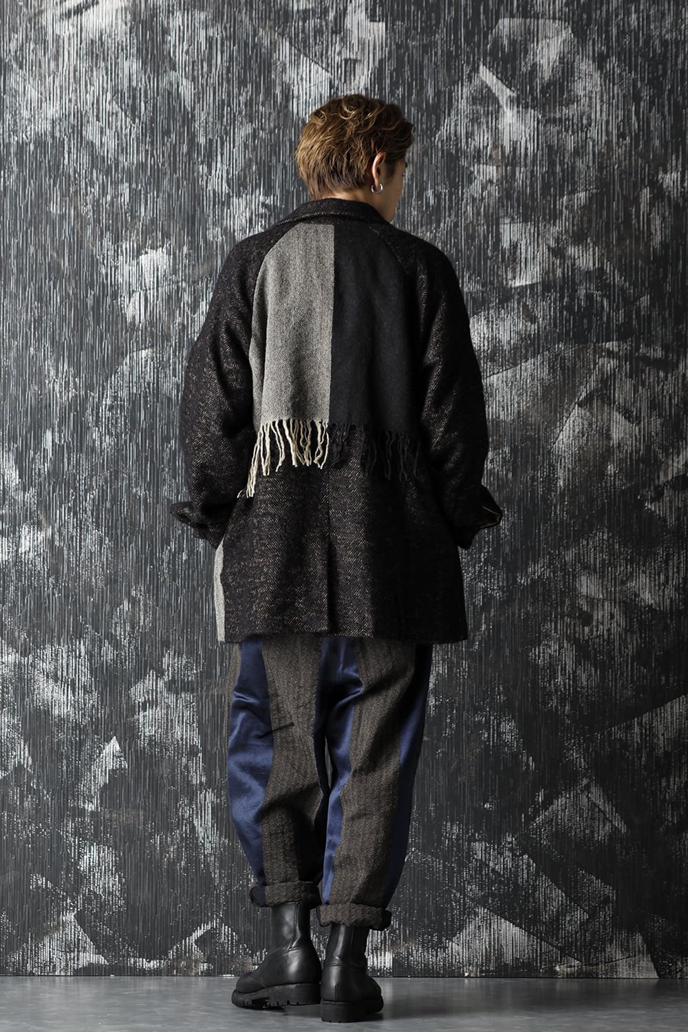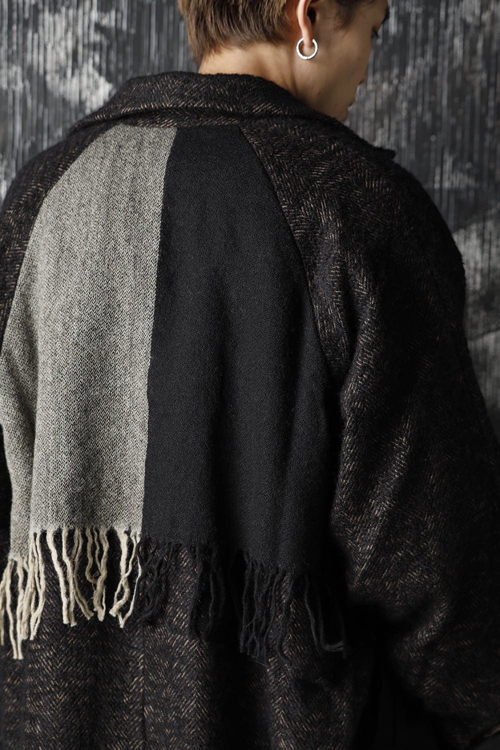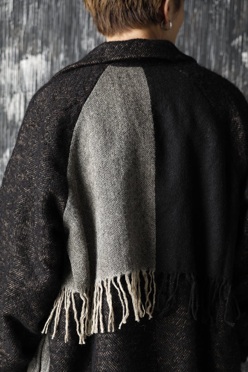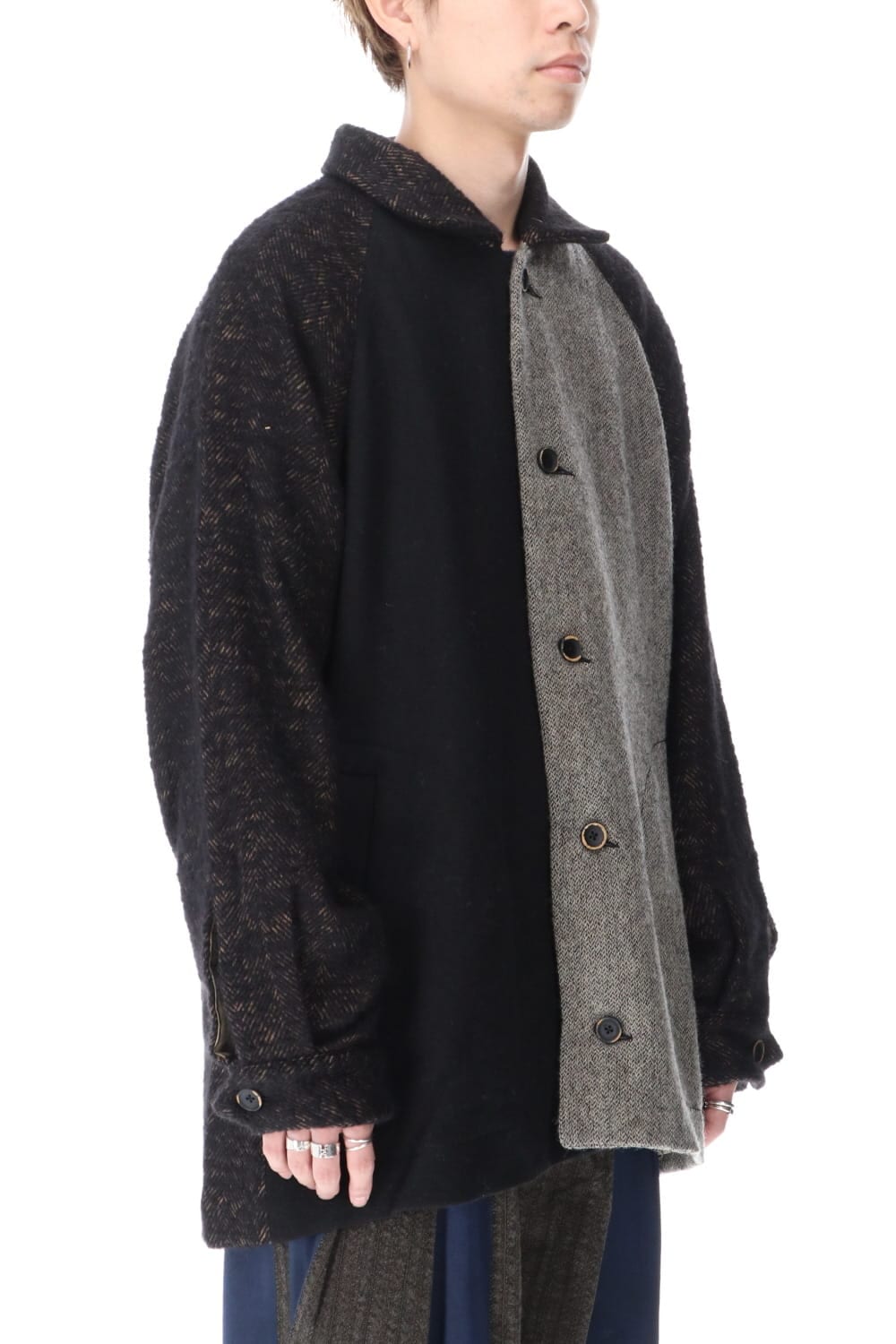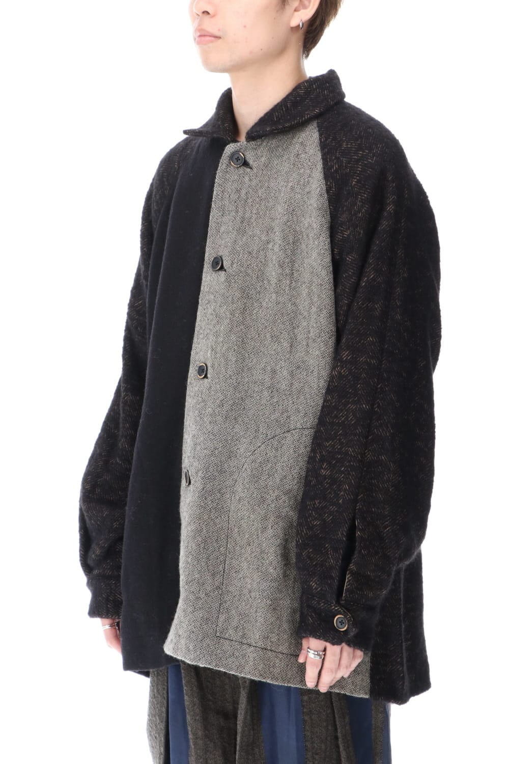 This is an asymmetrical oversizing jacket with randomly switched fabric on each part. The sleeves are made fairly wide with raglan sleeves and the rounded sleeves are formed by tightening at the end of the sleeves. This item is made of soft tweed fabric which is woven all over. The front body and the back body like a scarf are made of the same fabric in different colors. The sleeves and back body are made of herringbone fabric. This item has a very light and stress-free feel and can be worn under a thick knit top.