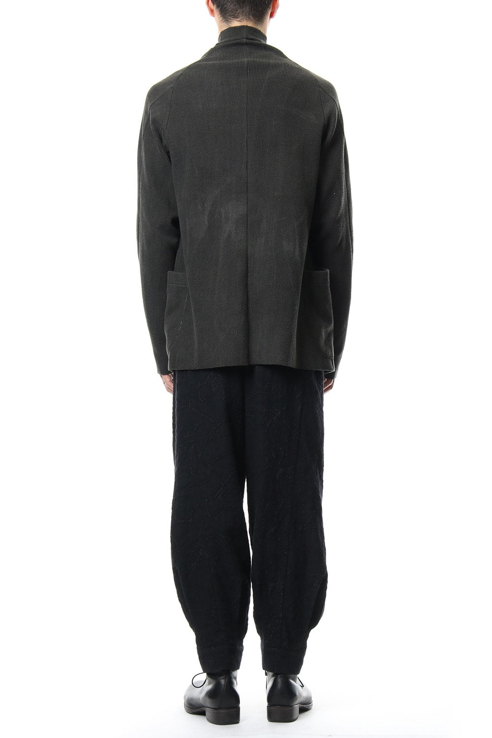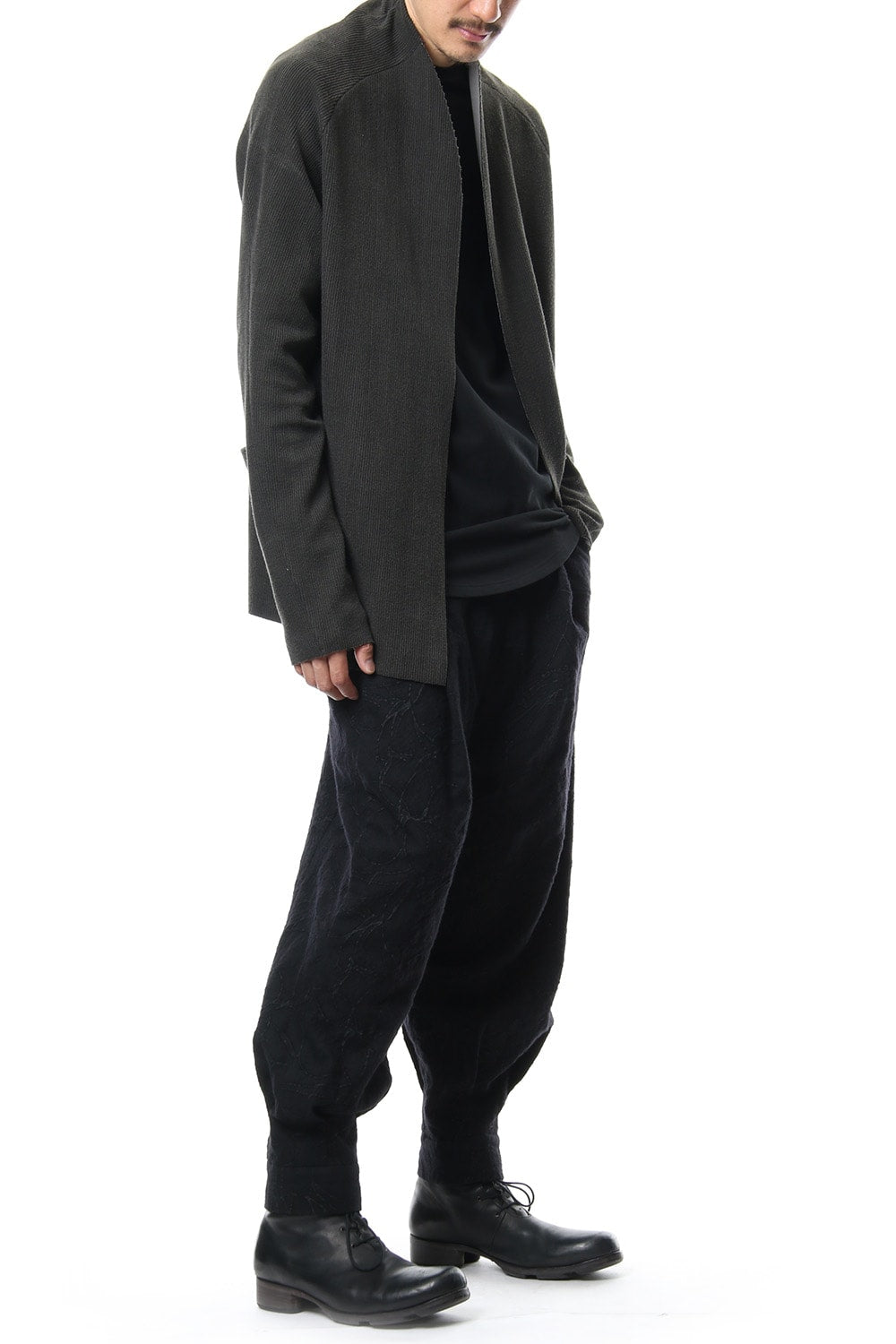 It is designed in a way that cotton is used on the front side and nylon on the inside so that sumi-ink dye is applied after fabric production. The sizing is of a little looser silhouette making it possible to wear on top of a jacket. This is the short length type.