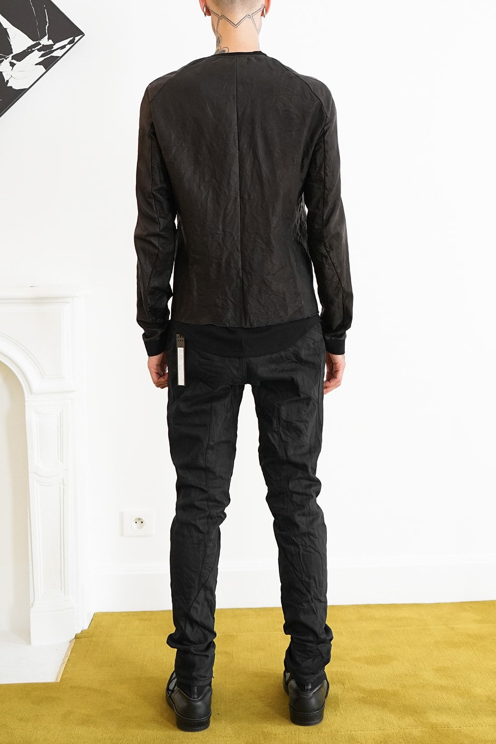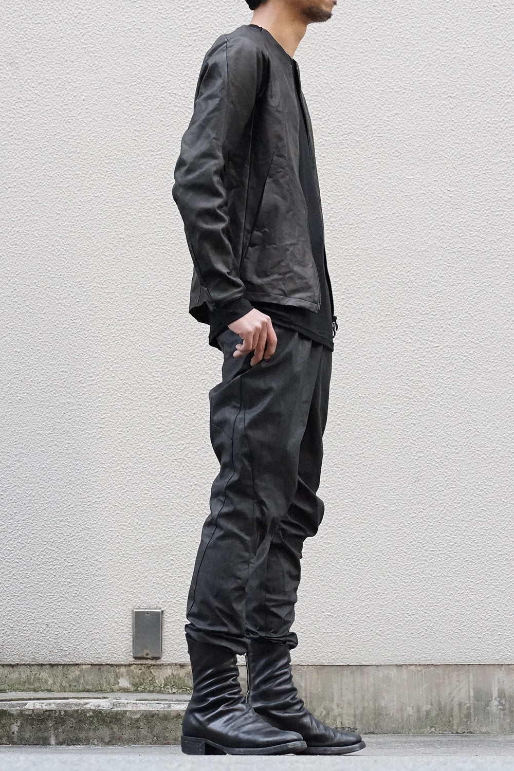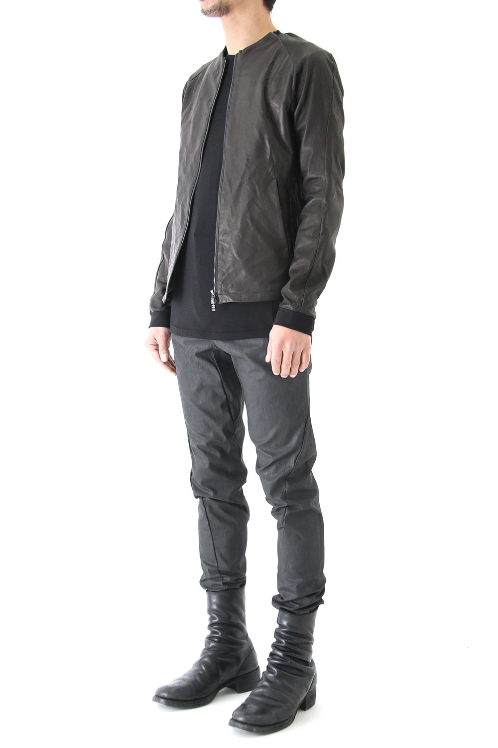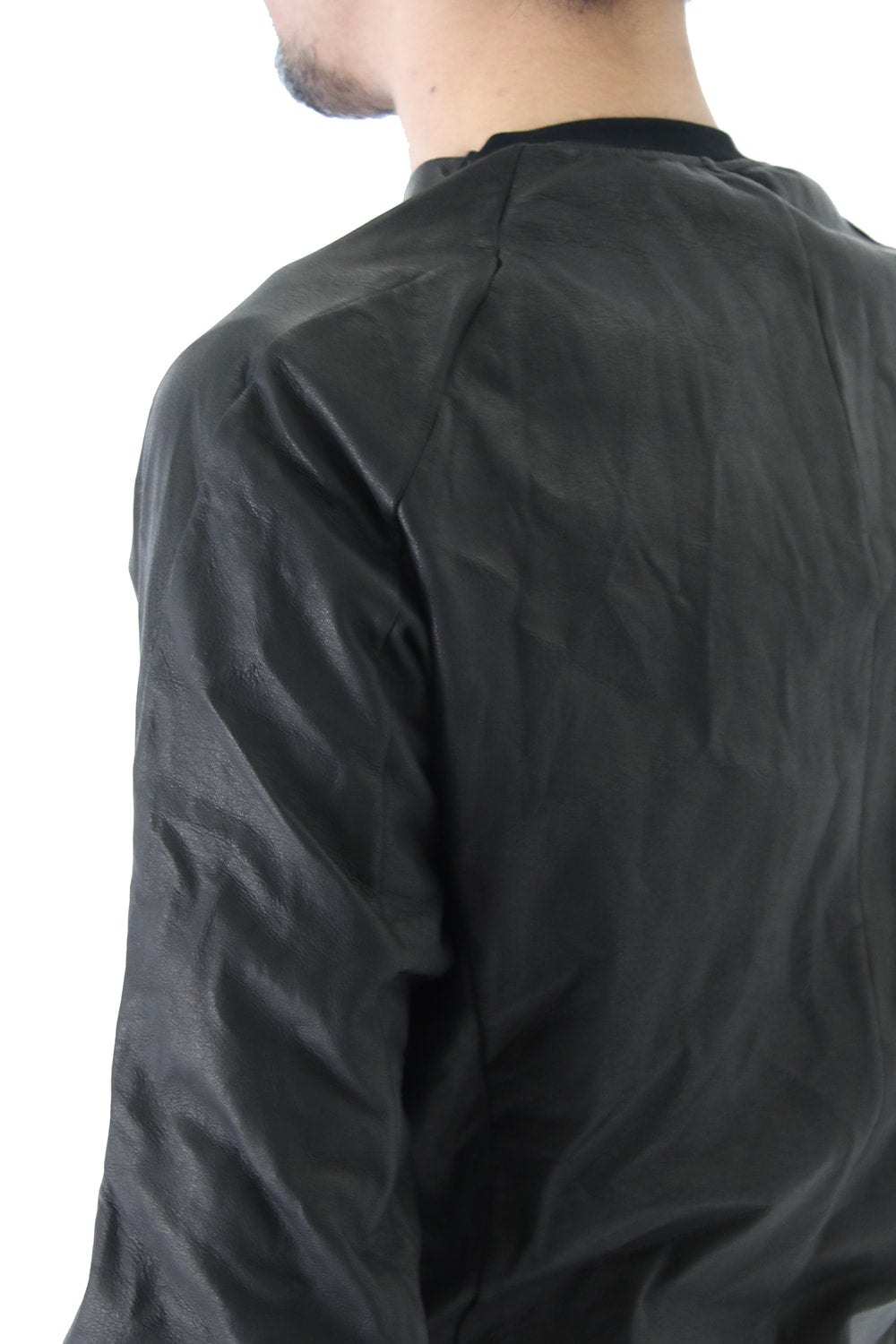The surface is a 0.4mm deer leather, bonded to a SUVIN cotton jersey. To use the material characteristics, it was sewn the same way as for a cut-sew, it is light and can be used as an inner for a coat. It has a superb stretch, is light and great to use during Spring.