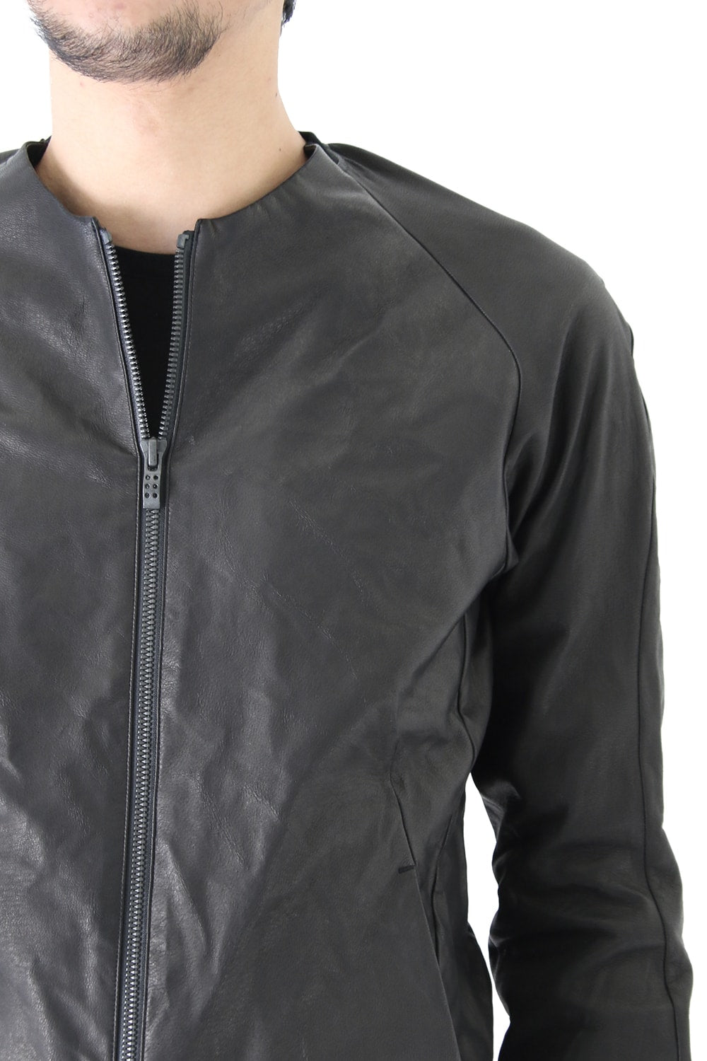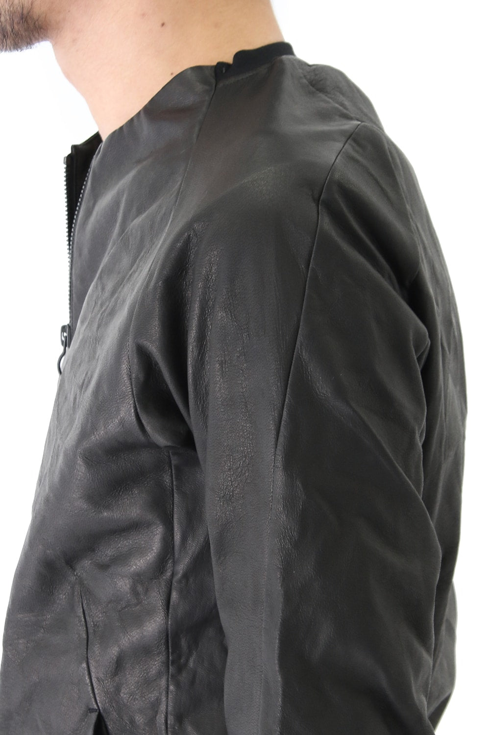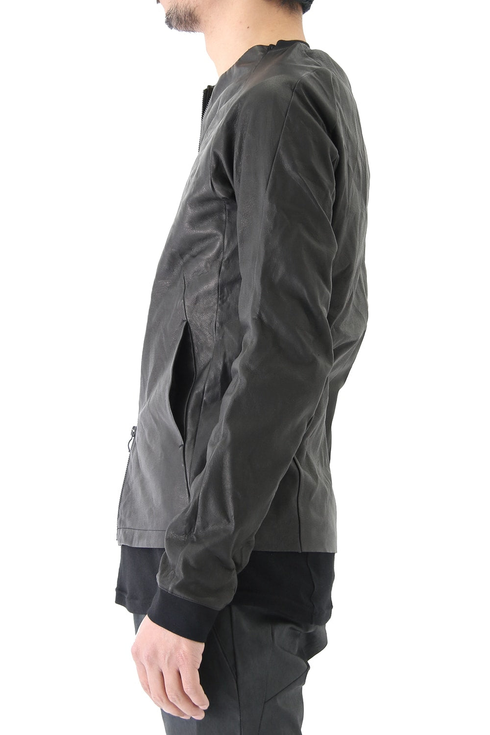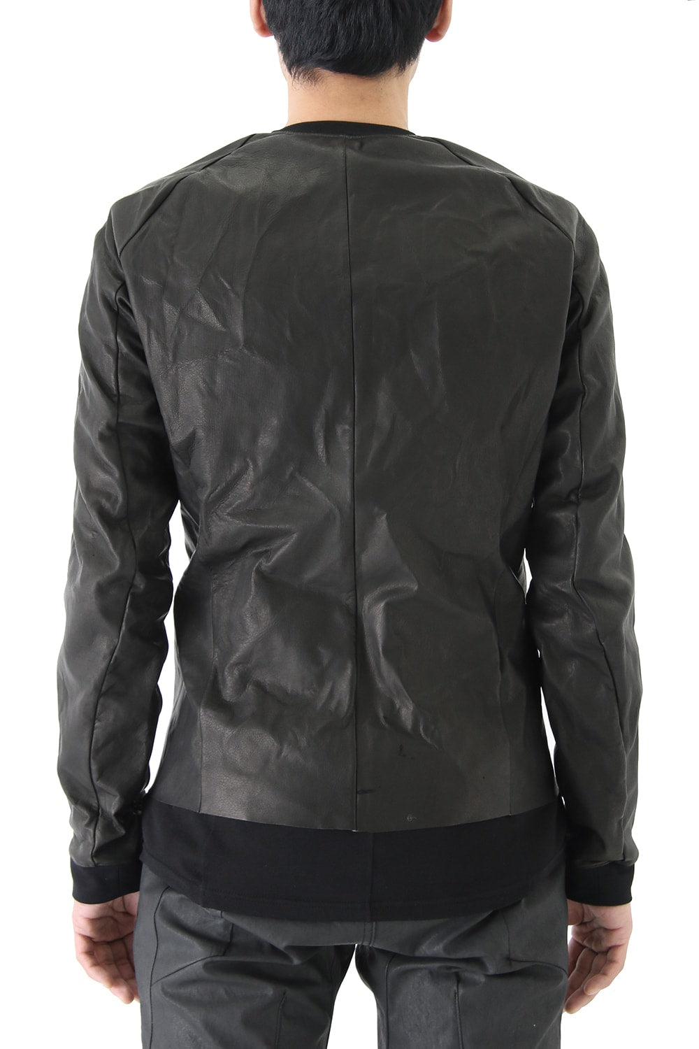 The surface is a 0.4mm deer leather, bonded to a SUVIN cotton jersey. To use the material characteristics, it was sewn the same way as for a cut-sew, it is light and can be used as an inner for a coat. It has a superb stretch, is light and great to use during Spring.