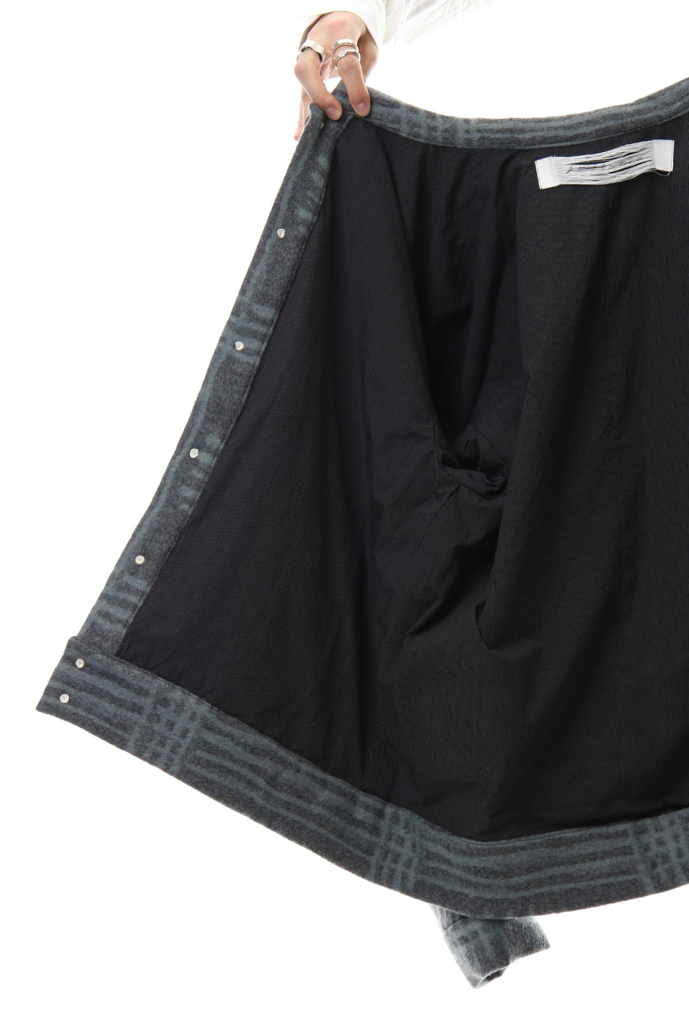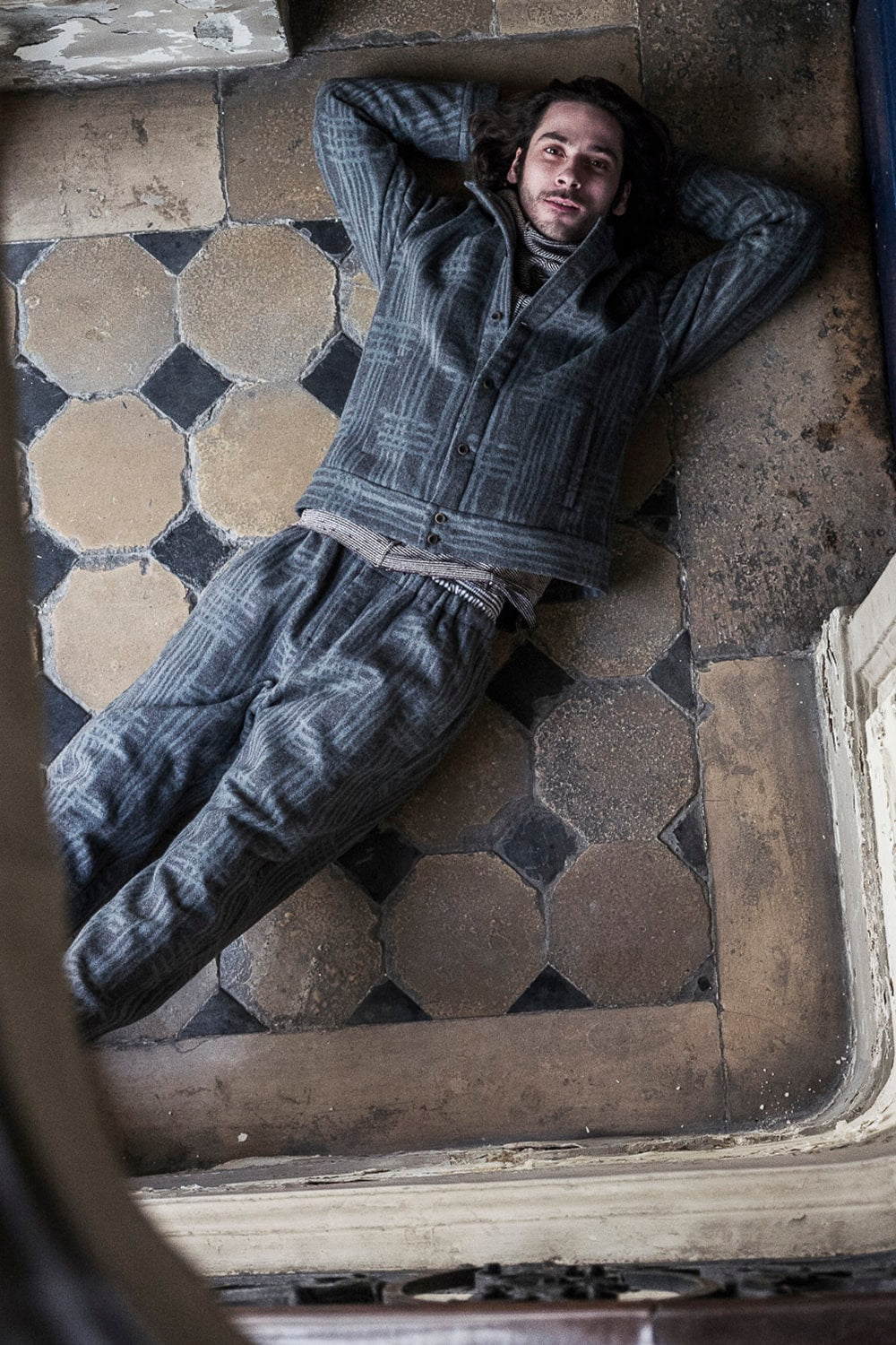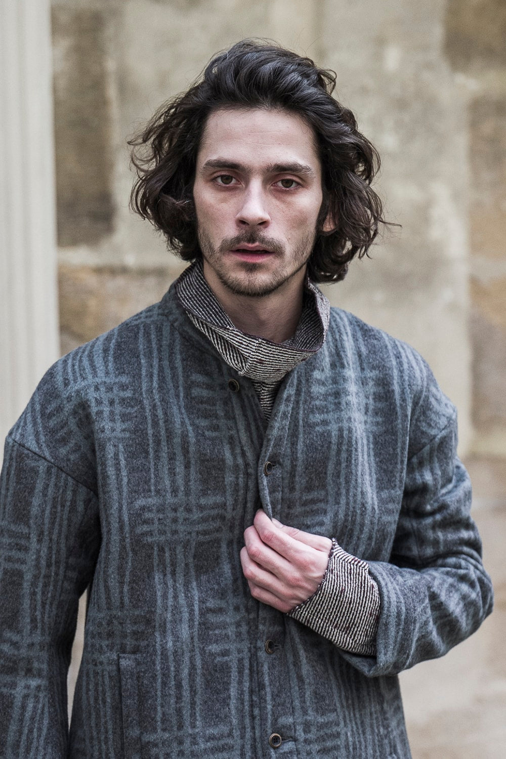 It is a stand collar jacket with distorted lines like hand drawn design. Made with Jacquard woven fabric raised wool cashmere with Beaver finish. Compared to the other jackets of the season, it is produced in a slightly larger sizing.