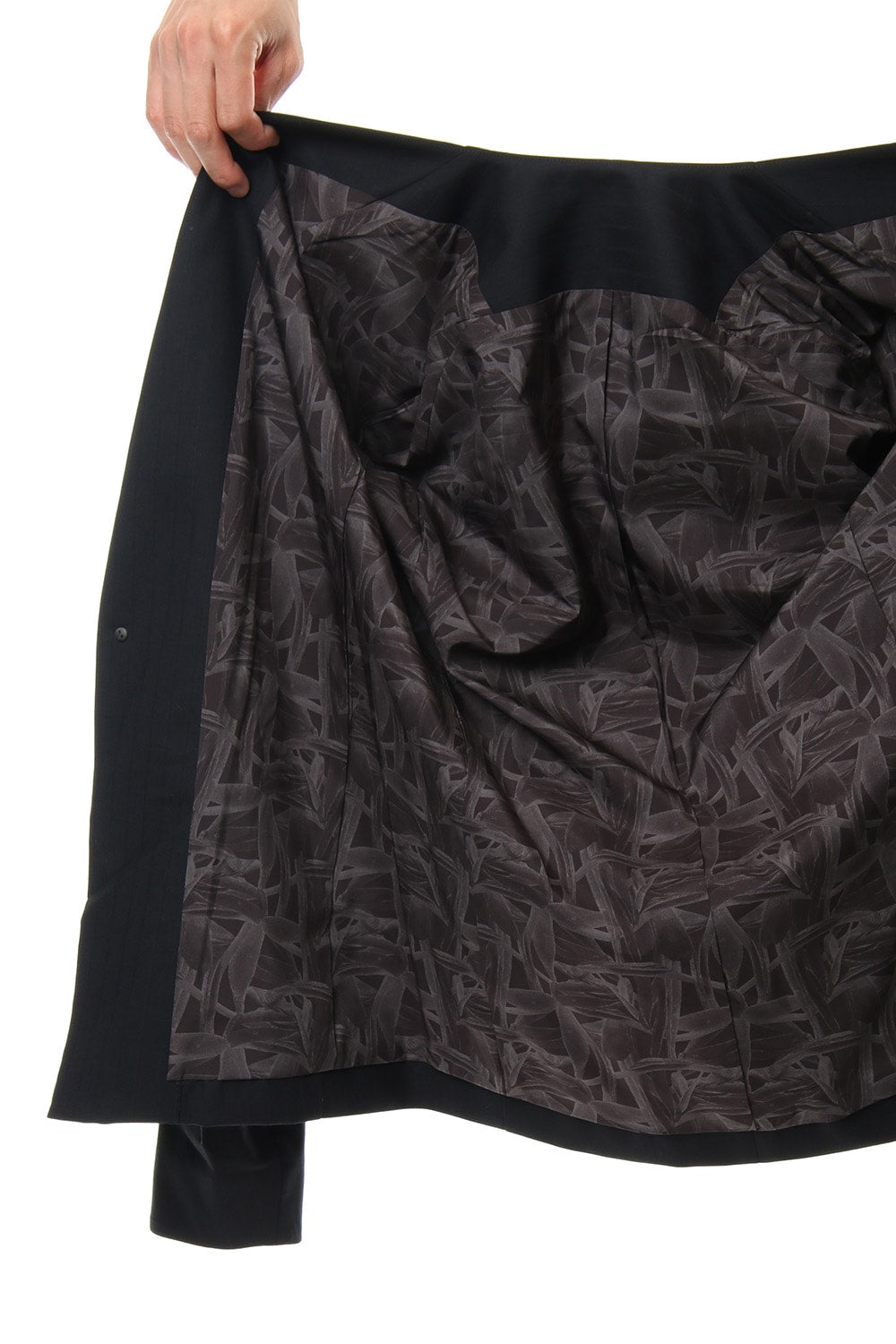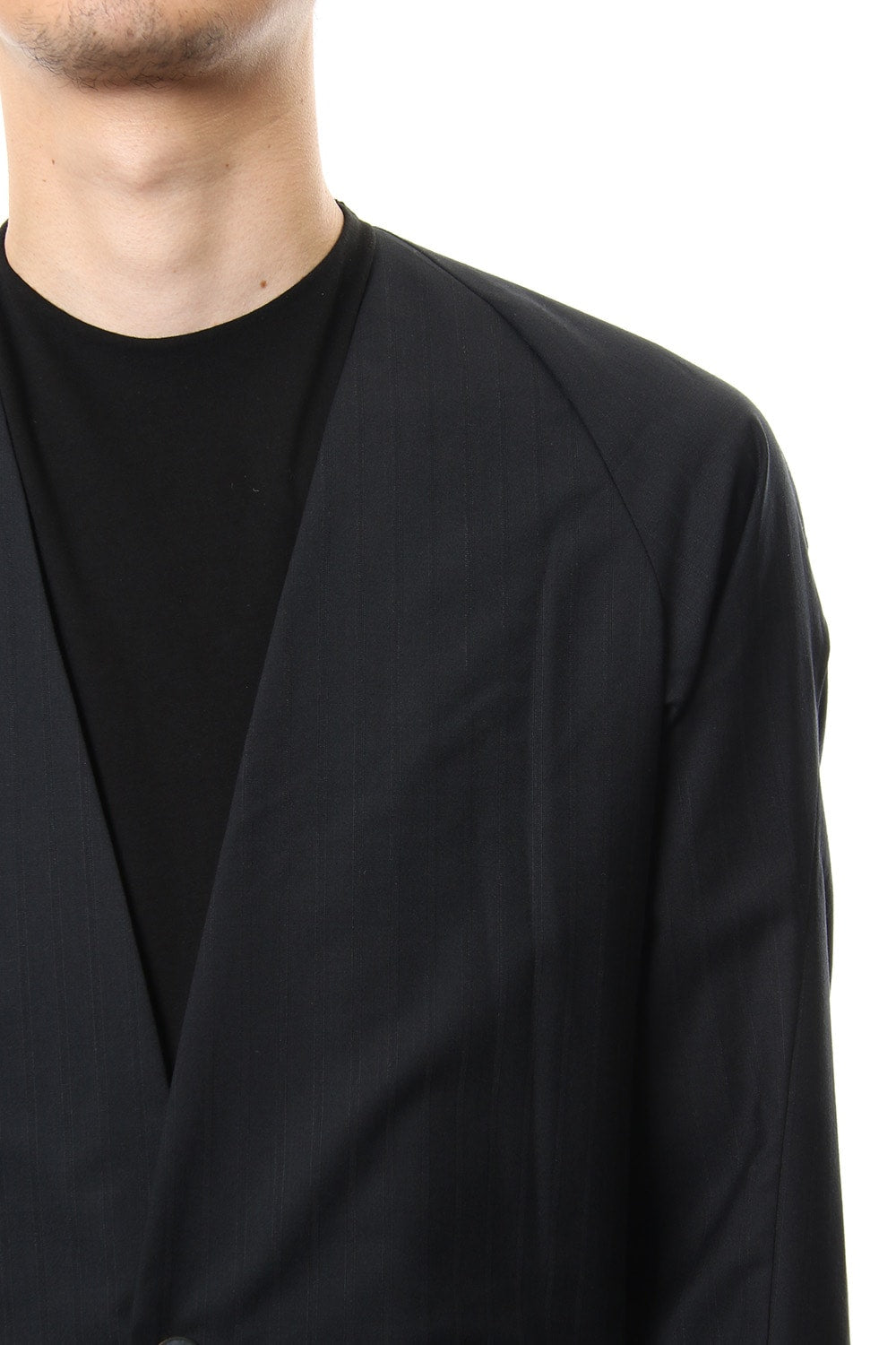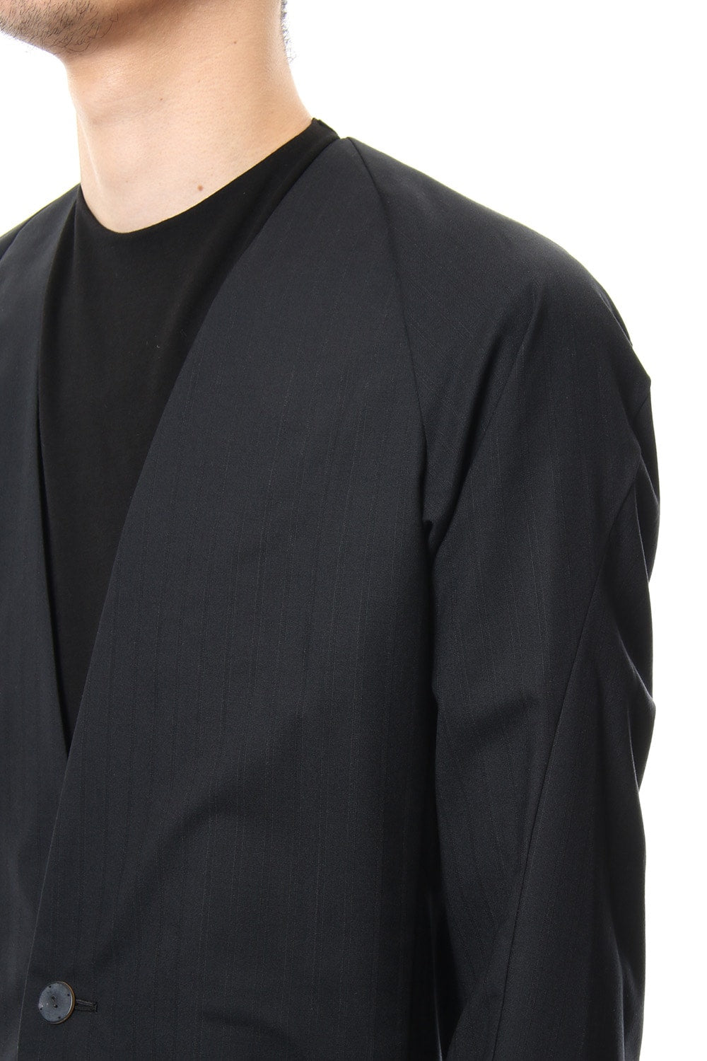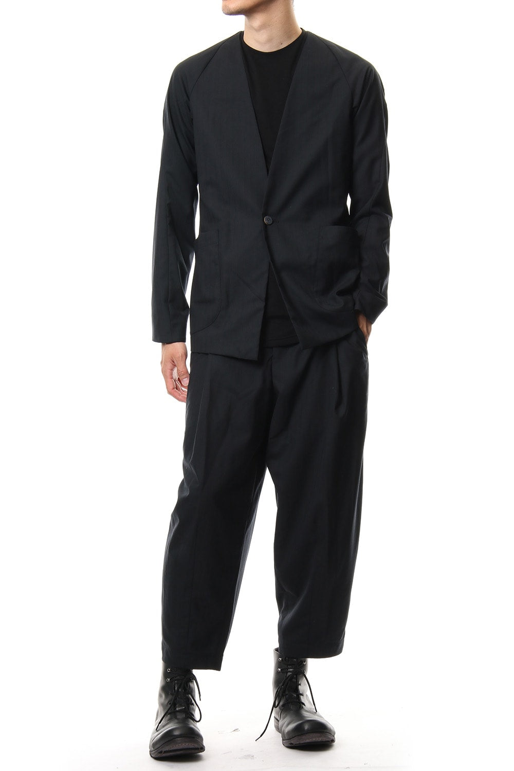 The fabric is processed by two-thread processing of ultra fine yarn of 140 wool with strong twisting of the yarn. The finished is of a natural stretch cloth. Although the shirt coats and jackets can be worn alone, it was made with thin fabrics so that is can be worn and styled layered.