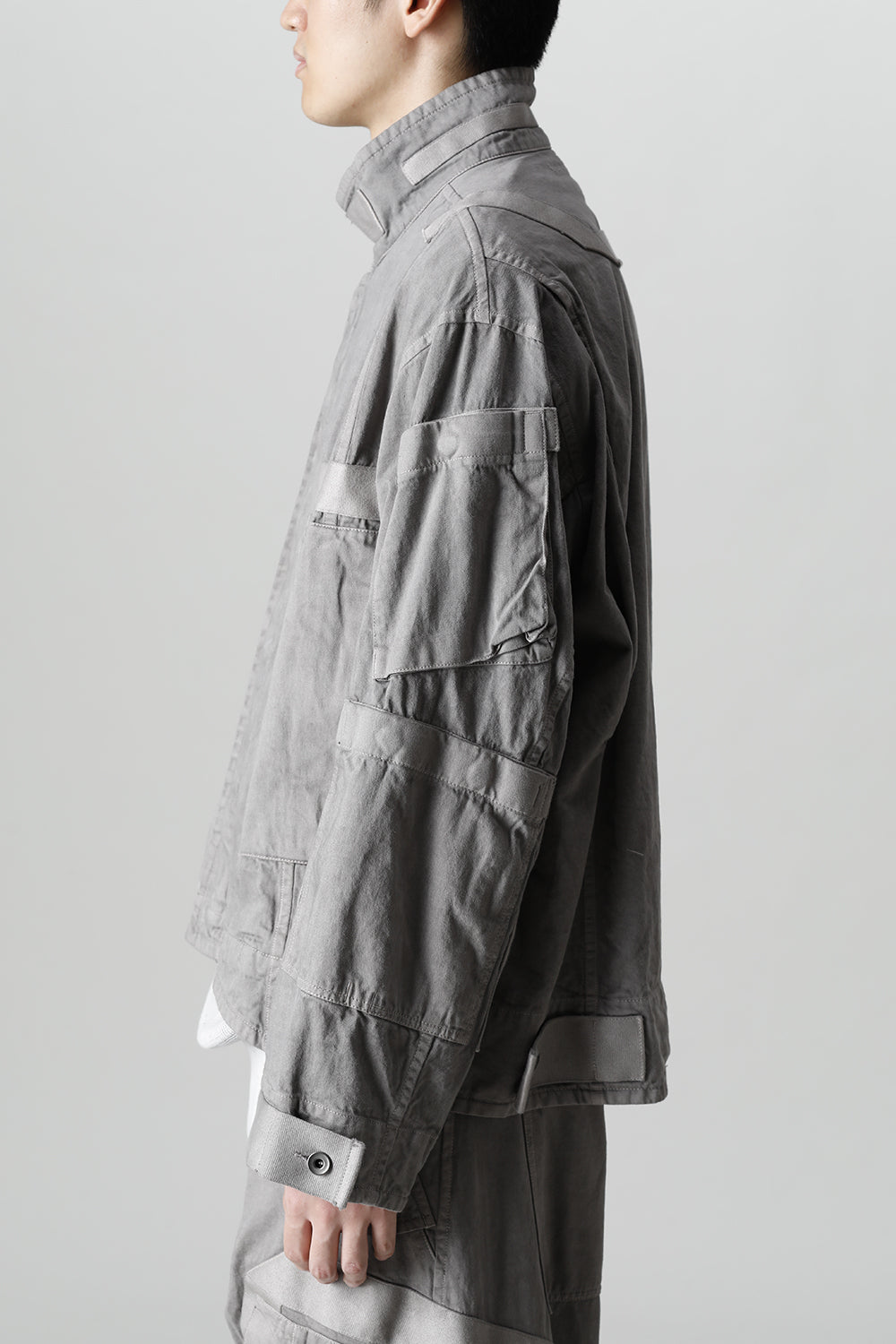 This oversized blouson is characterized by its unique texture, tough texture, and straps designed everywhere.