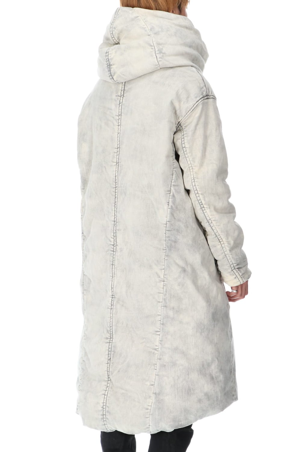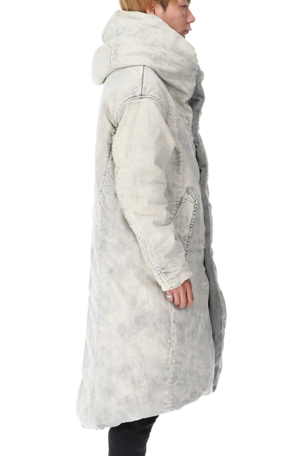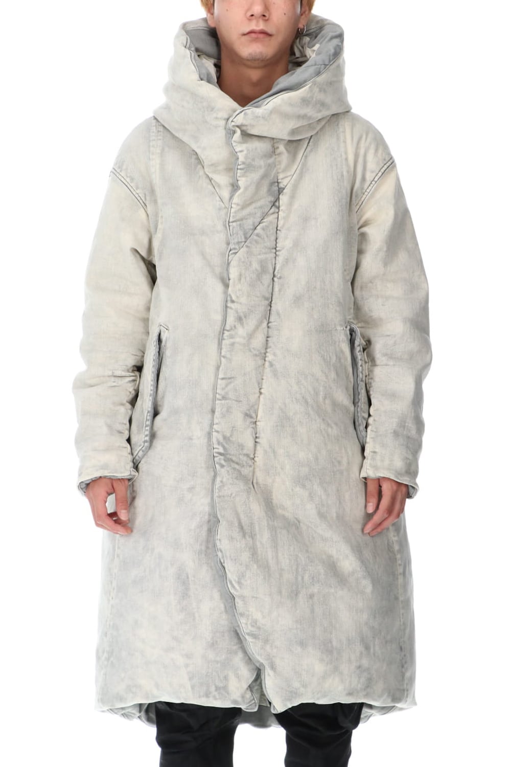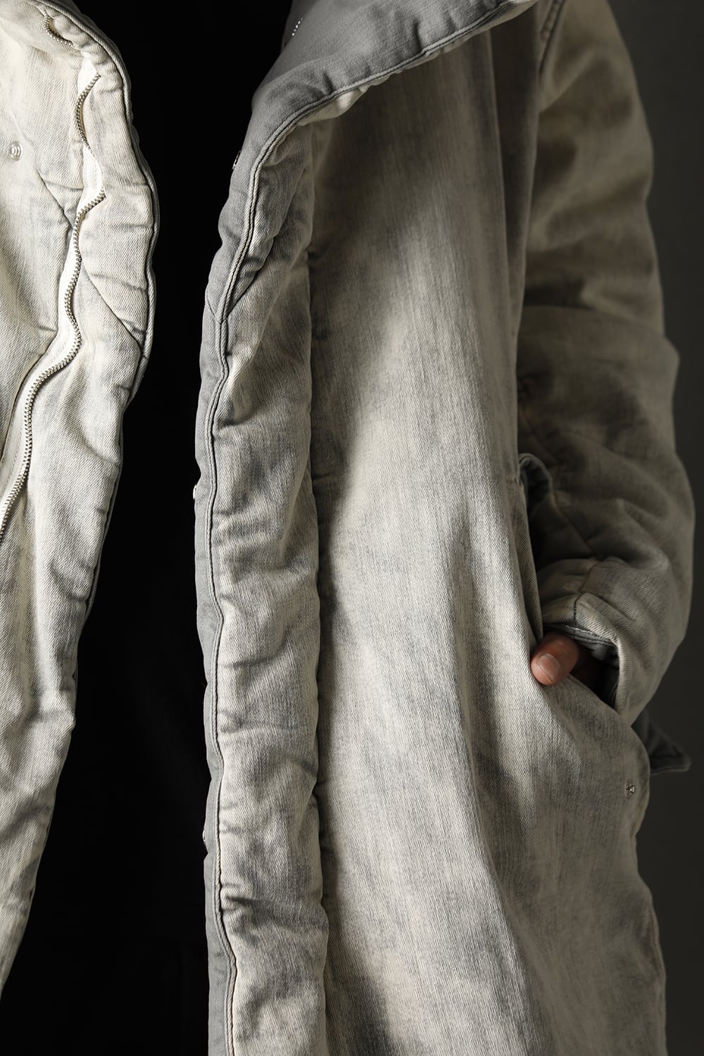 This is a denim hood coat made of stretch denim fabric with a three-layer structure and high strength.