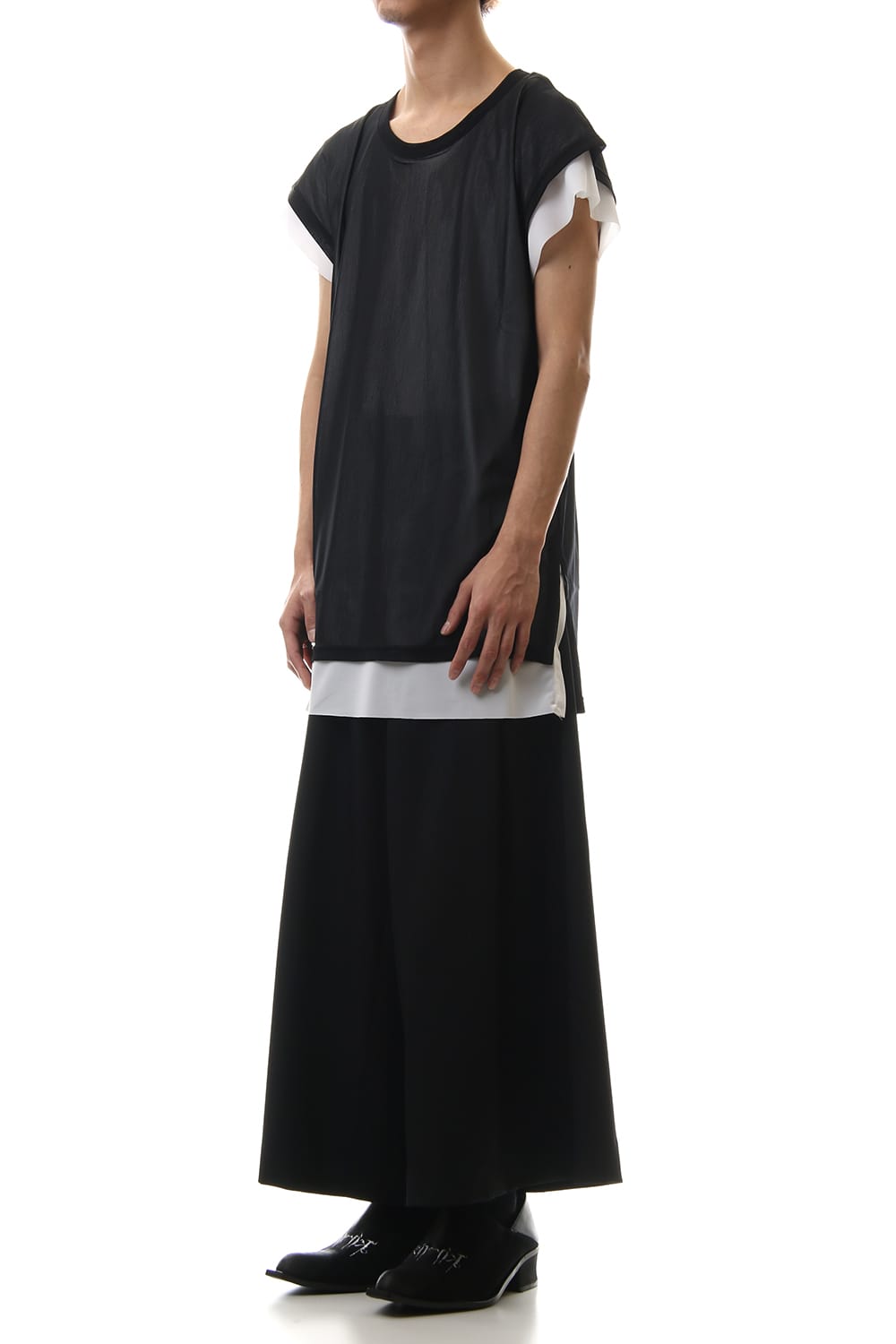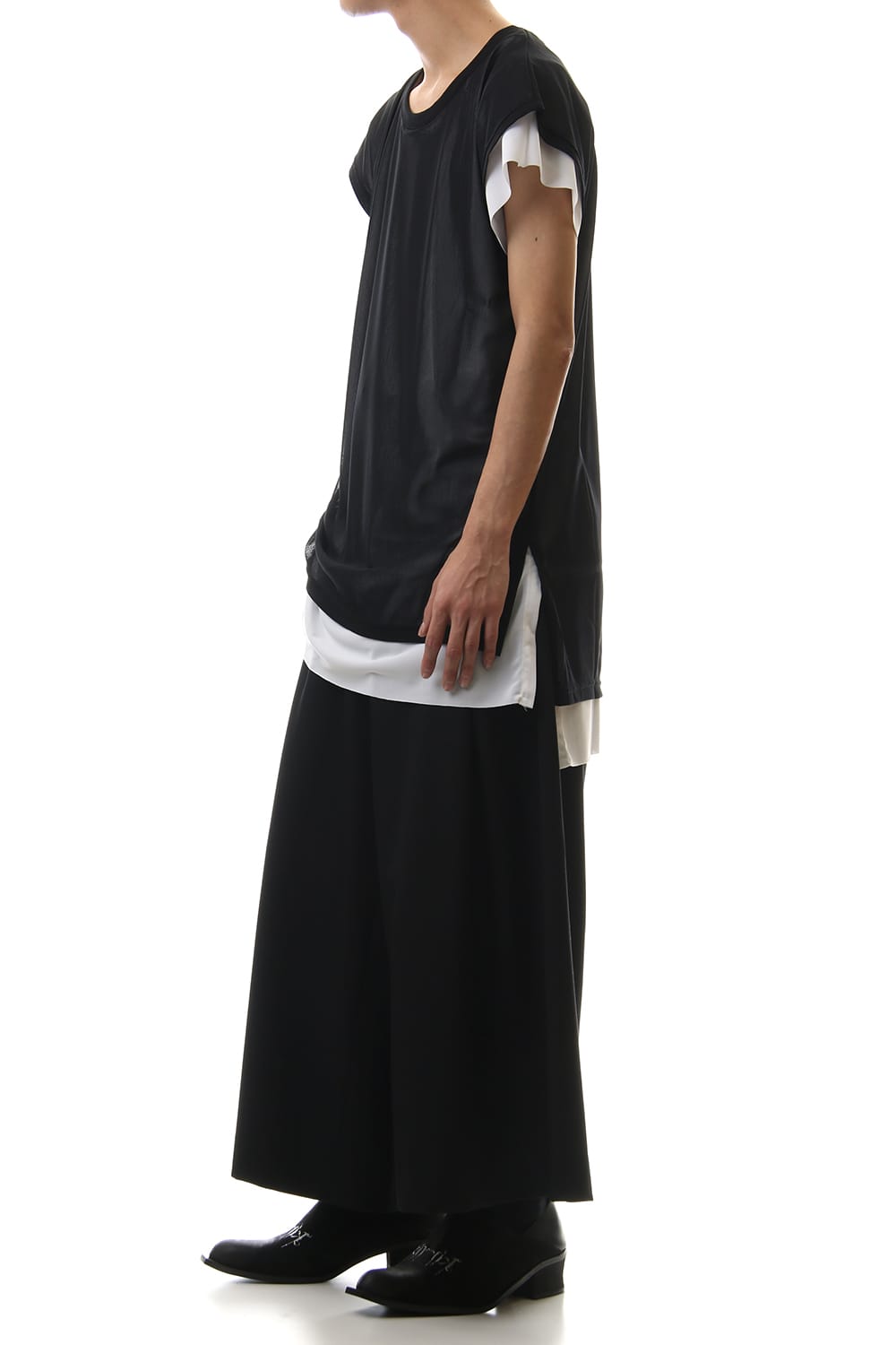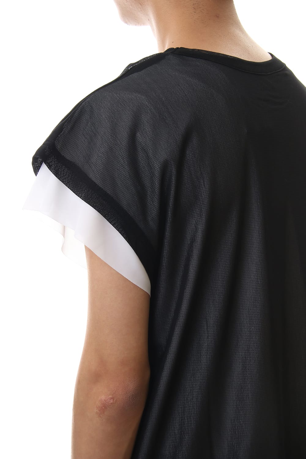 光沢のある素材にシースルー素材をレイヤードしたドロップショルダーカットソー。 ブランドが得意とする美しい作品に仕上がっております。 前後段違いの着丈がアクセントとなり、シンプルな作品でありながら単体でもご着用いただける作品です。