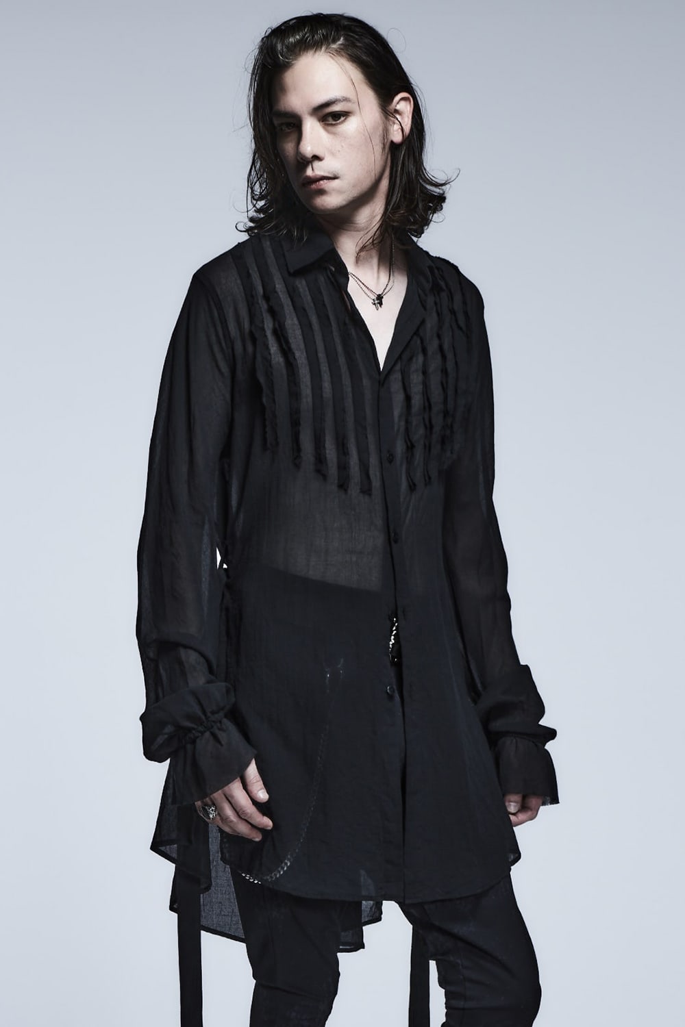 This is a long shirt with a brand-like design with beautiful details on the chest and sleeves.