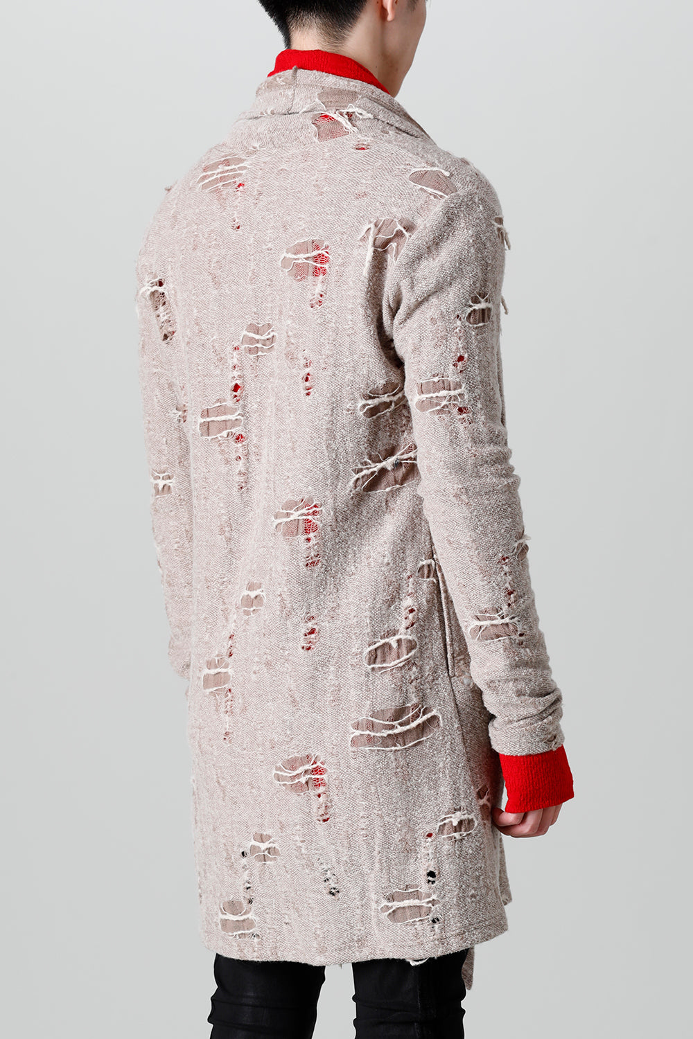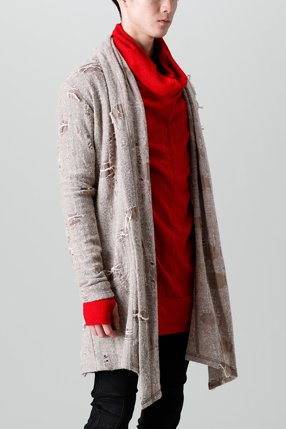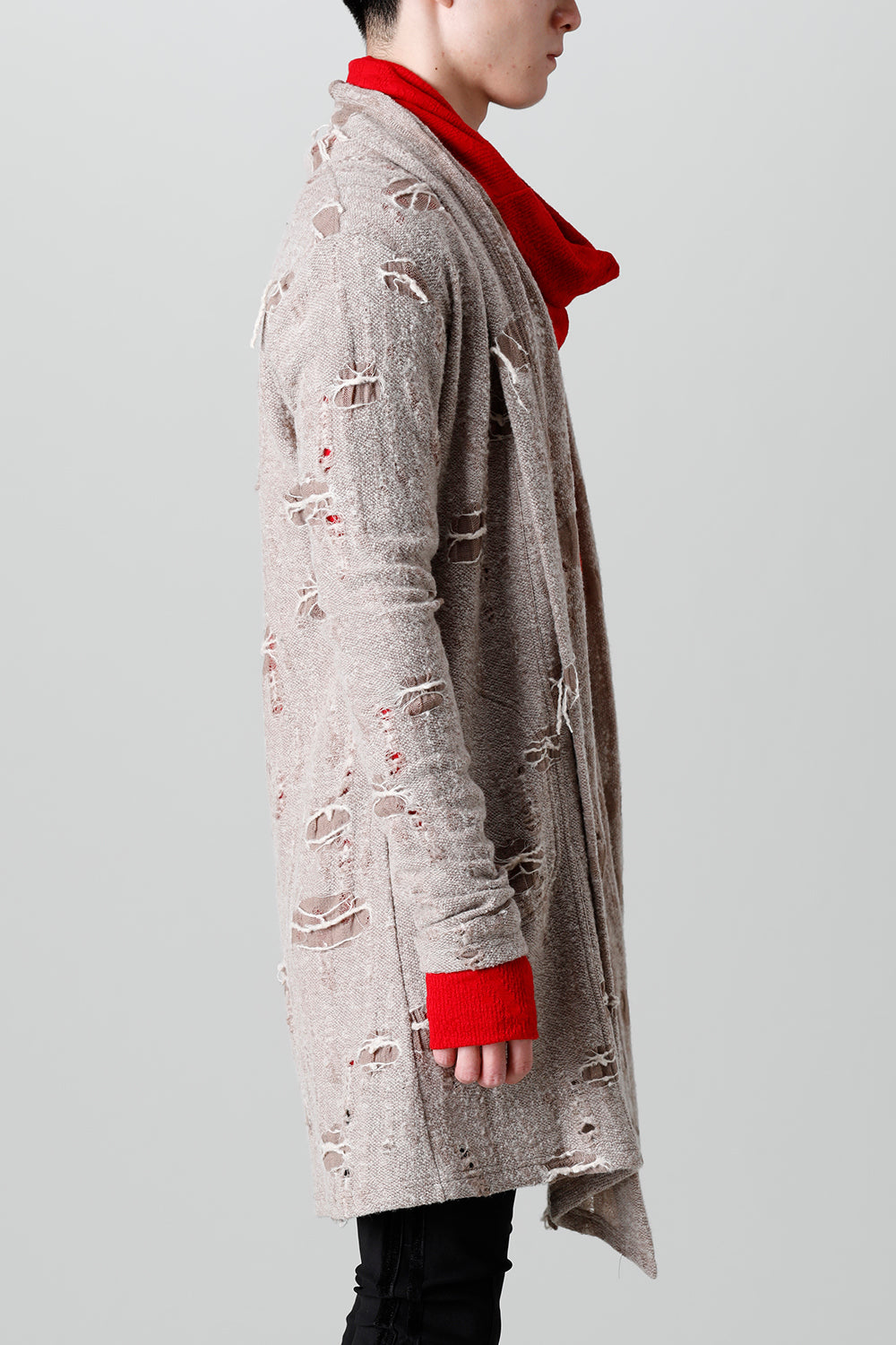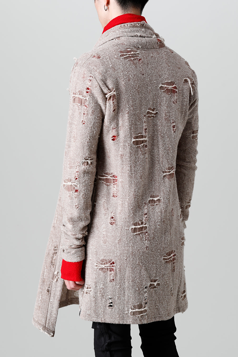 This shawl cardigan is the brand's standard shawl cardigan made of jacquard jersey fabric with damage processing everywhere.