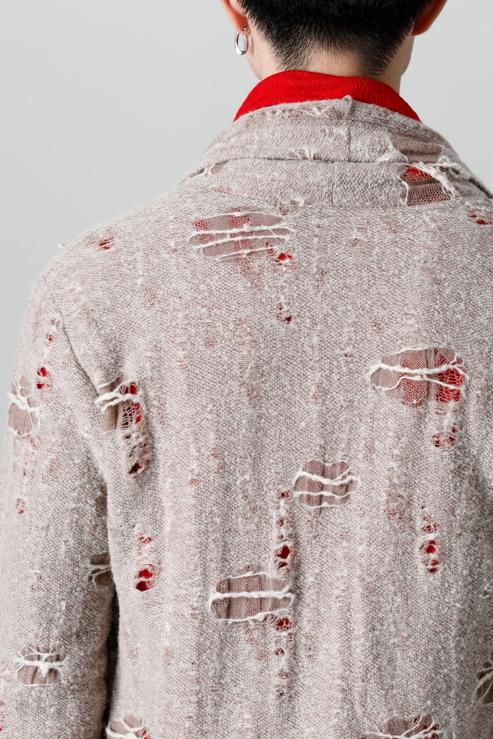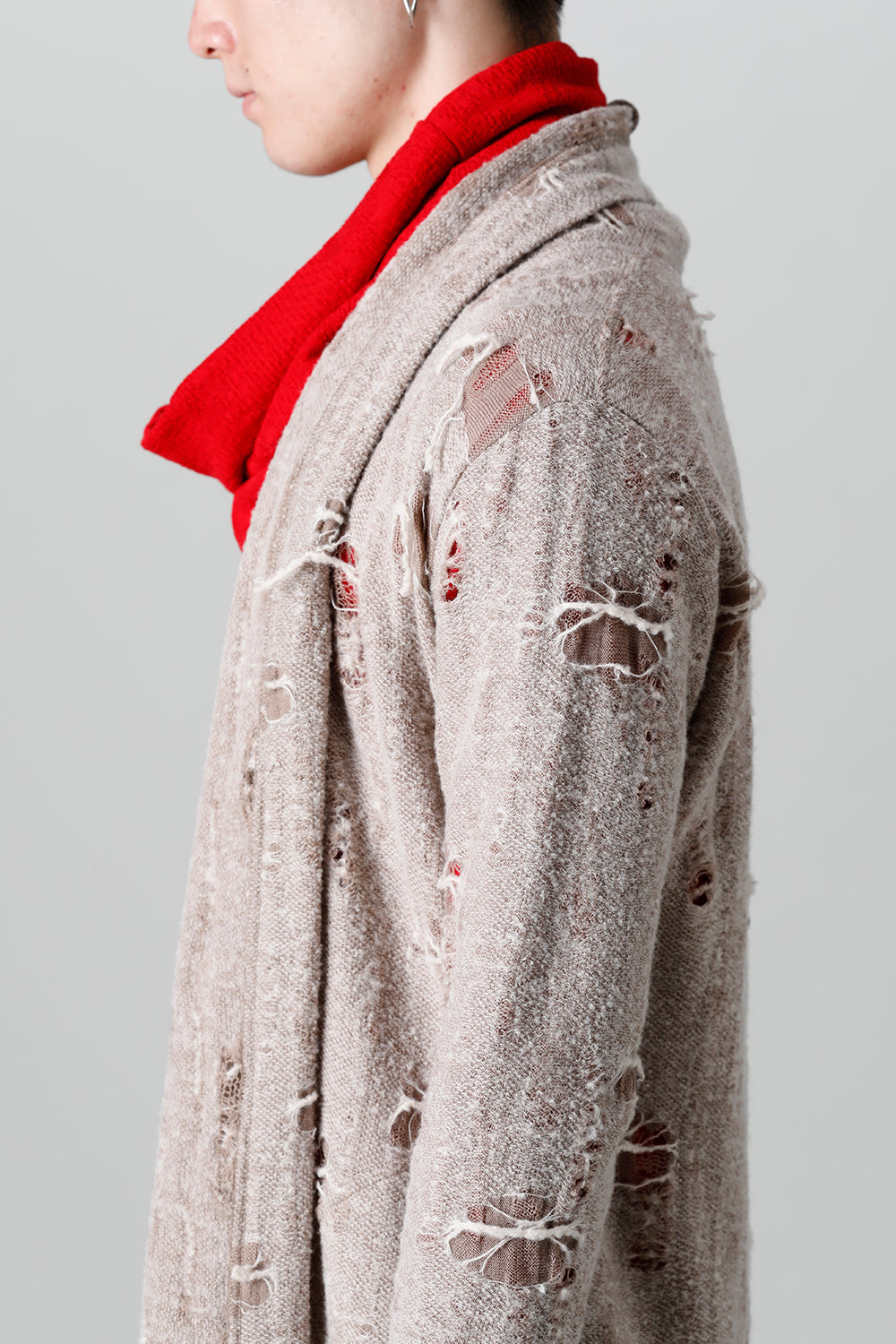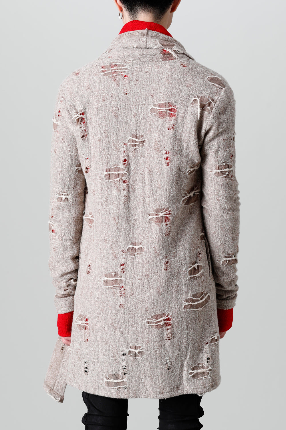 This shawl cardigan is the brand's standard shawl cardigan made of jacquard jersey fabric with damage processing everywhere.