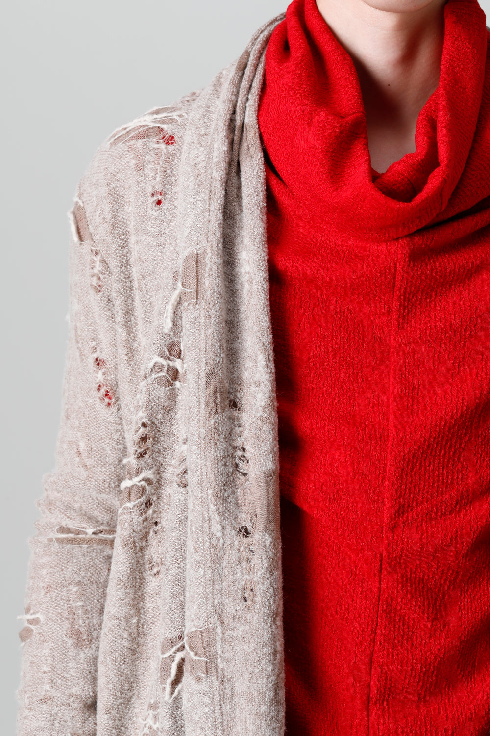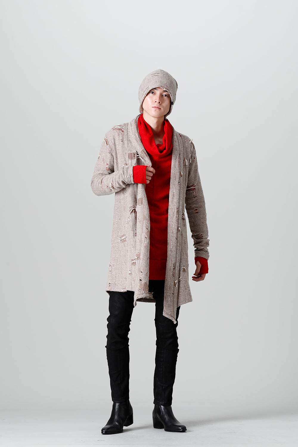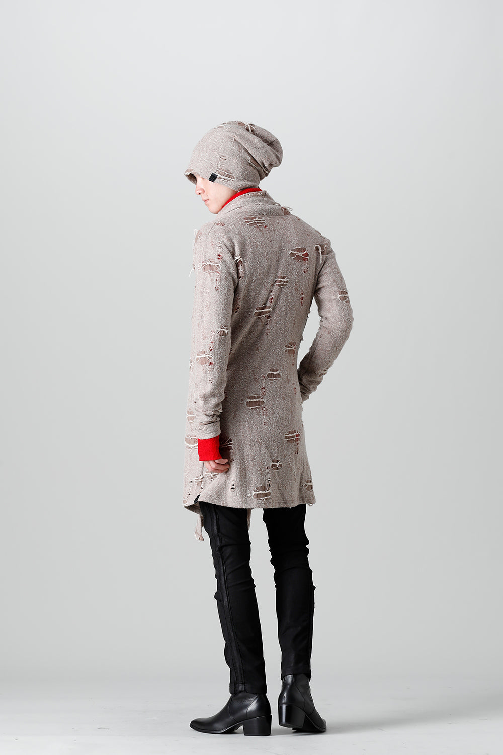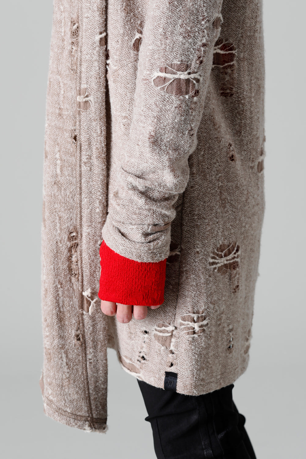 This shawl cardigan is the brand's standard shawl cardigan made of jacquard jersey fabric with damage processing everywhere.